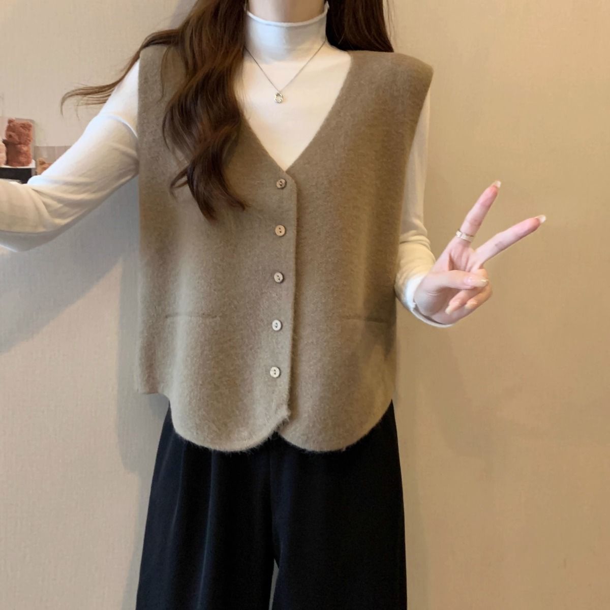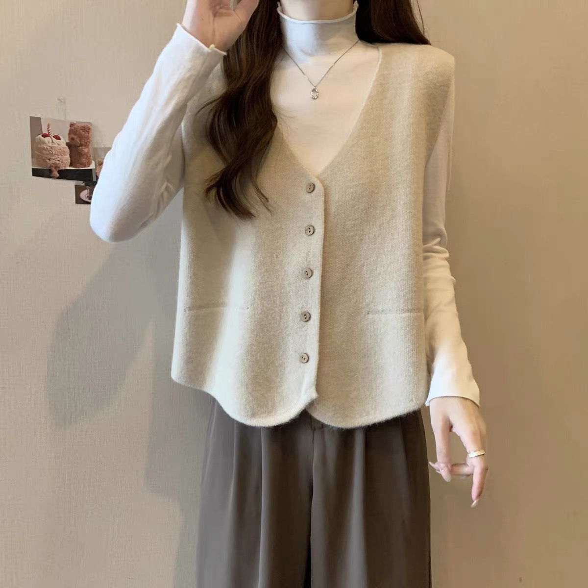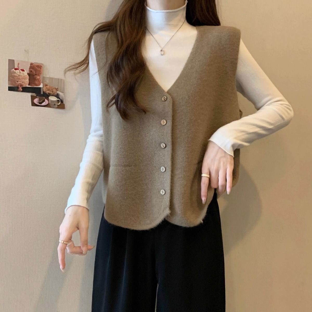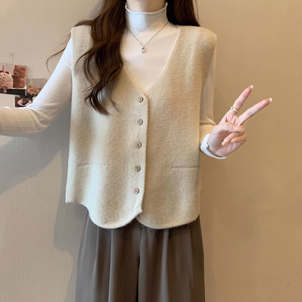 가을 및 겨울 재고 리얼 샷 플러스 사이즈 올 매치 V 넥 스웨터 조끼 소프트 싱글 브레스트 양복 조끼 여성용 탑스토어 가기