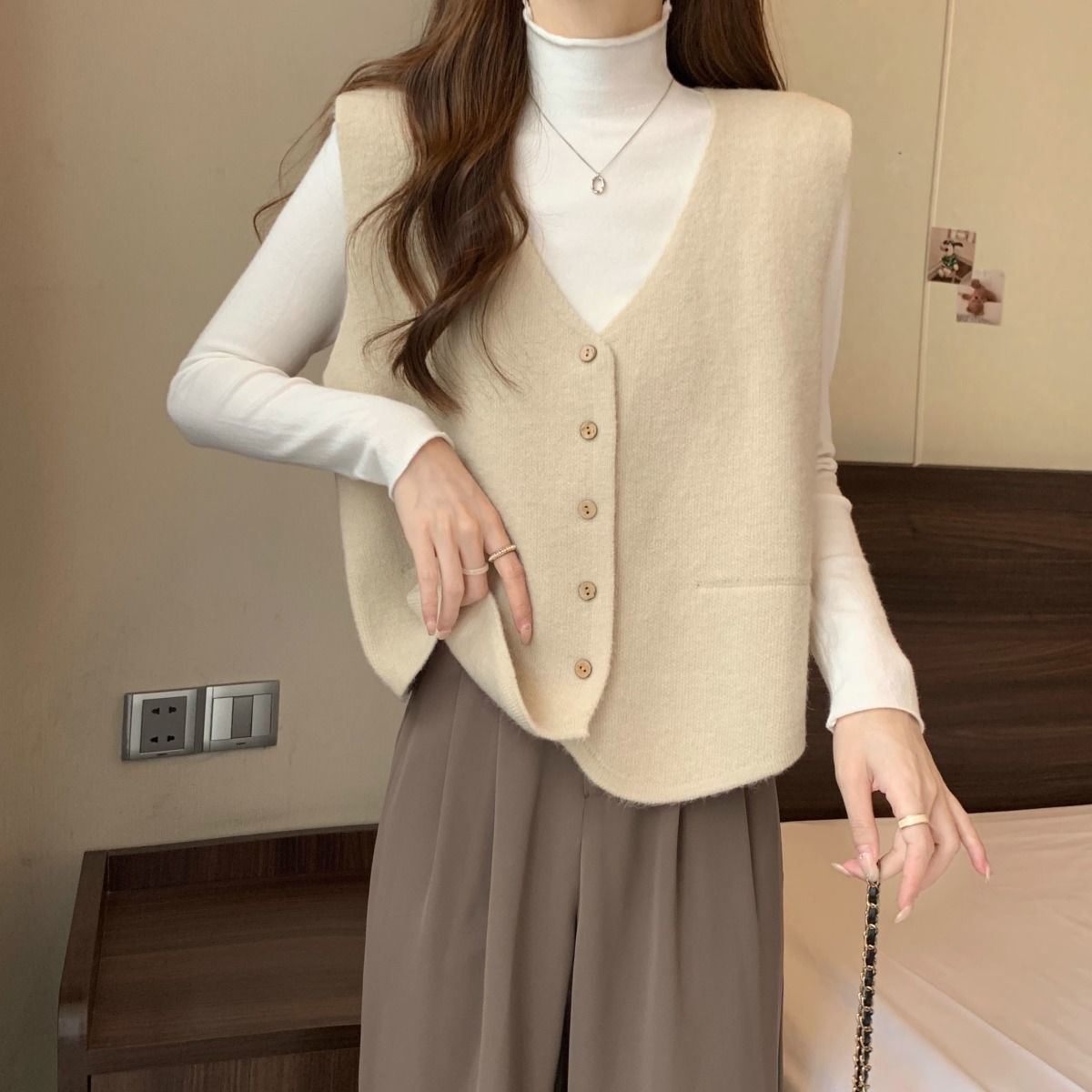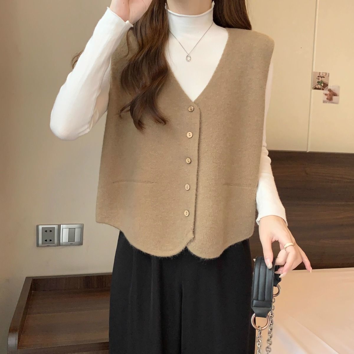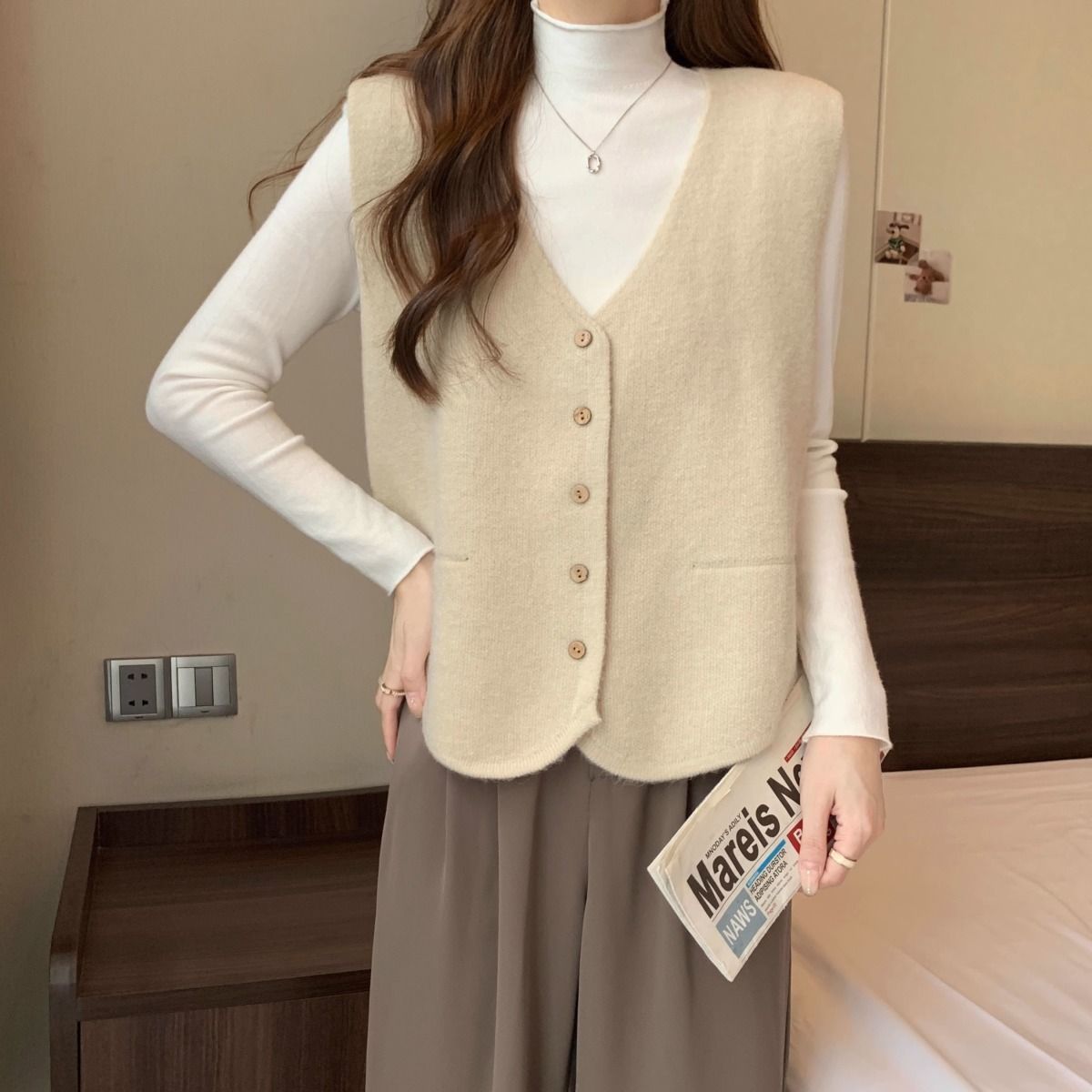 가을 및 겨울 재고 리얼 샷 플러스 사이즈 올 매치 V 넥 스웨터 조끼 소프트 싱글 브레스트 양복 조끼 여성용 탑스토어 가기