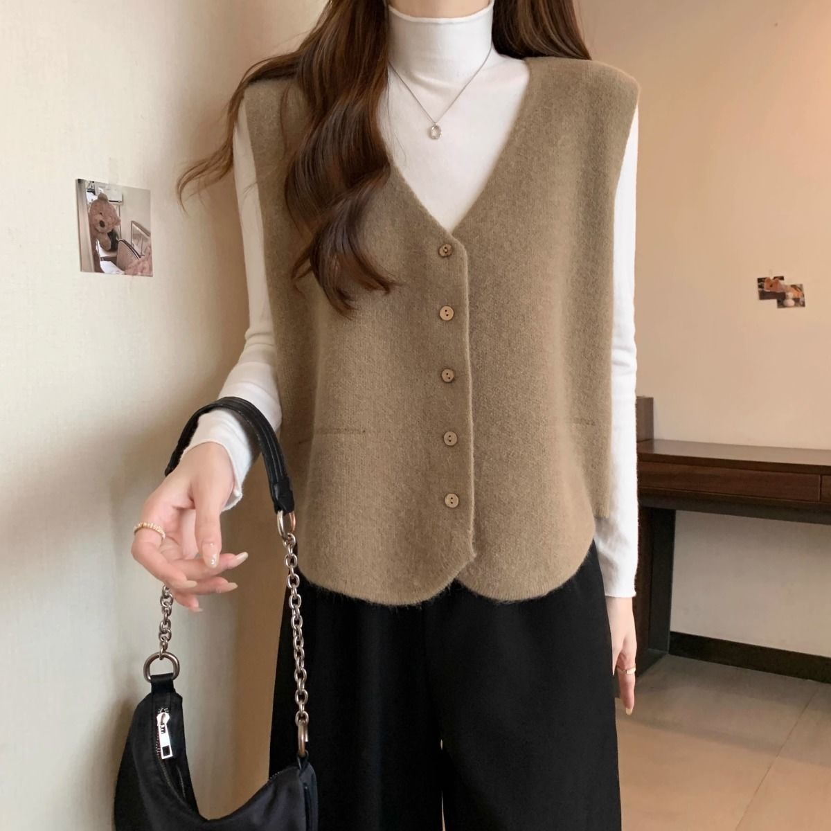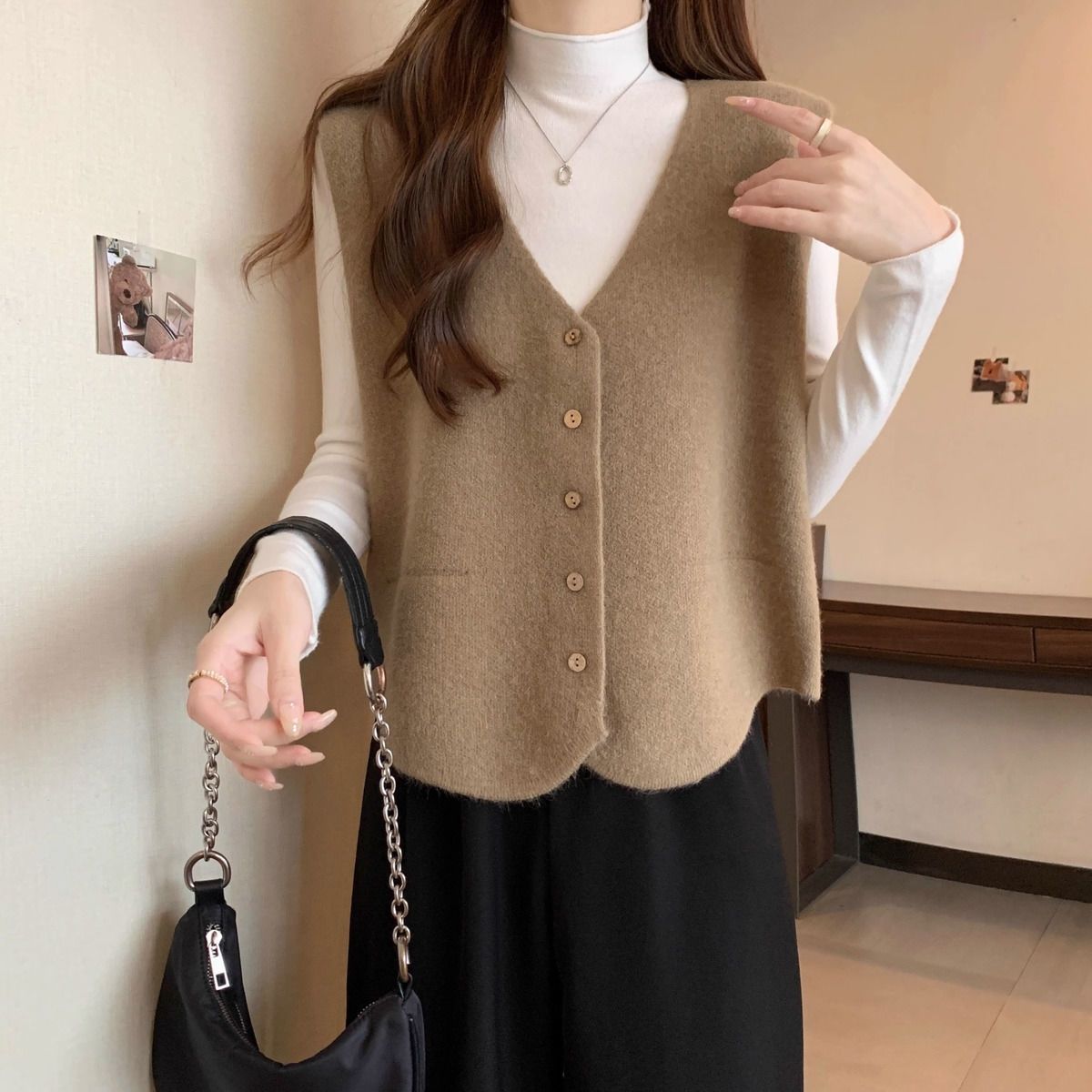 가을 및 겨울 재고 리얼 샷 플러스 사이즈 올 매치 V 넥 스웨터 조끼 소프트 싱글 브레스트 양복 조끼 여성용 탑