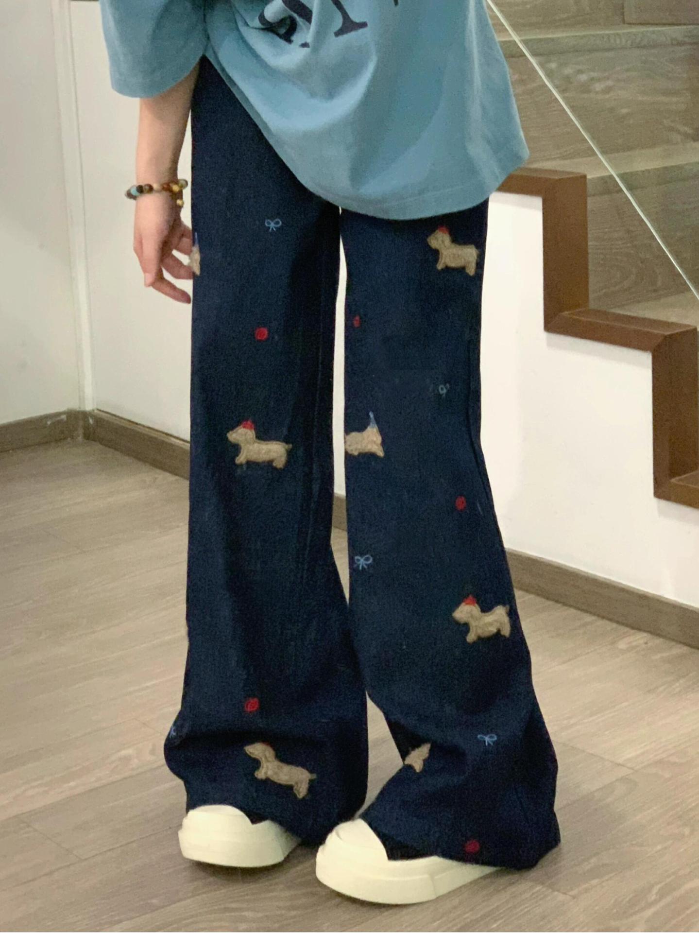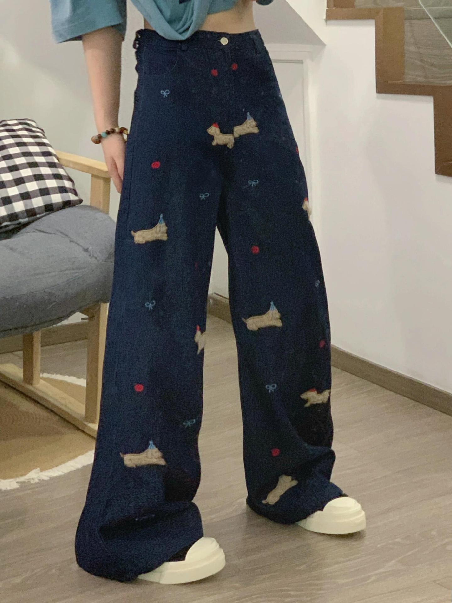 아메리칸 스타일 레트로 창조적 인 만화 높은 허리 청바지 여성의 봄과 가을 느슨한 넓은 다리 디자인 센스 캐주얼 올 매치 트렌디 바지