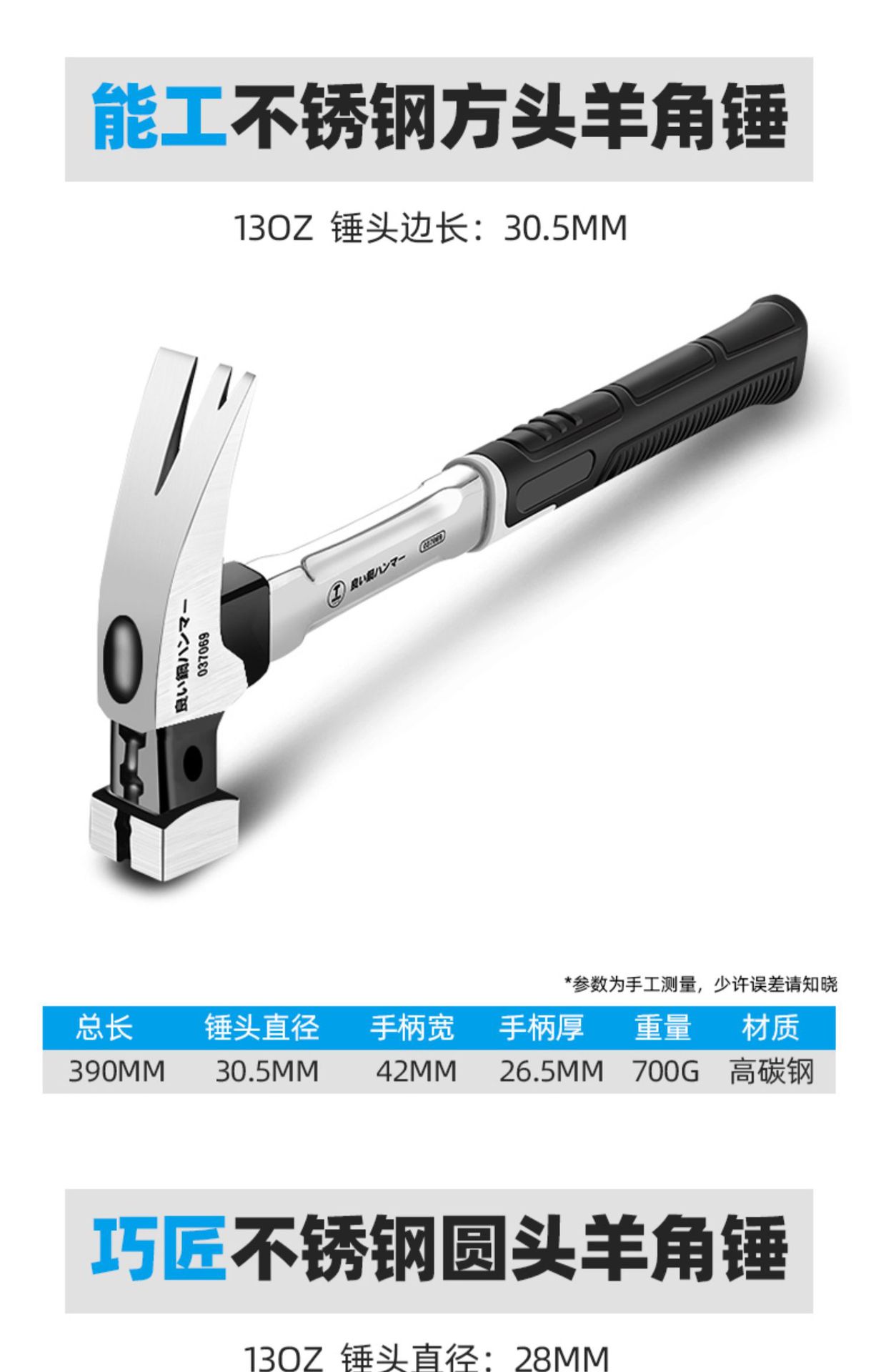 • [자석 치아 표면이 있는 13OZ 사각 헤드] 미끄럼 방지 및 쿠션 처리된 스테인레스 스틸 핸들