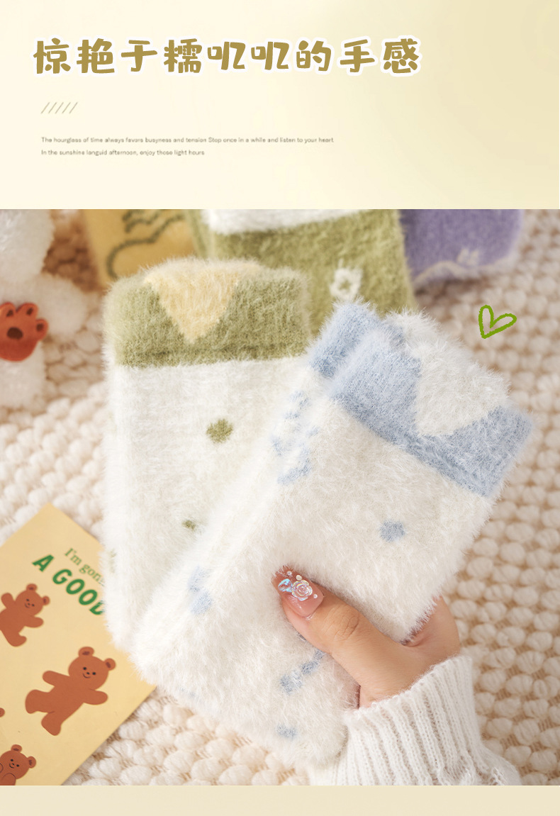 가을, 겨울 수면 양말 귀여운 만화 대학 스타일 밍크 벨벳 중반 송아지 양말 여성 Zhuji 바닥 양말스토어 가기
