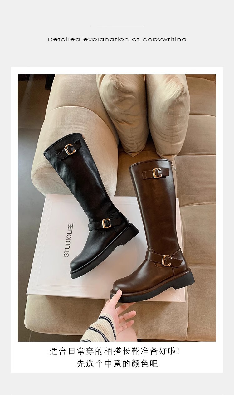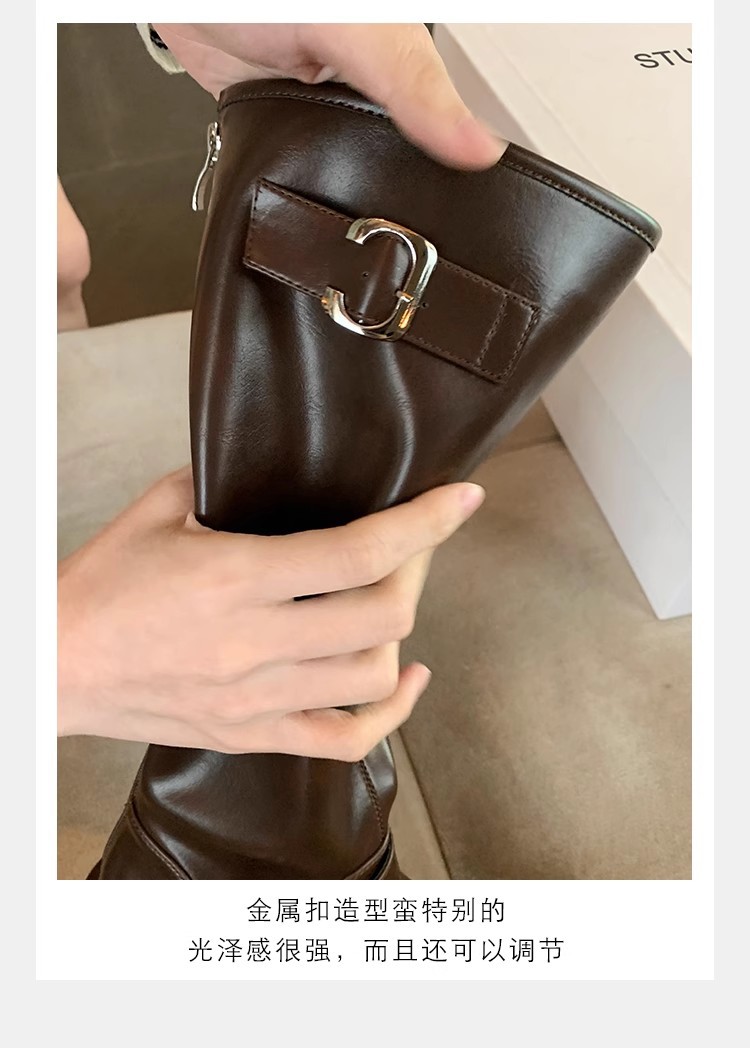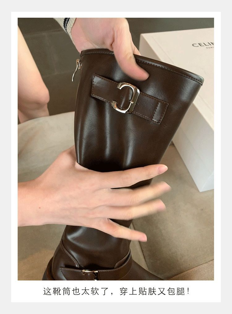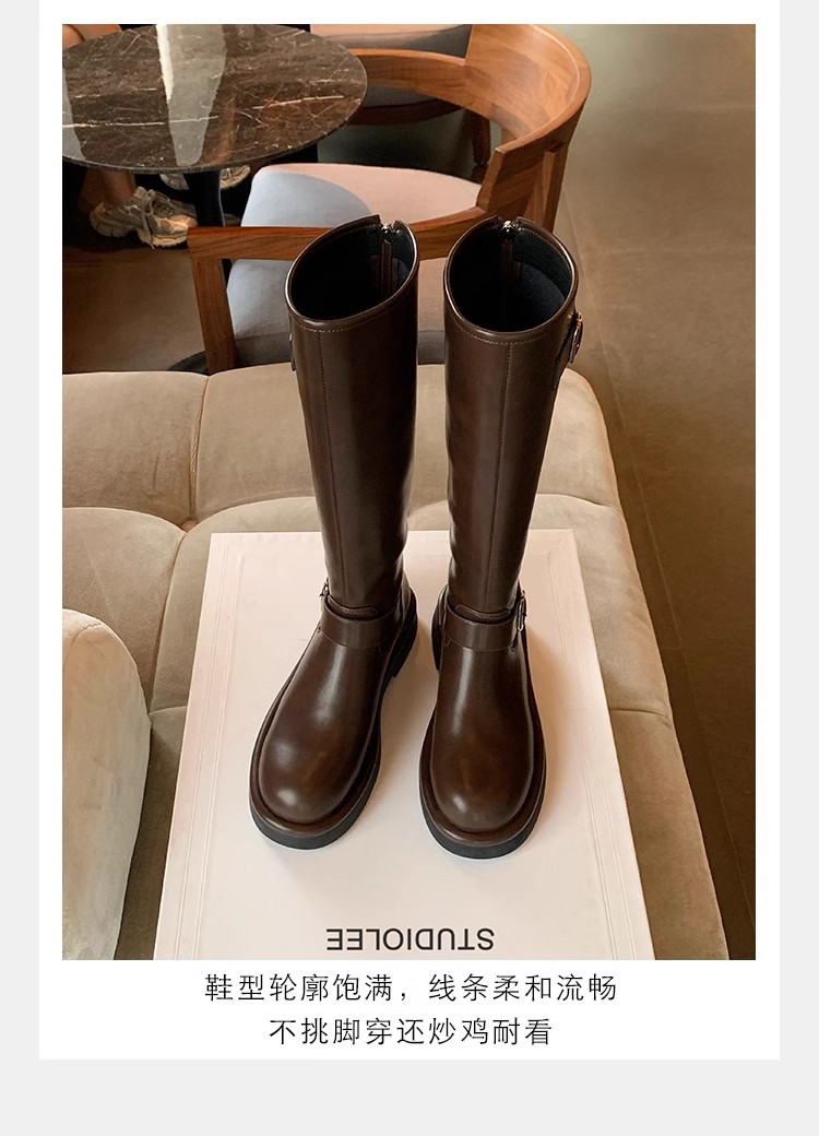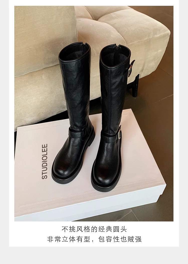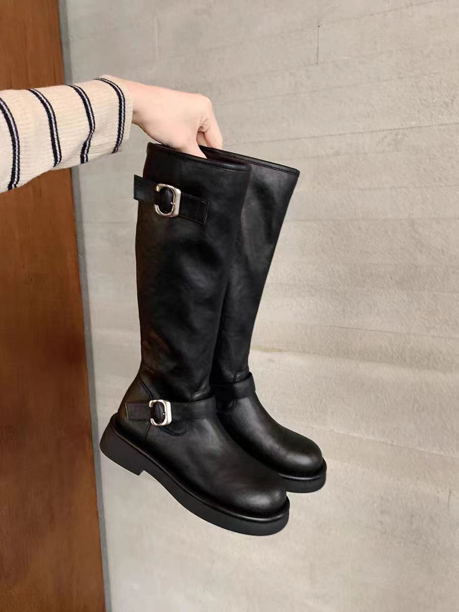 소가죽 버전 2025년 신상품 가을 겨울 레트로 라운드 토 버클 스트랩 두꺼운 굽 무릎 위까지 오는 롱부츠 여성용 나이트 부츠스토어 가기