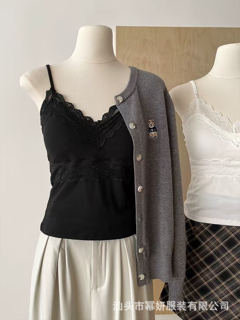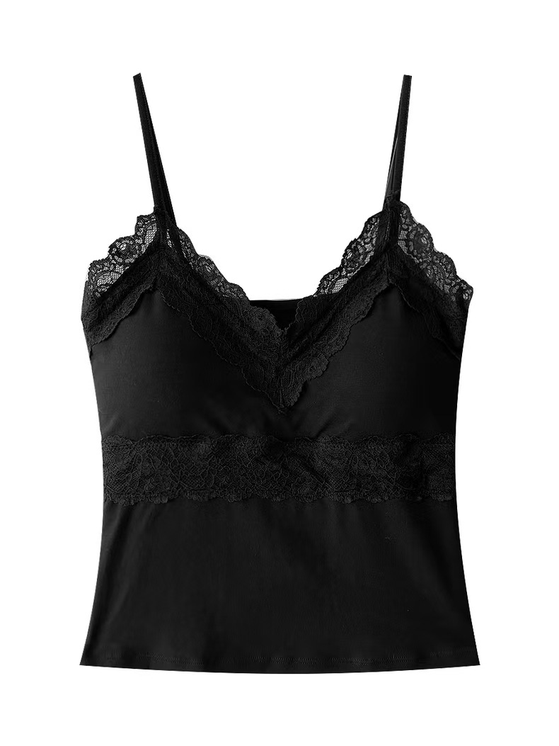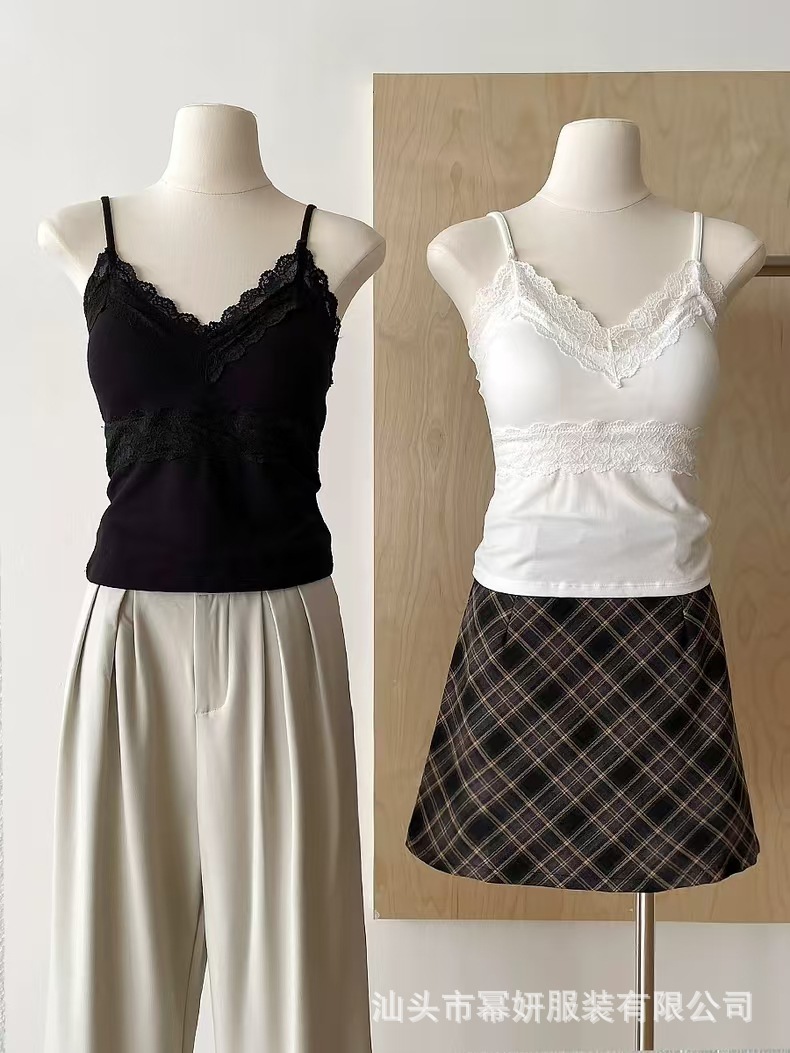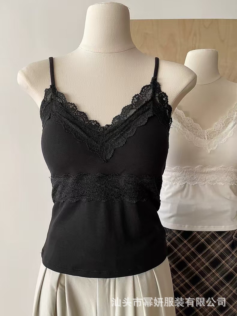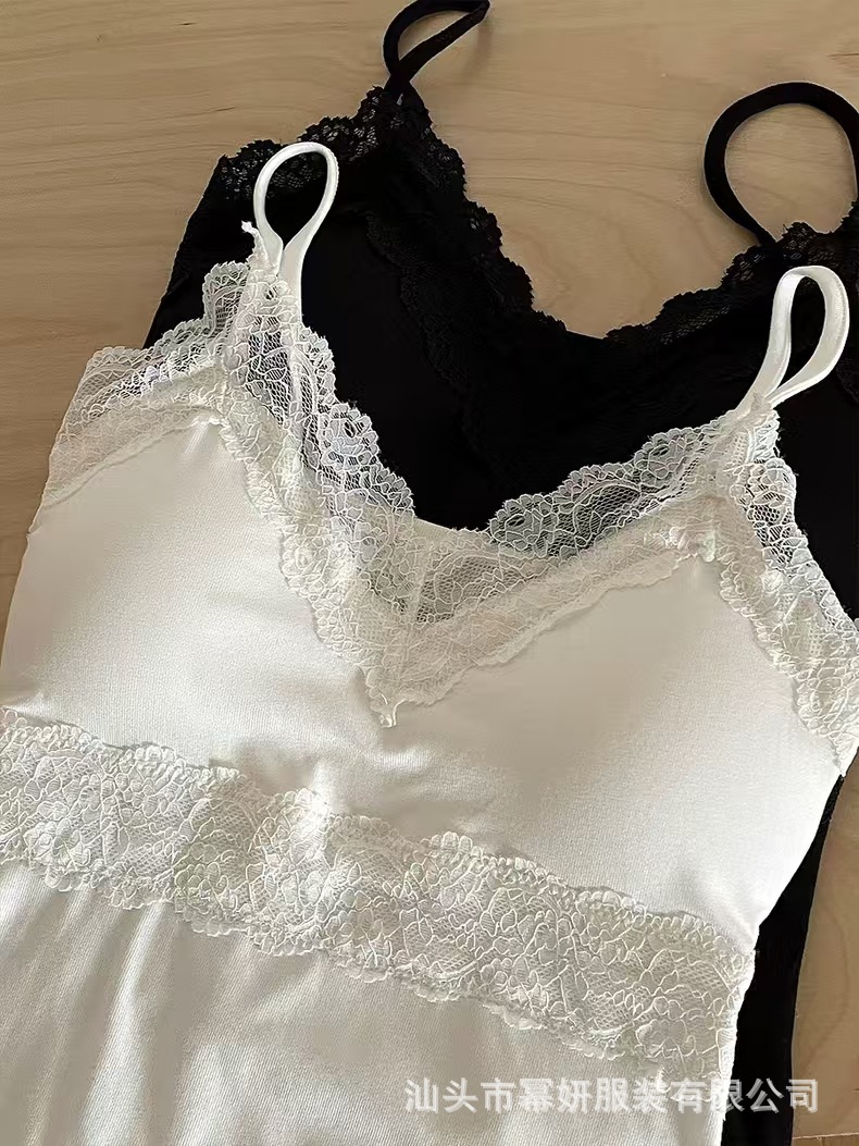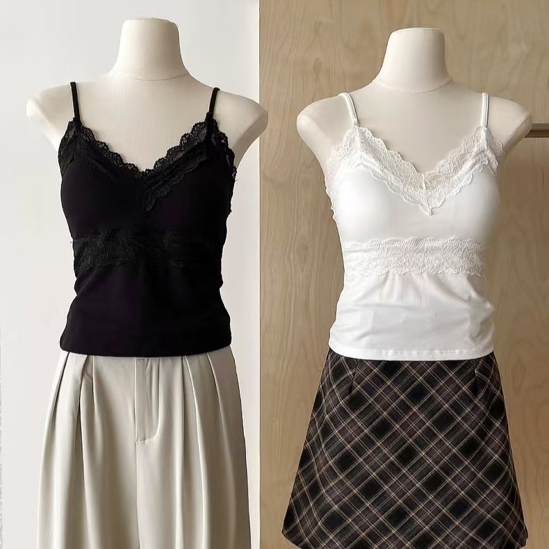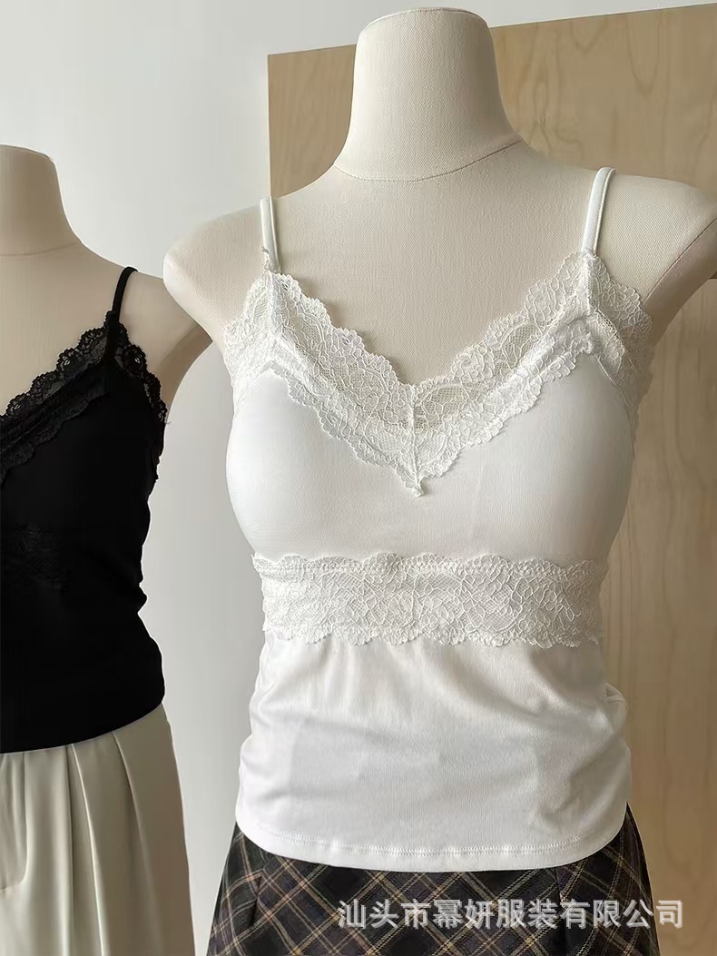 봄여름 빅 브이넥 레이스 트림 여성용 민소매 탑, 가슴 패드 내장, 브라 필요 없음, 순수하고 섹시한 민소매 상의스토어 가기