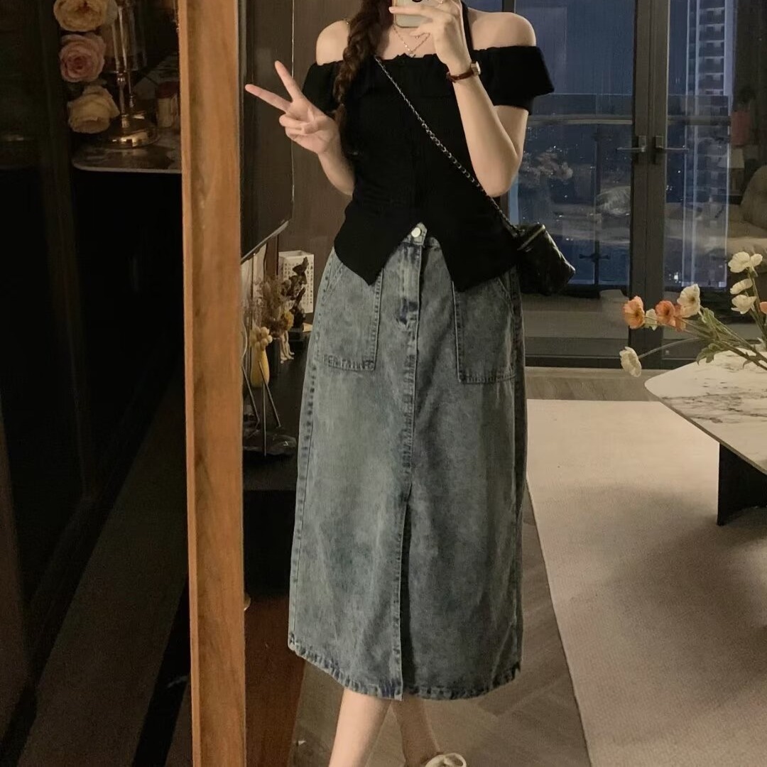 대형 치마 어린이 봄과 가을 통통녀 데님 고민 슬릿 오버 스커트 2024 새로운 짧은 치마 여성 가을 패션 브랜드스토어 가기