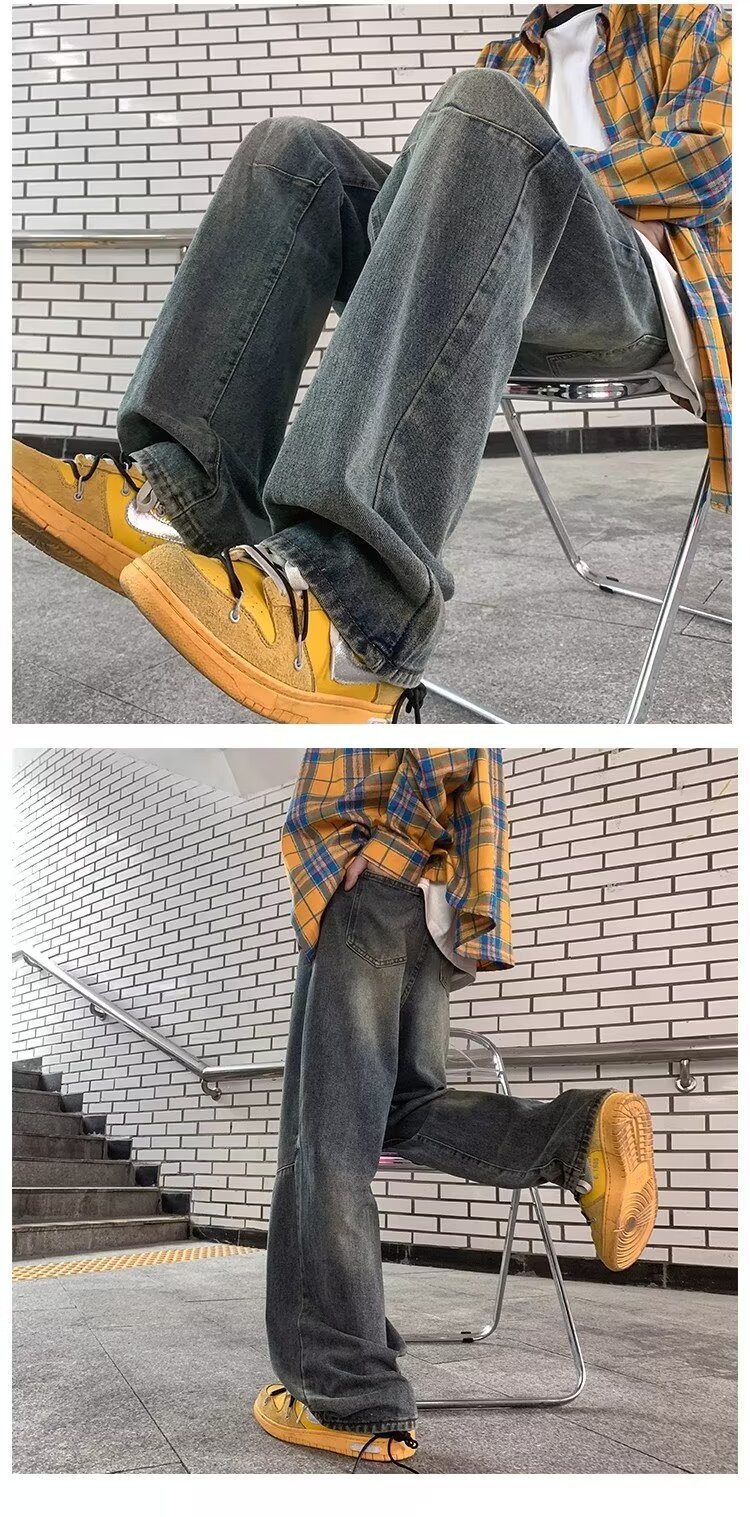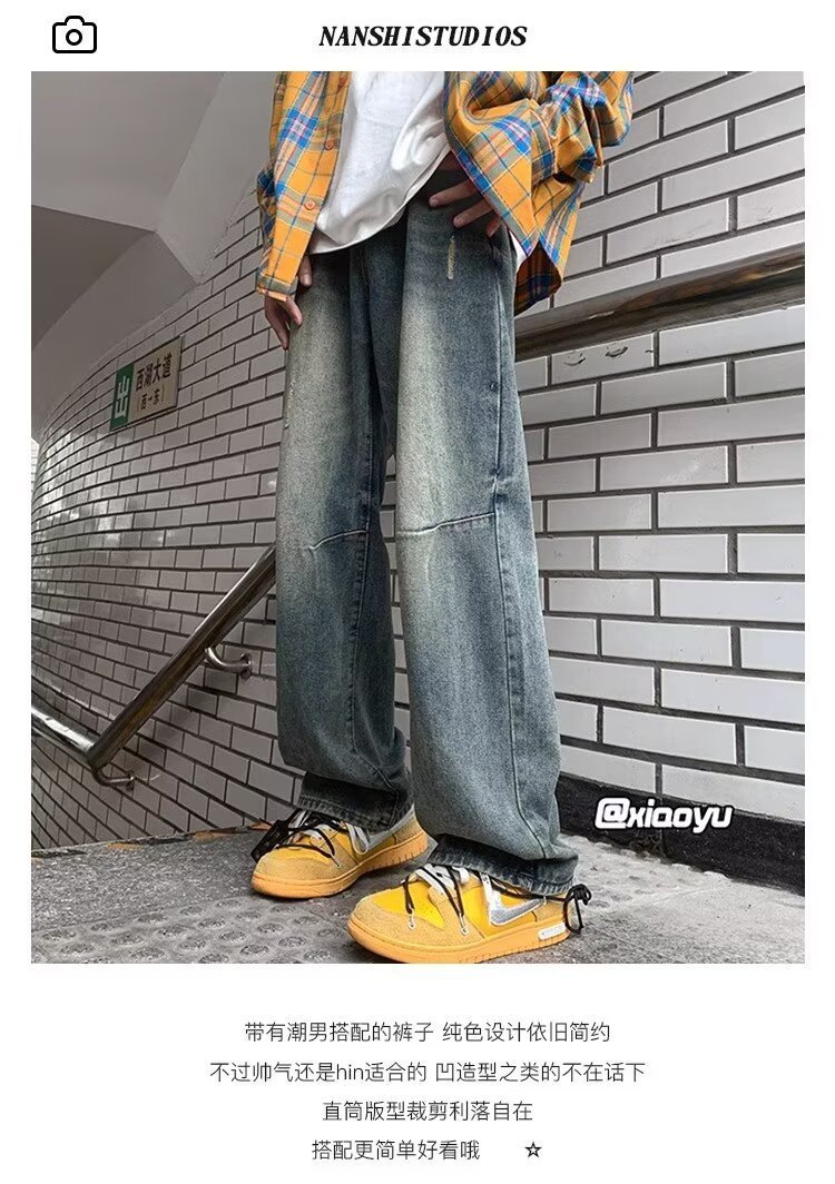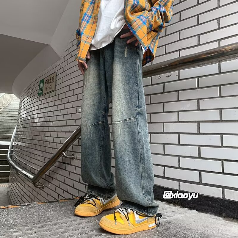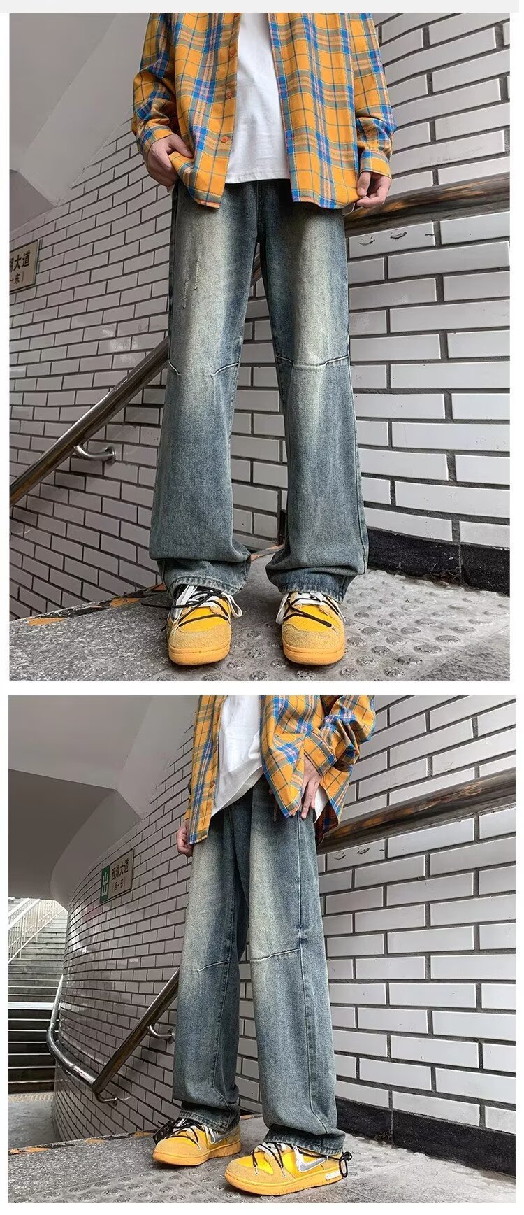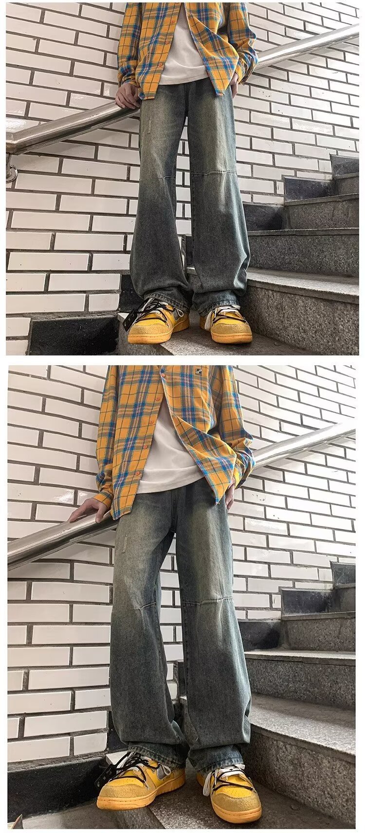 세탁 된 청바지 남성 여름 미국 스타일 레트로 오래된 스티칭 틈새 디자인 센스 느슨한 넓은 다리 캐주얼 긴 바지스토어 가기