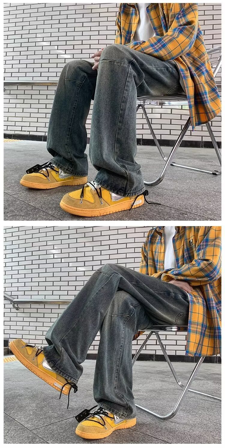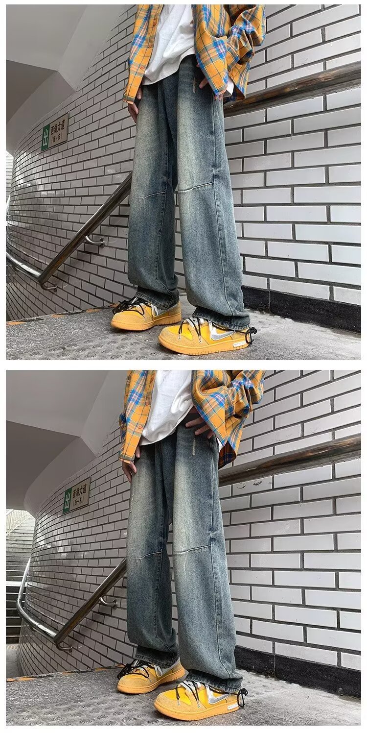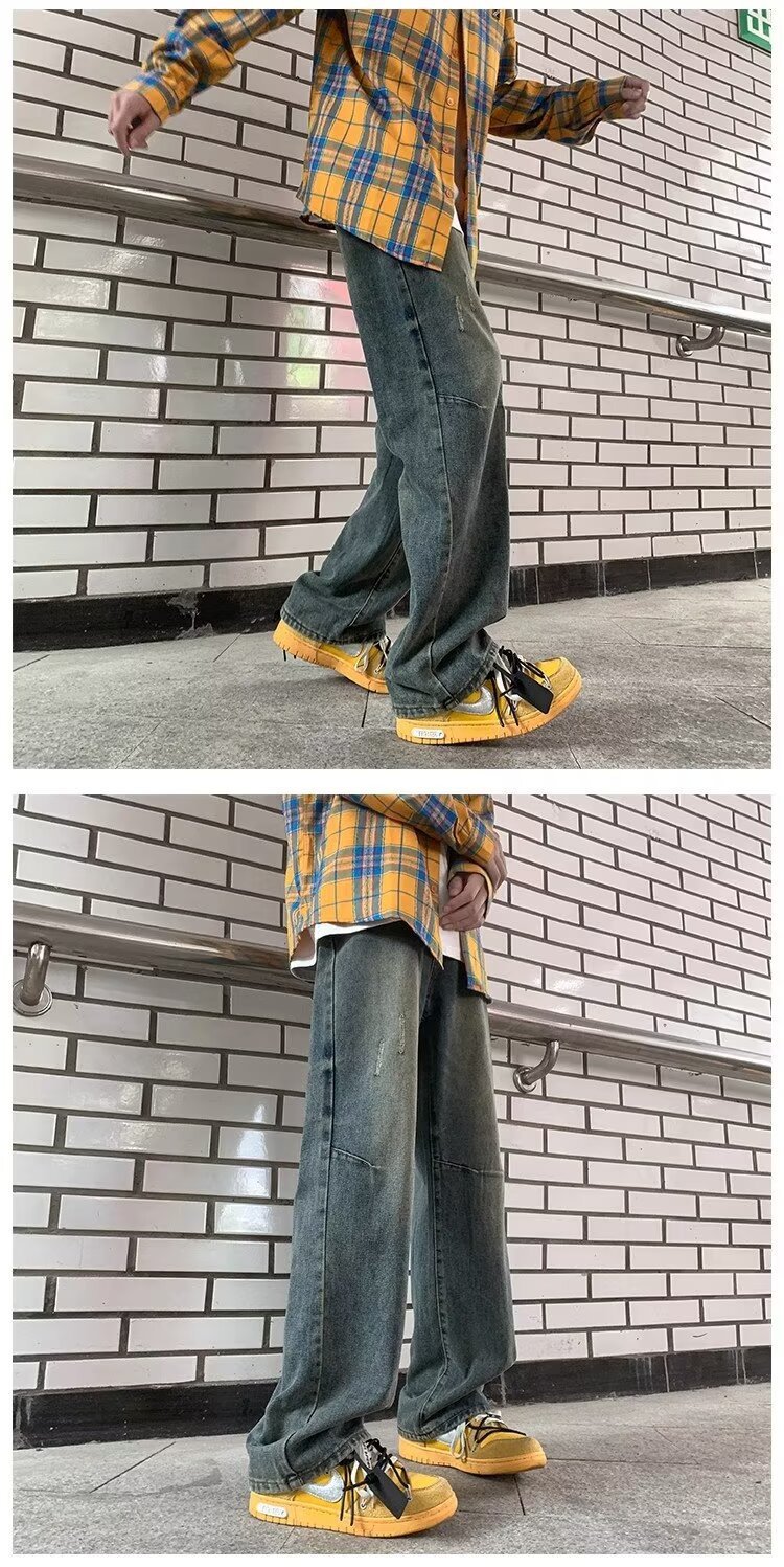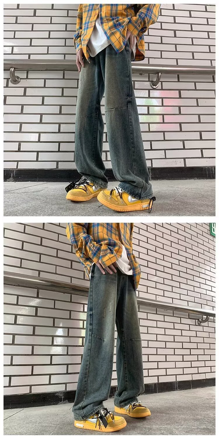 세탁 된 청바지 남성 여름 미국 스타일 레트로 오래된 스티칭 틈새 디자인 센스 느슨한 넓은 다리 캐주얼 긴 바지스토어 가기