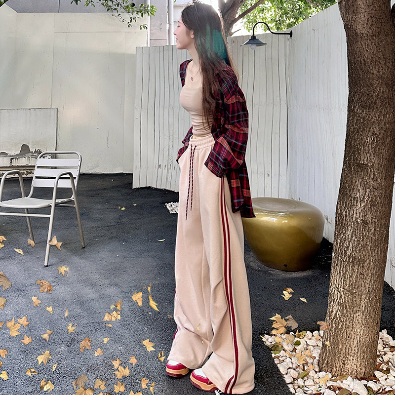 두 개의 바 넓은 다리 바지 미국 스포츠 병렬 바 레드 스트레이트 바지 여성 포켓 가을과 겨울 캐주얼 높은 허리