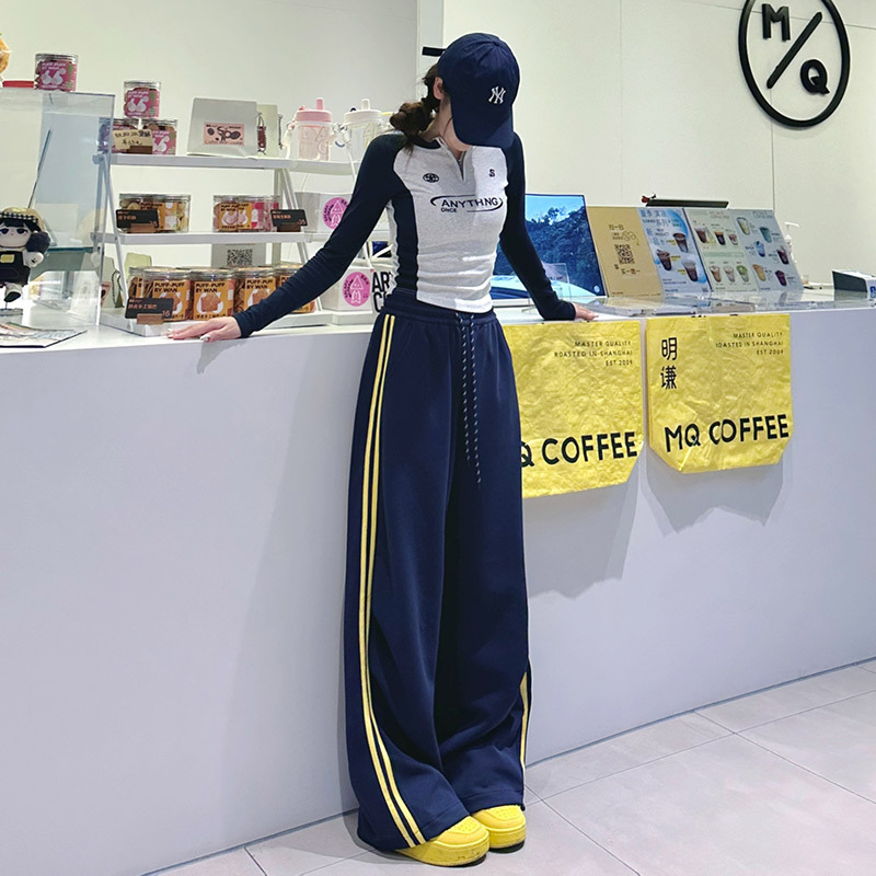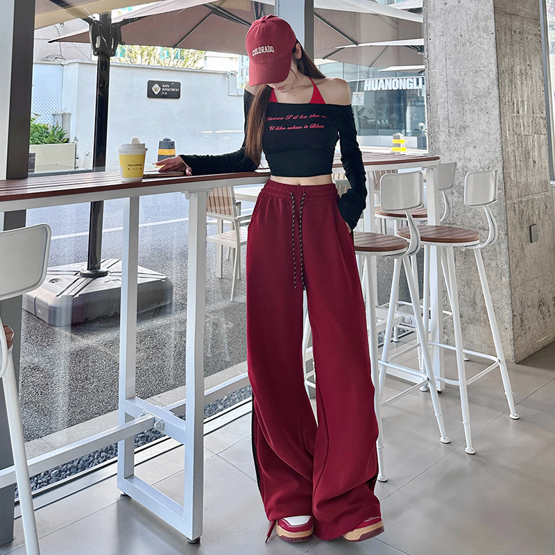 두 개의 바 넓은 다리 바지 미국 스포츠 병렬 바 레드 스트레이트 바지 여성 포켓 가을과 겨울 캐주얼 높은 허리스토어 가기