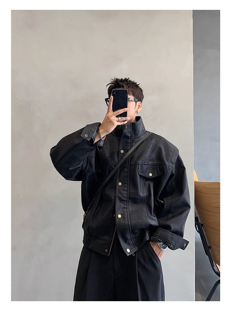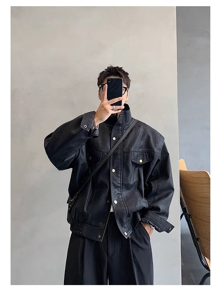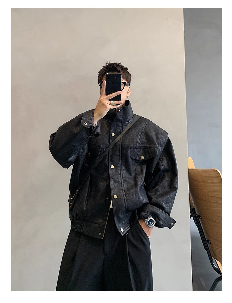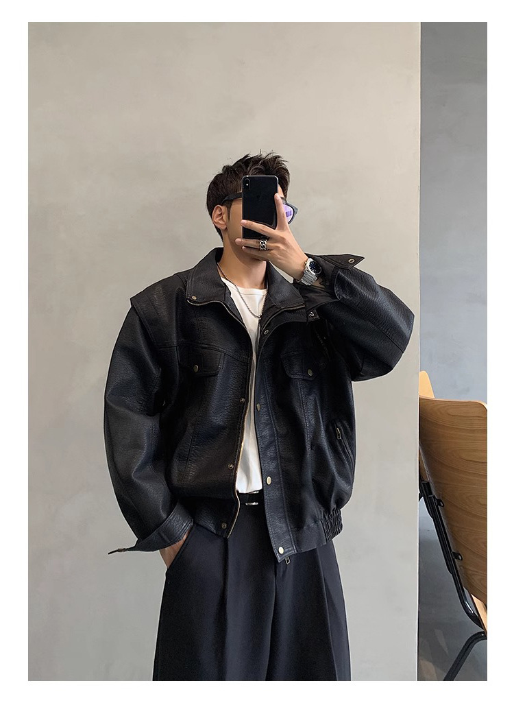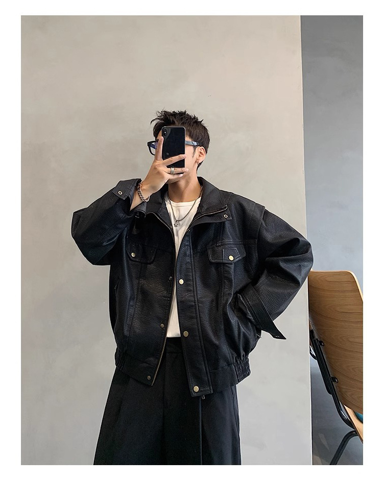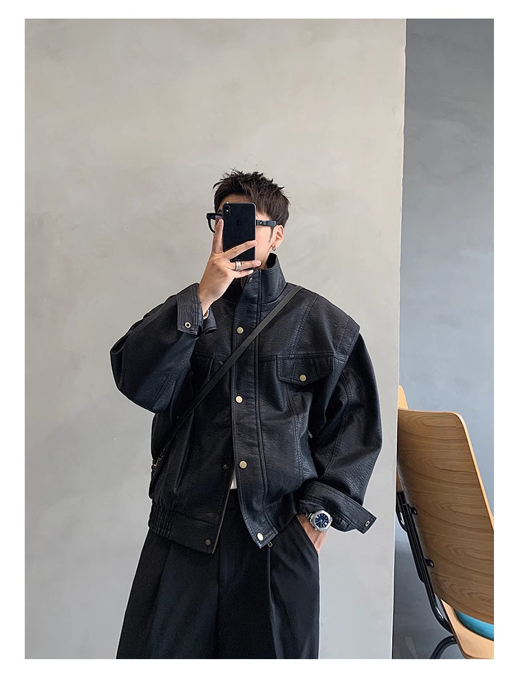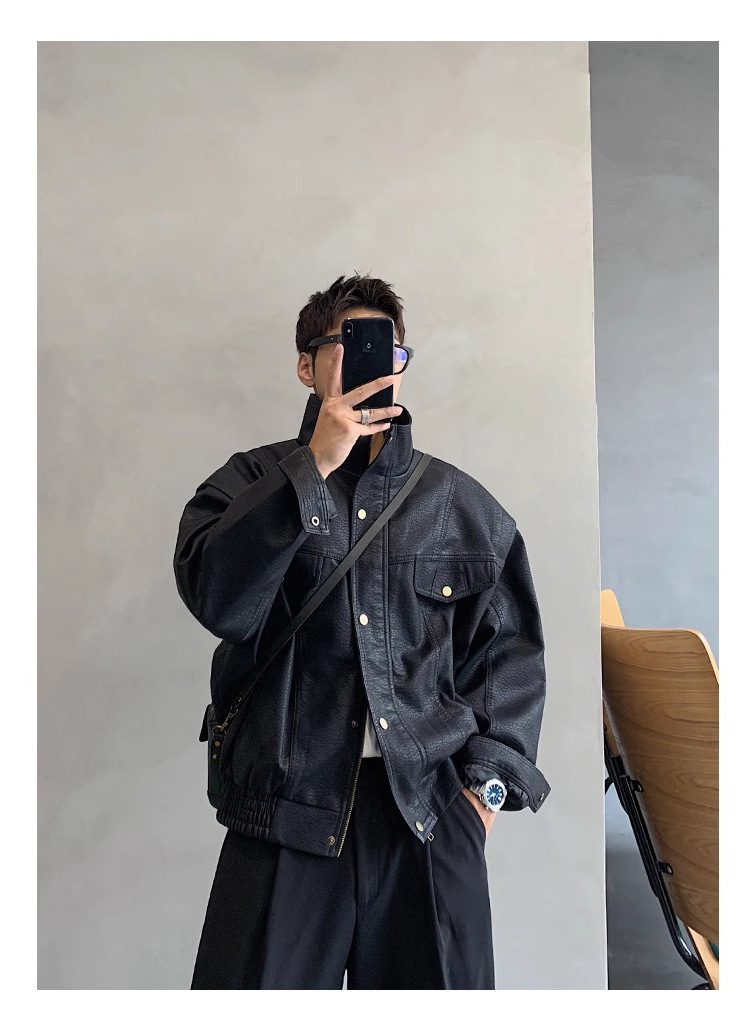 가을과 겨울 새로운 스타일 수직 칼라 기관차 스타일 부드러운 가죽 자켓 남성용 더피 잘 생긴 느슨한 PU 가죽 자켓 남성용 트렌디 코트스토어 가기