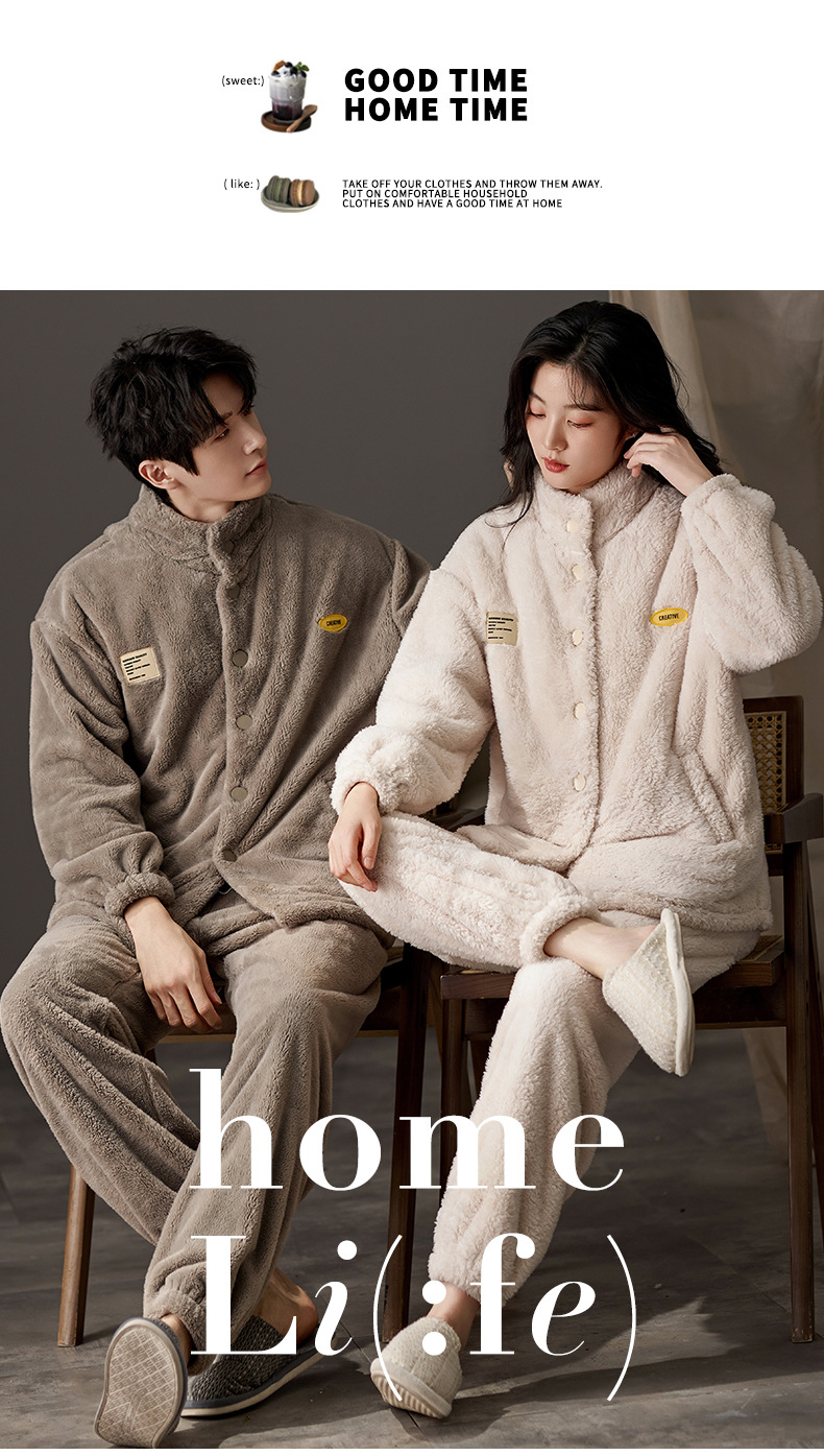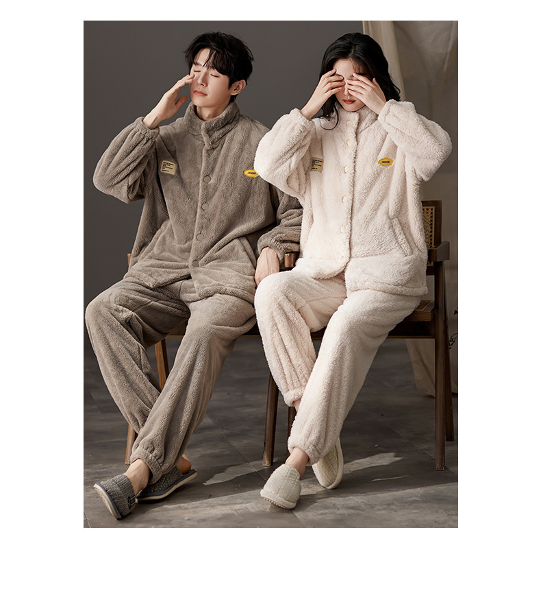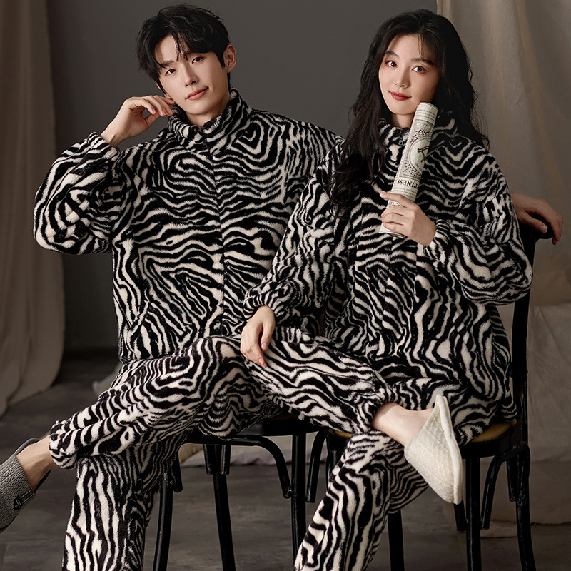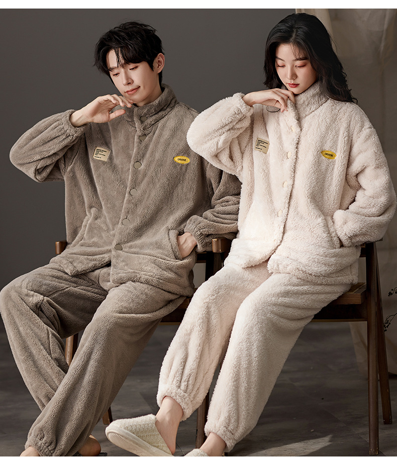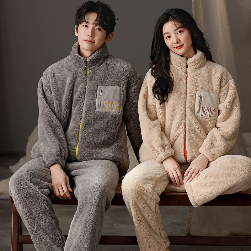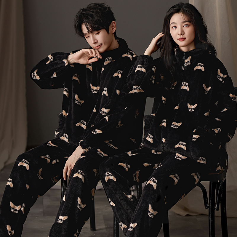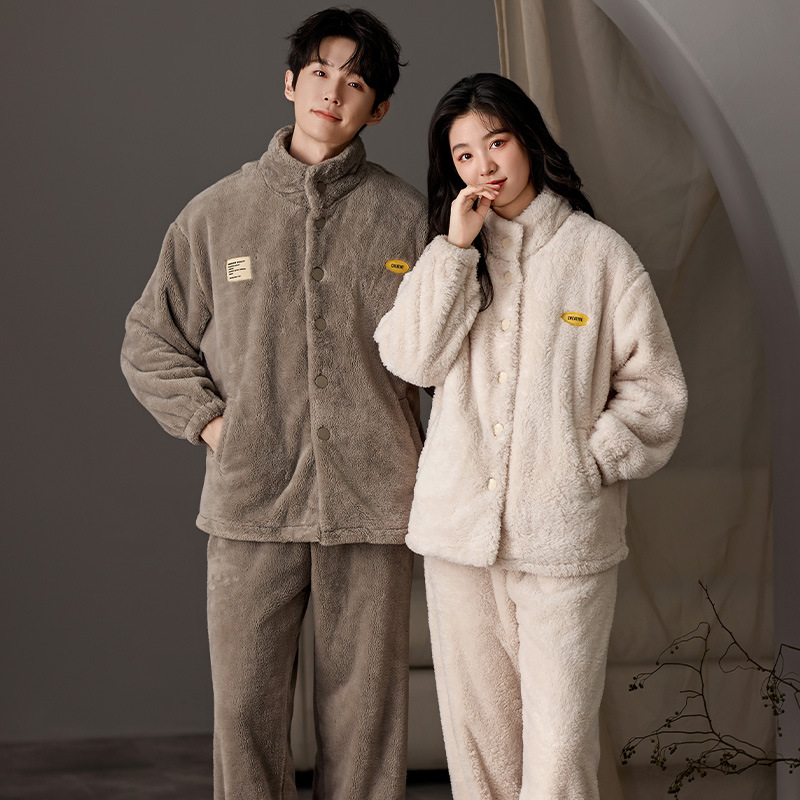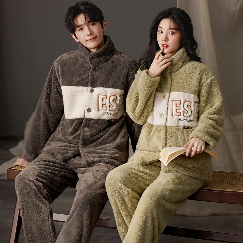 눈꽃 벨벳 두꺼운 보온 스탠드 칼라 가디건 커플 잠옷 겨울 긴팔 긴바지 외출복 남녀 공용