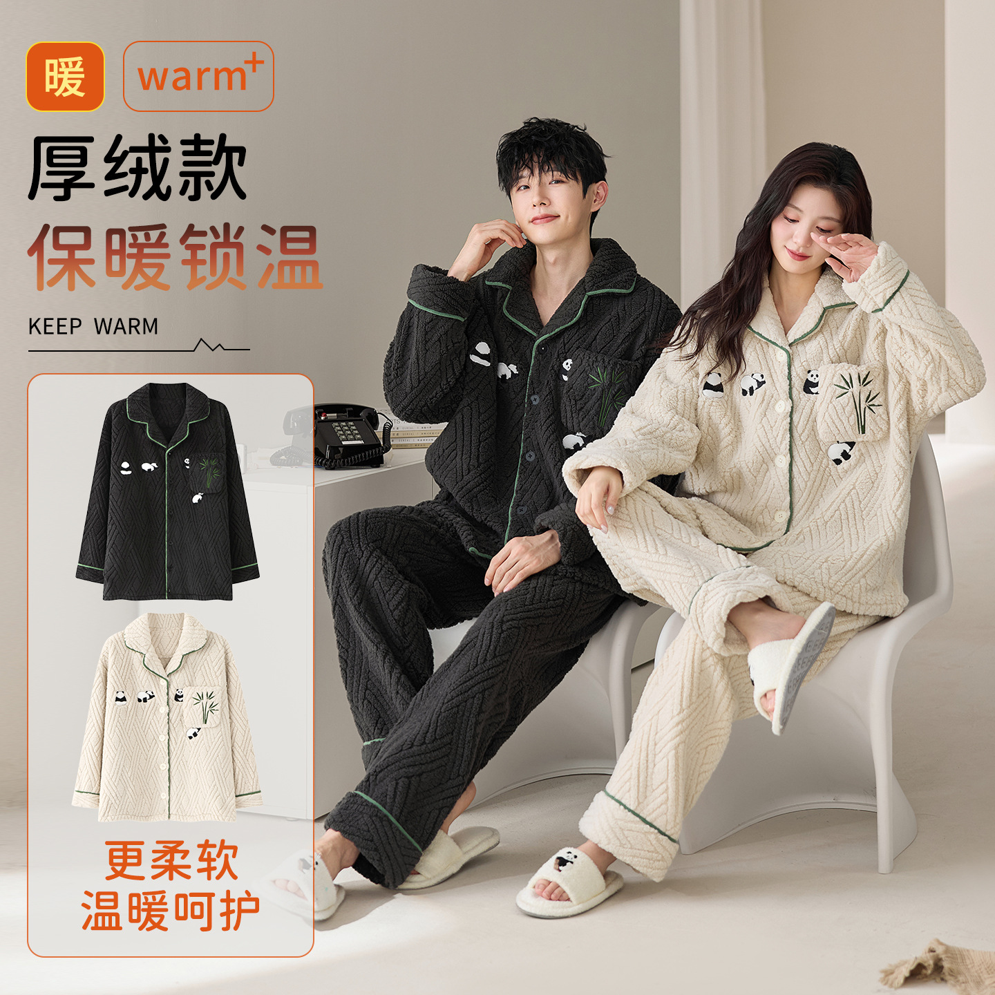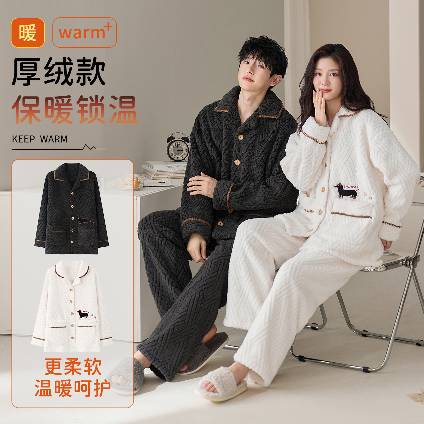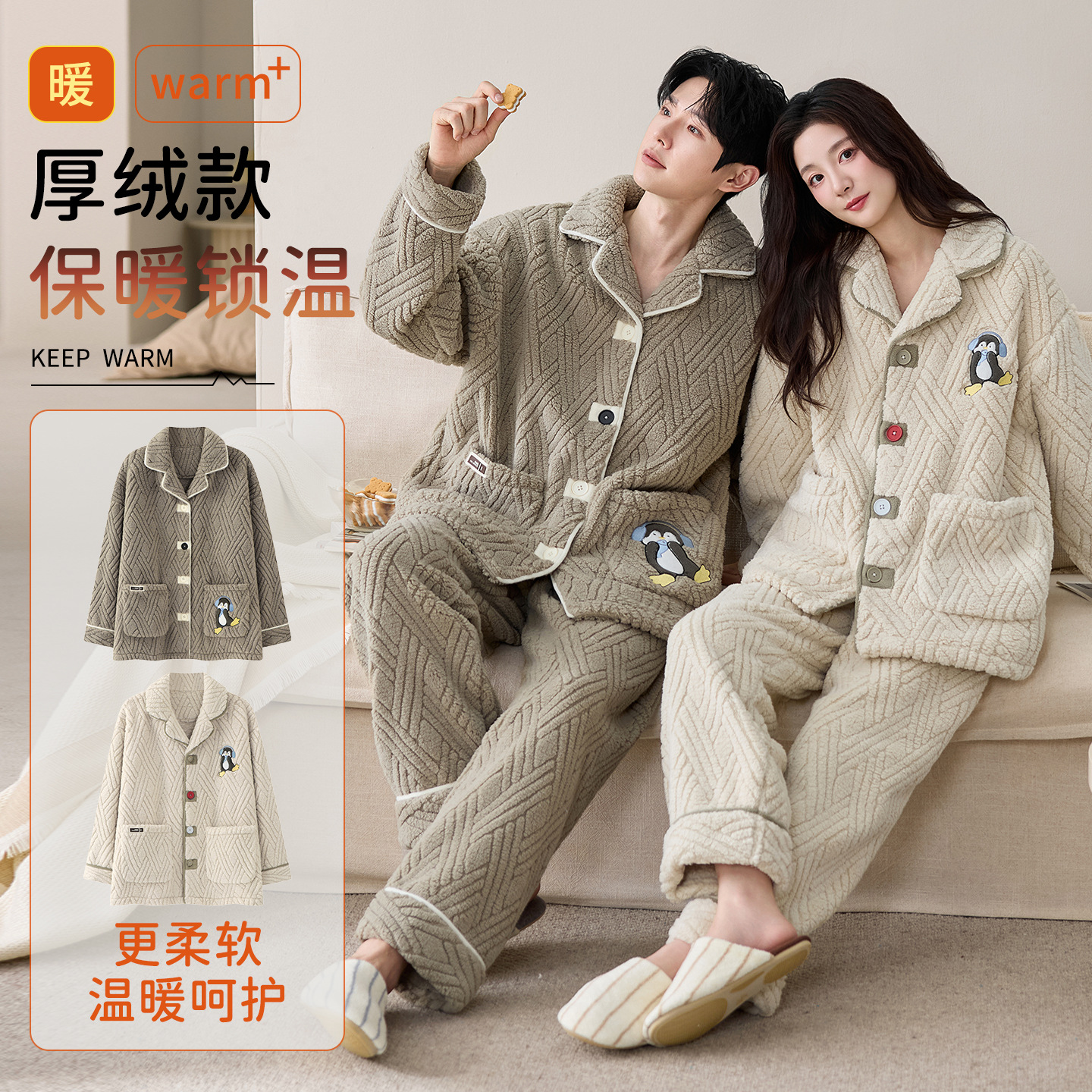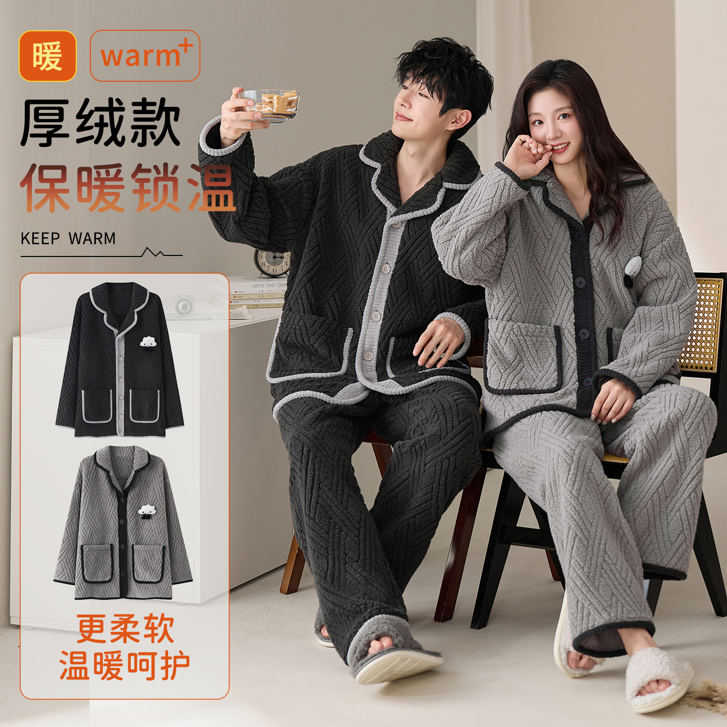 눈꽃 벨벳 두꺼운 보온 스탠드 칼라 가디건 커플 잠옷 겨울 긴팔 긴바지 외출복 남녀 공용