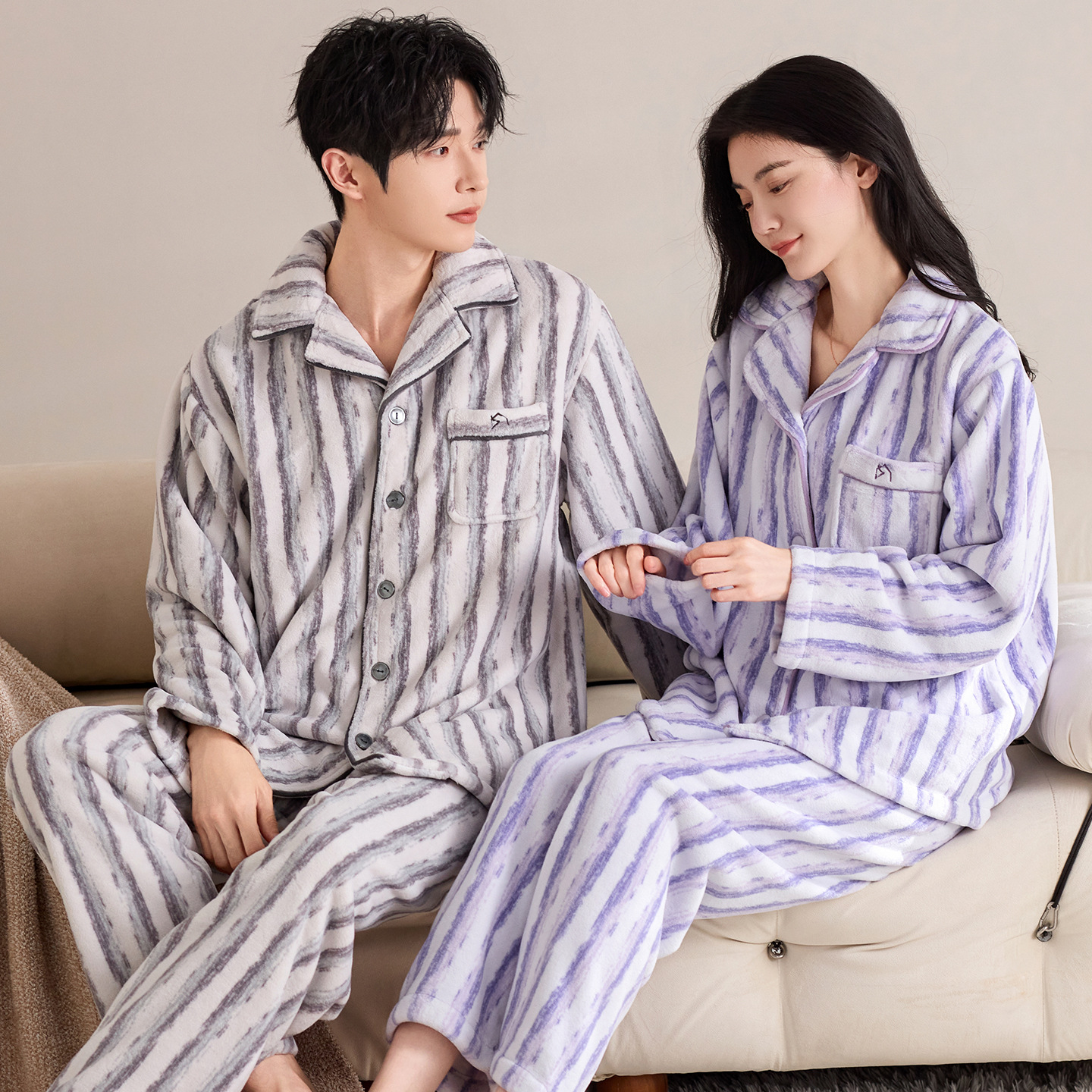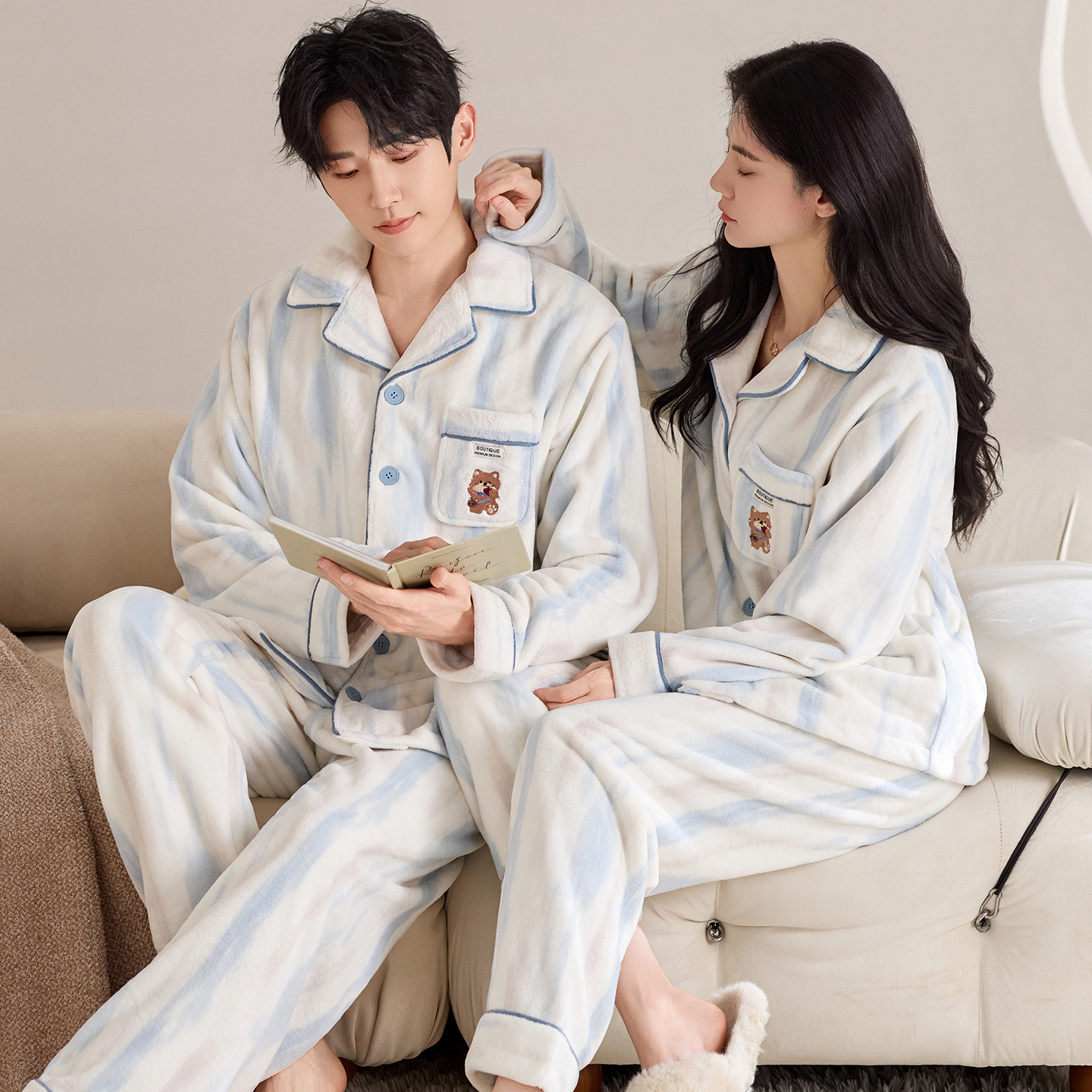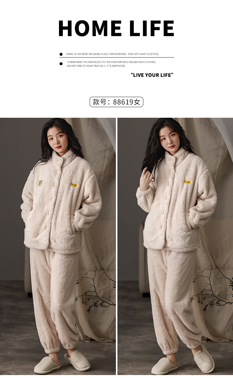 눈꽃 벨벳 두꺼운 보온 스탠드 칼라 가디건 커플 잠옷 겨울 긴팔 긴바지 외출복 남녀 공용스토어 가기