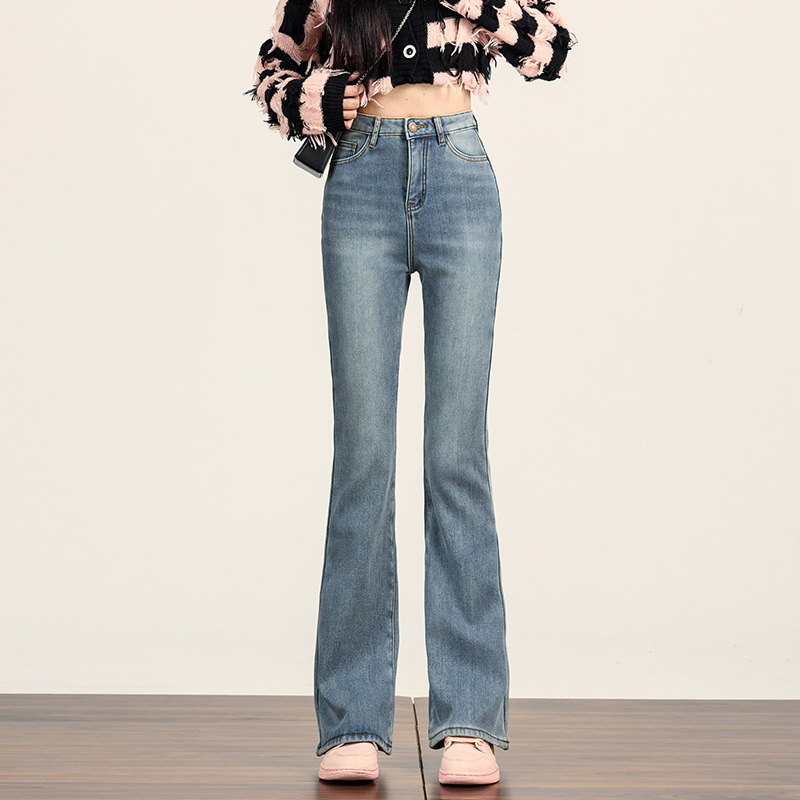 여성용 벨벳 두꺼운 마이크로 플레어 청바지 2025 가을 겨울 신상 하이웨이스트 신축성 있는 따뜻한 플레어 핏 바지