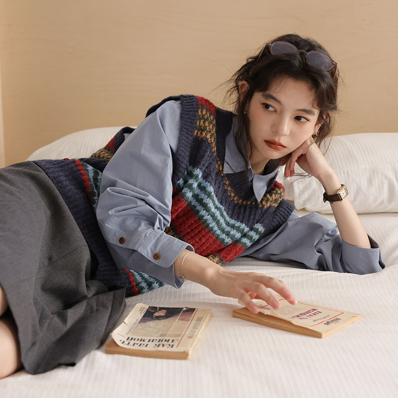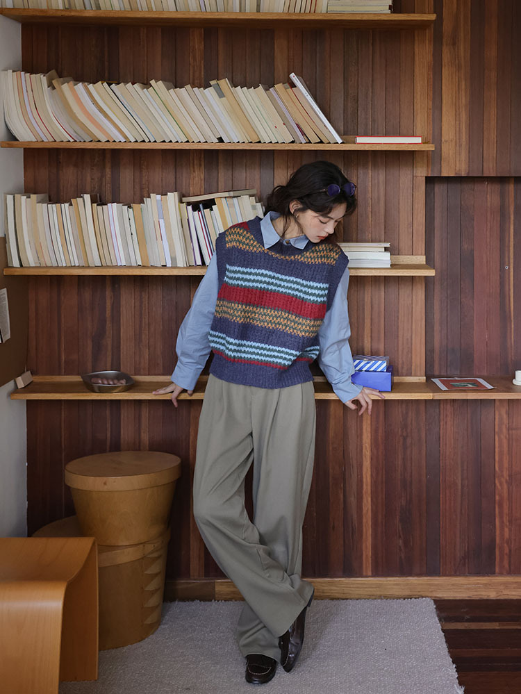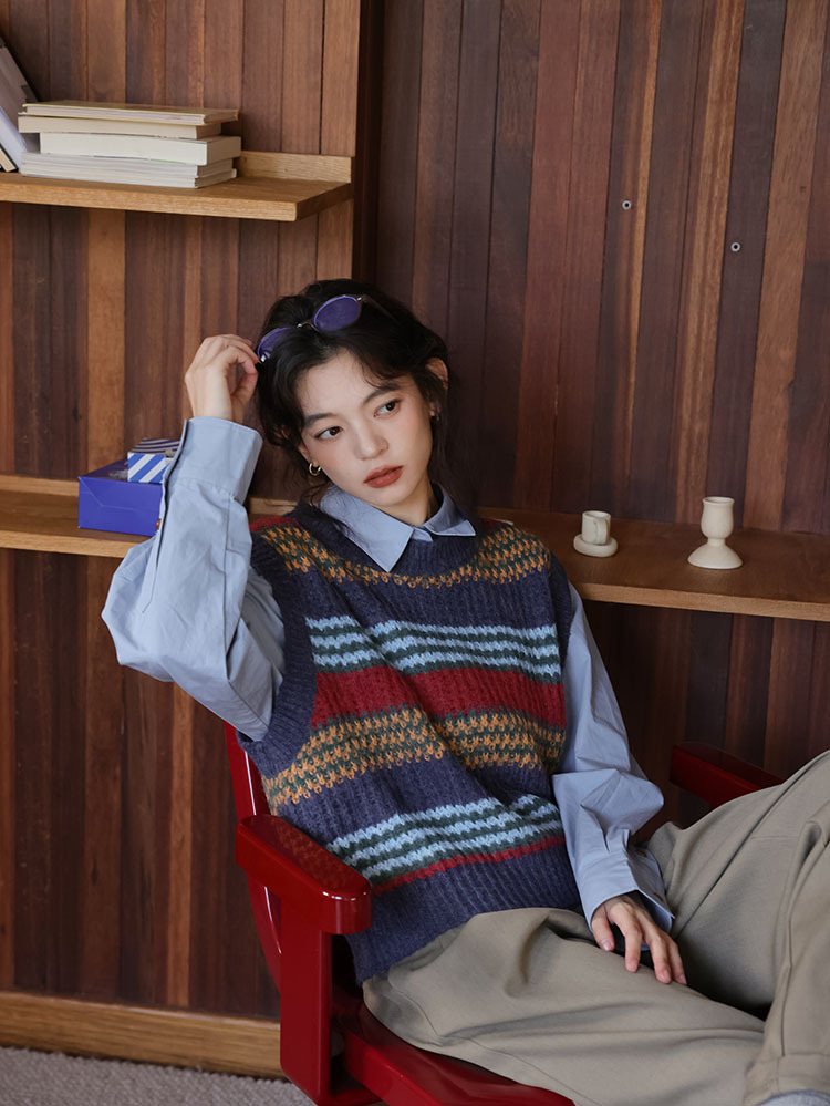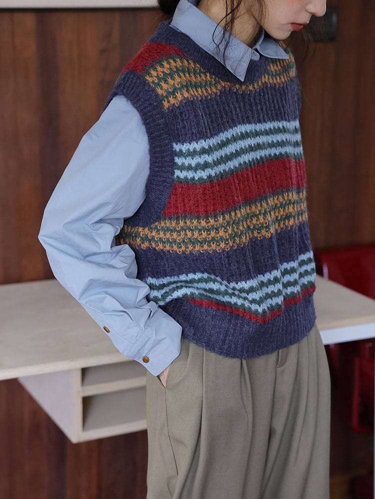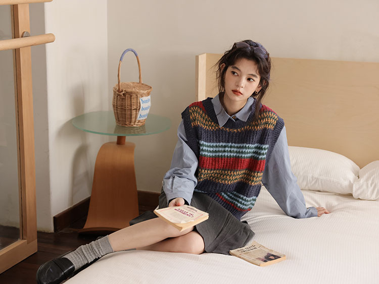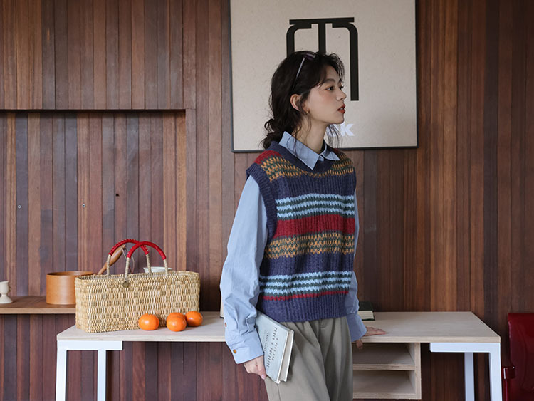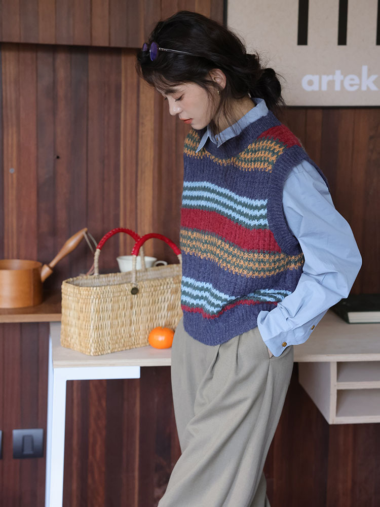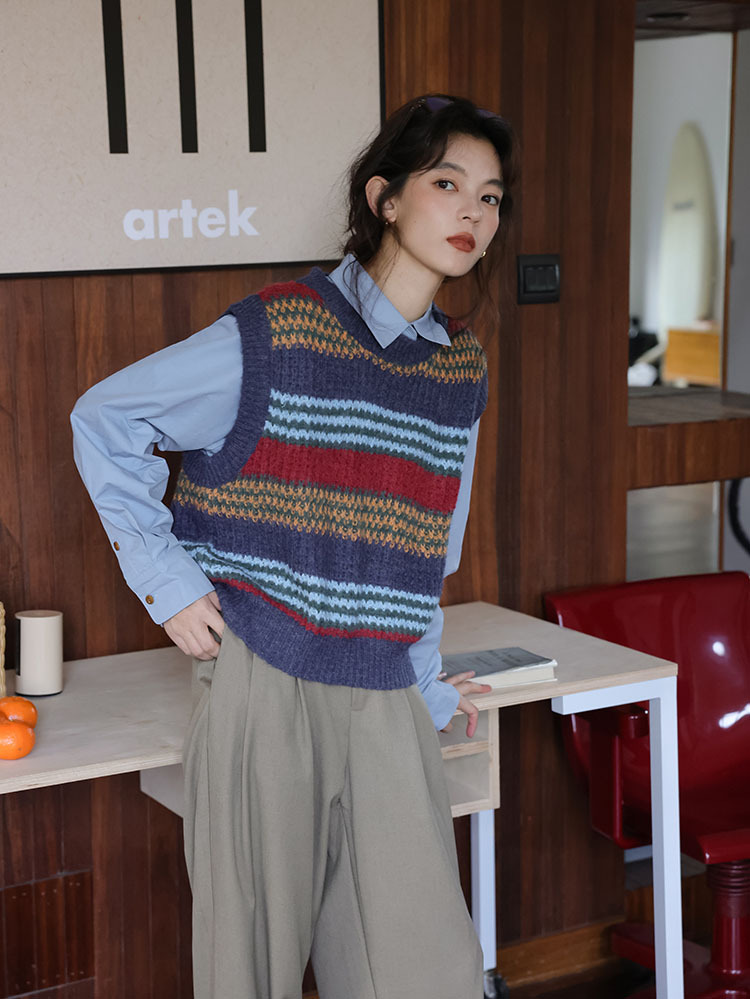 2025 봄 신상 레트로 컬러풀 스트라이프 레이어드 스타일 풀오버 라운드넥 니트 조끼 스웨터 여성용스토어 가기