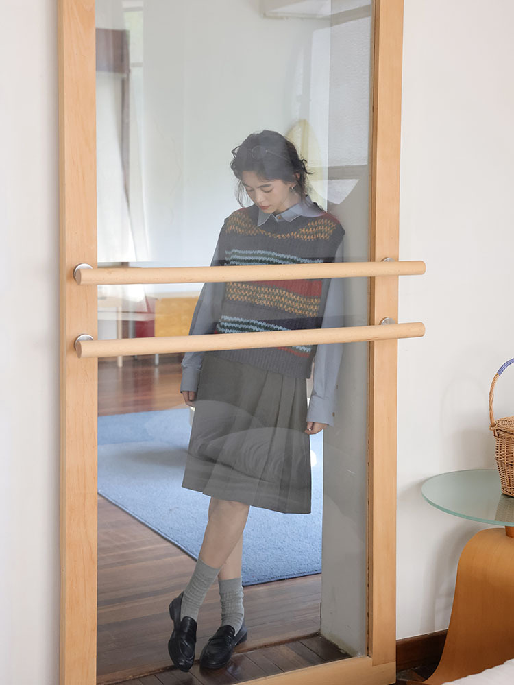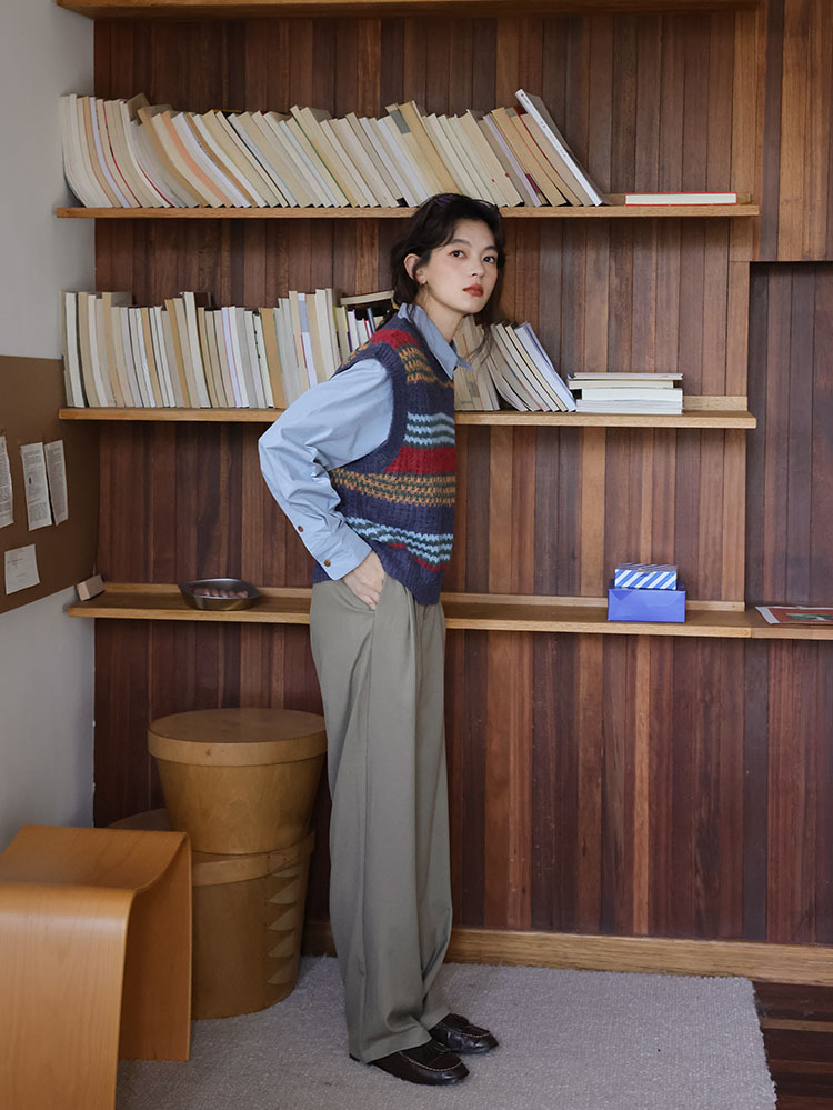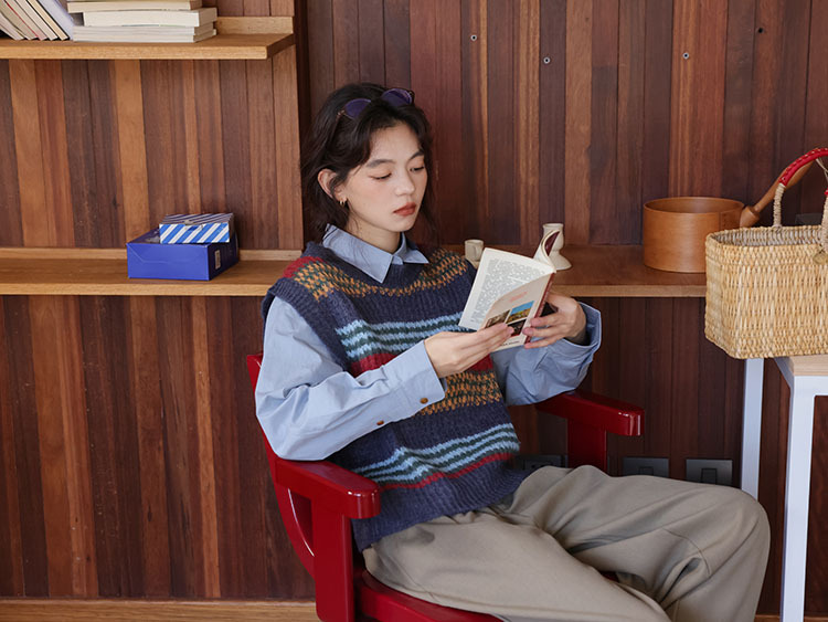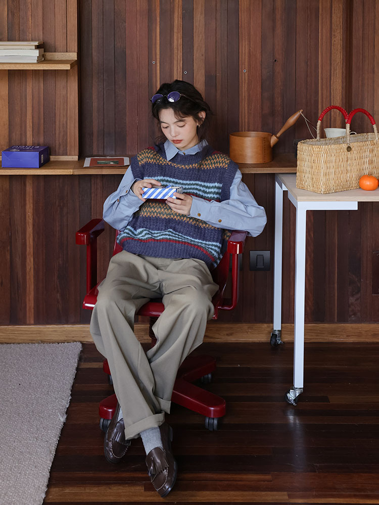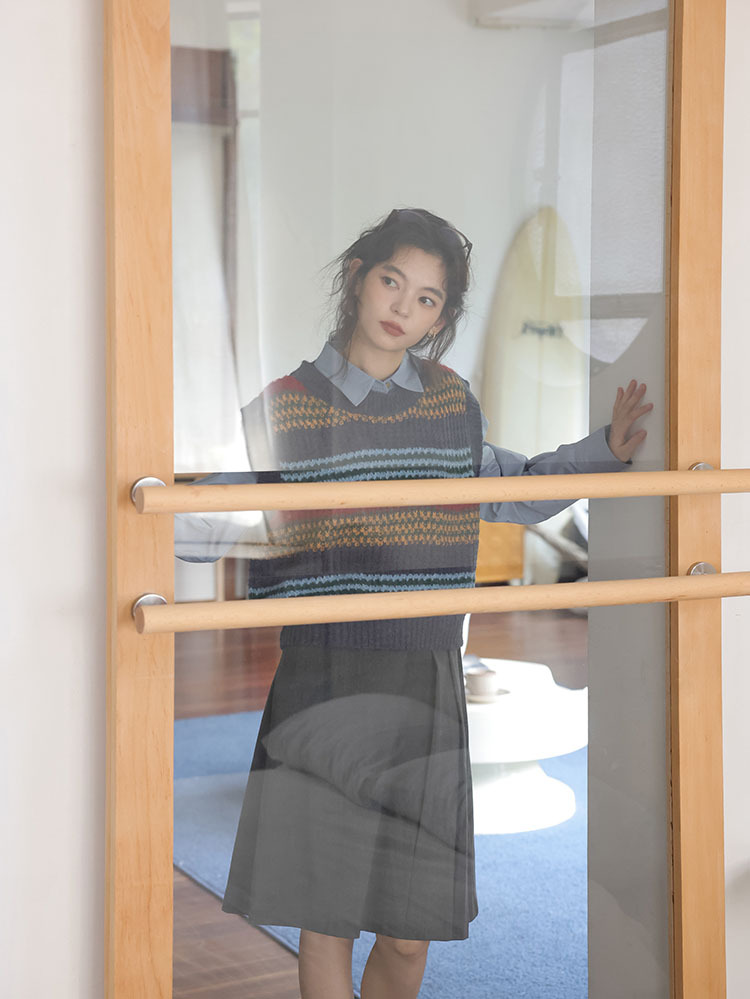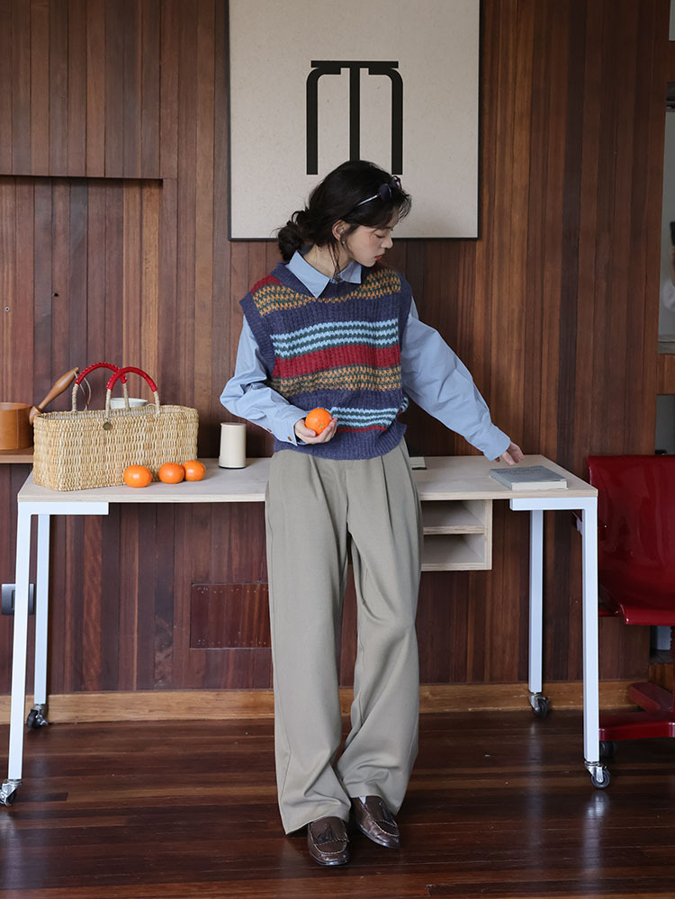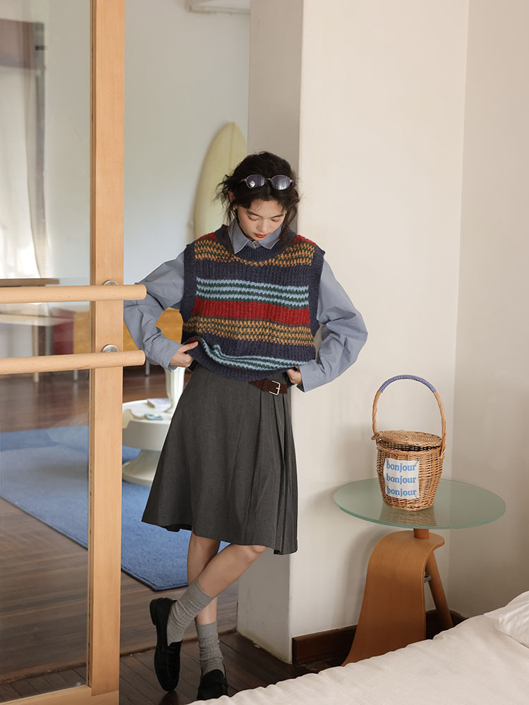 2025 봄 신상 레트로 컬러풀 스트라이프 레이어드 스타일 풀오버 라운드넥 니트 조끼 스웨터 여성용스토어 가기