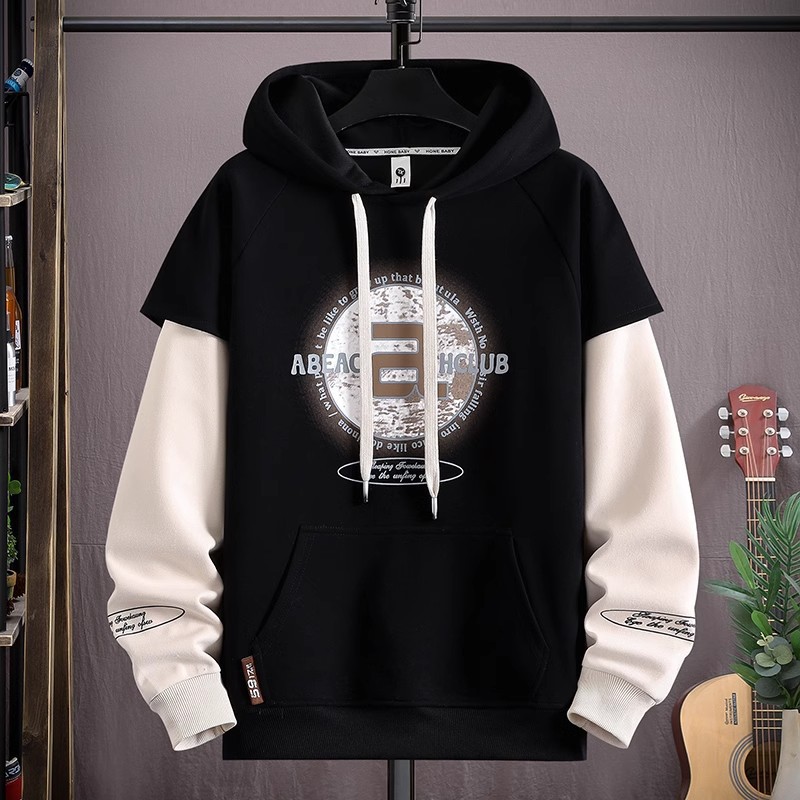 2024 새로운 패션 후드 스웨트 셔츠 남자의 봄과 가을 패션 브랜드 가짜 투피스 스티칭 재킷 느슨한 캐주얼 탑스토어 가기