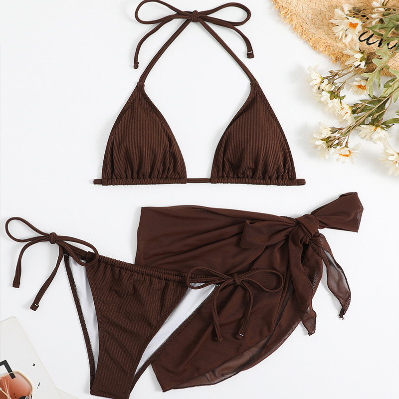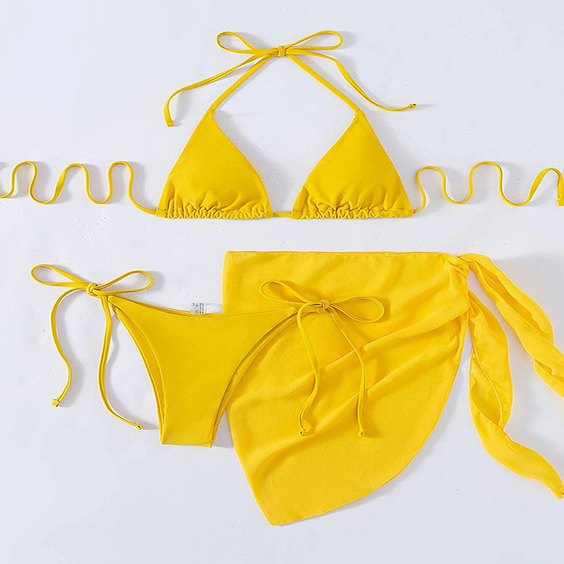 유럽과 미국은 국경을 넘나 드는 새로운 단색 목 레이스 업 비키니 하이 허리 메쉬 스플릿 섹시한 3 피스 수영복 여성스토어 가기
