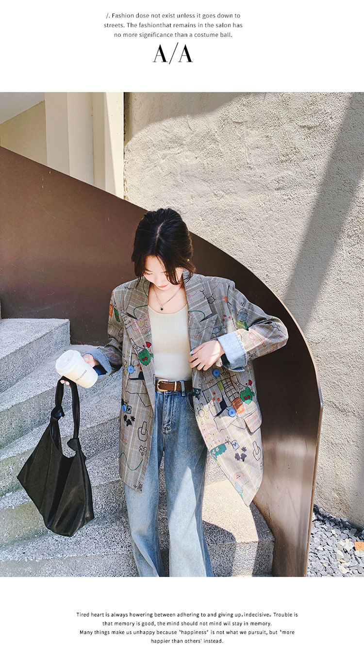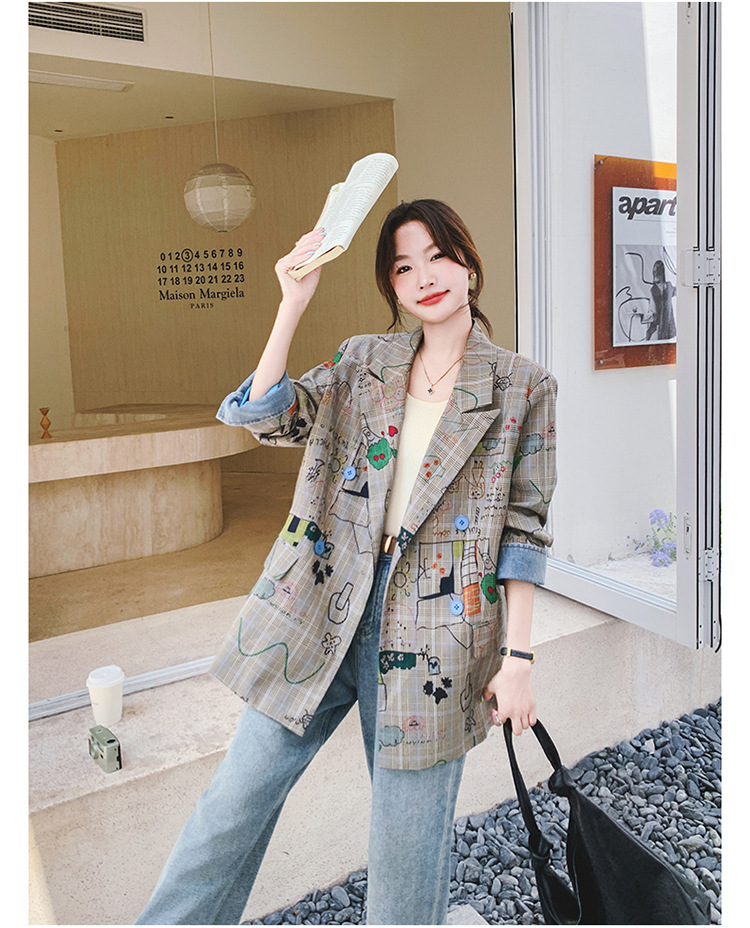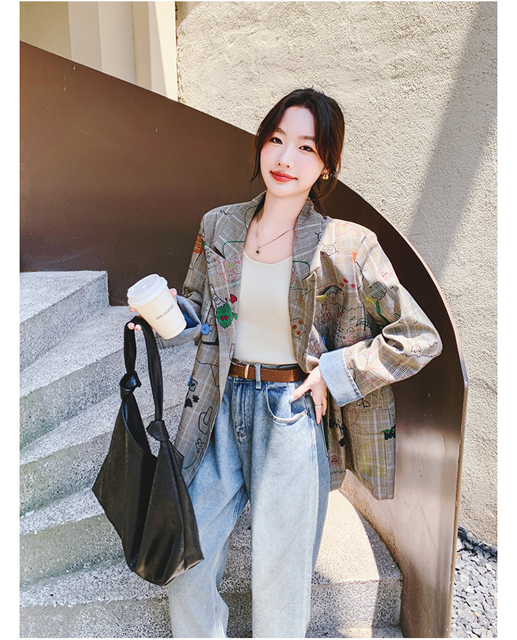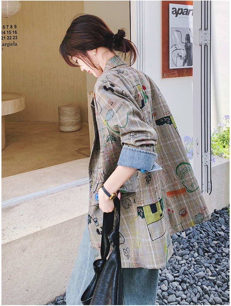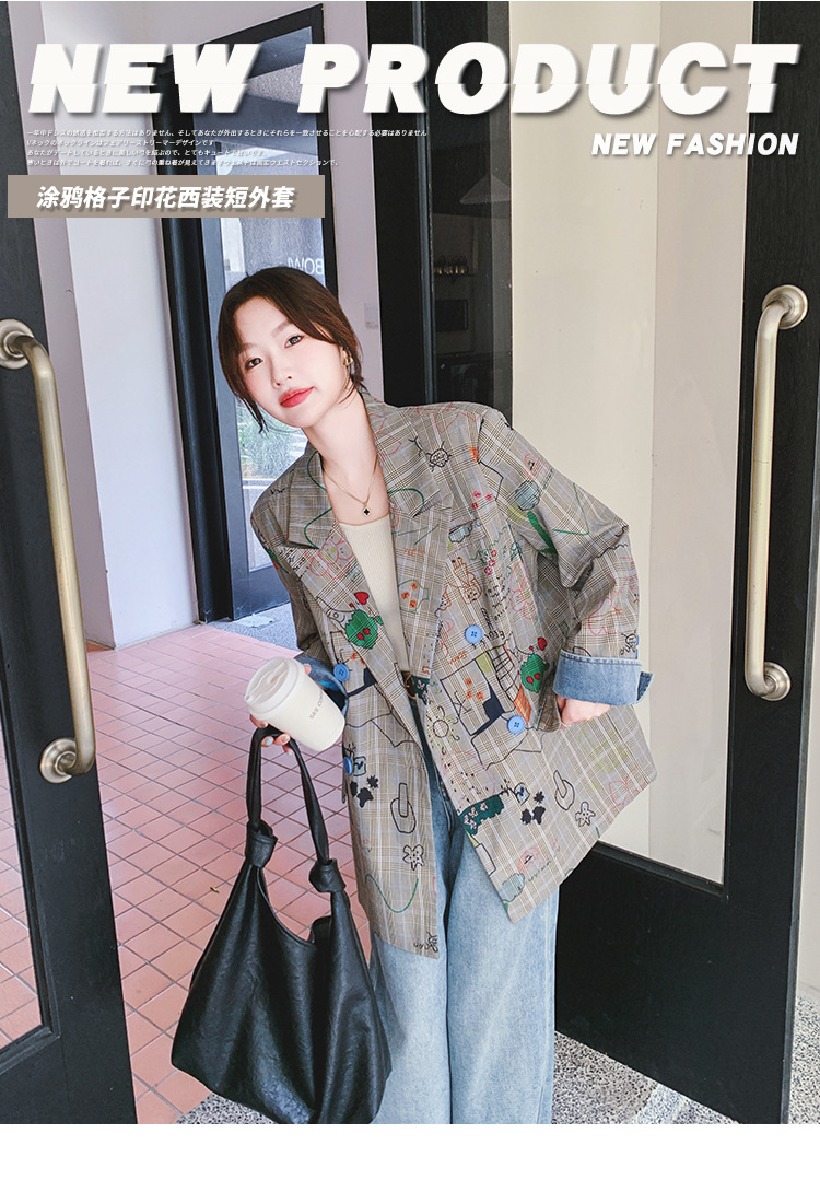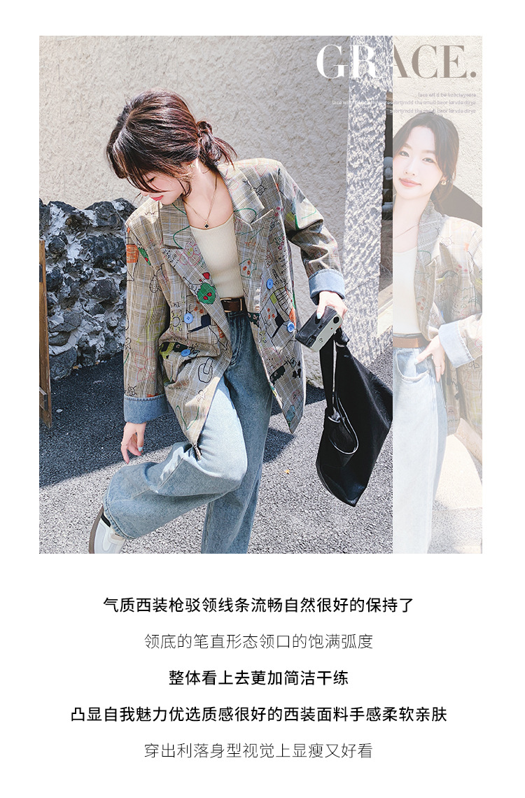 여성을위한 회색 격자 무늬 정장 재킷 봄, 가을 2025 새로운 디자인 스트리트 루즈 캐주얼 낙서 인쇄 정장