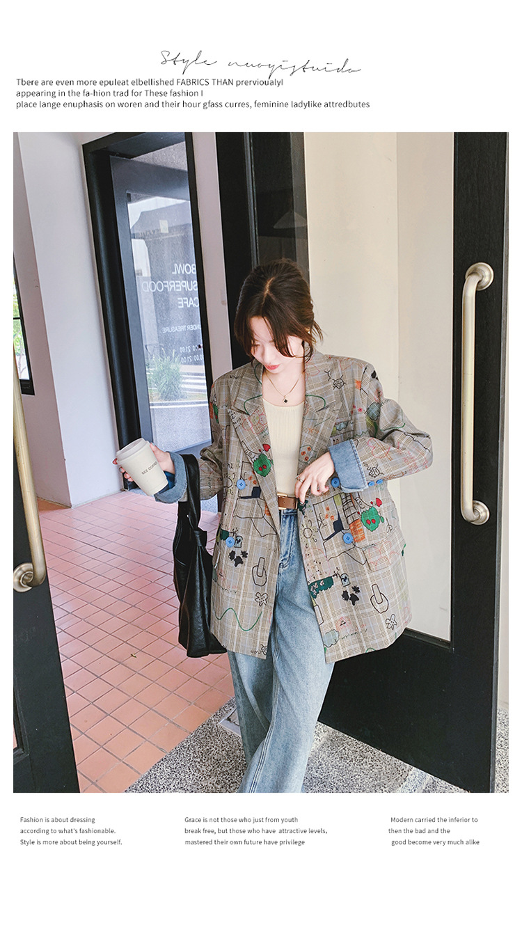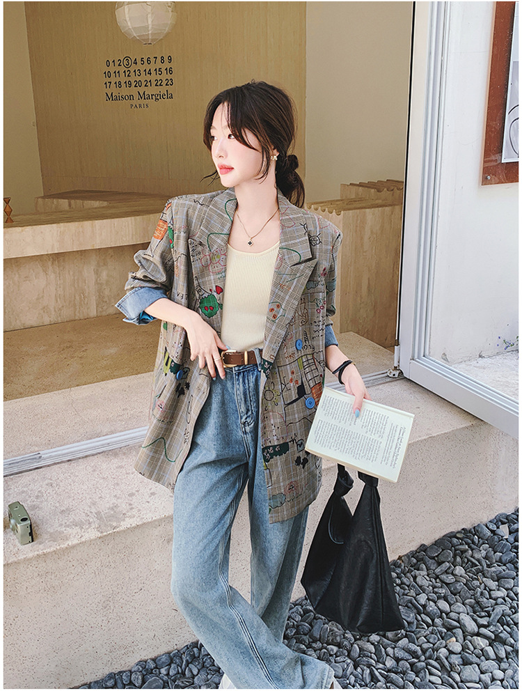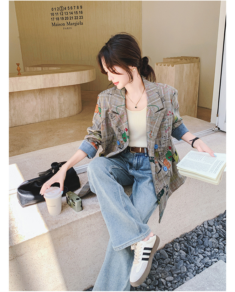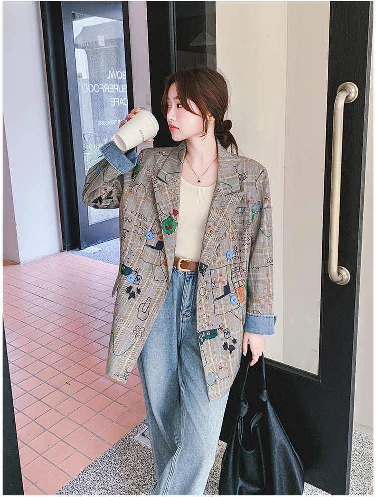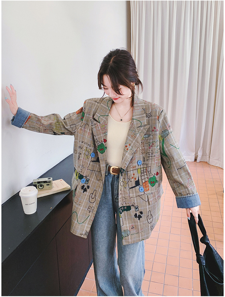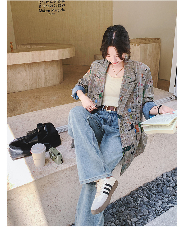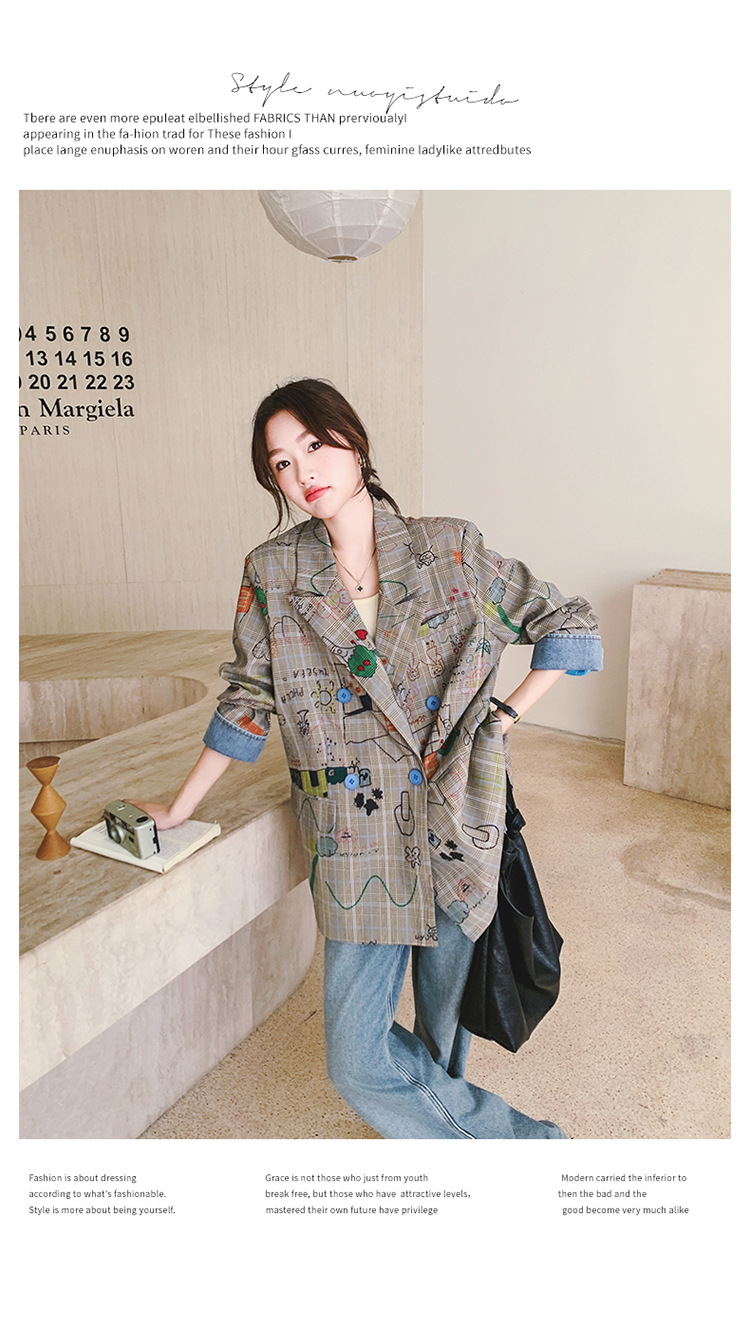 여성을위한 회색 격자 무늬 정장 재킷 봄, 가을 2025 새로운 디자인 스트리트 루즈 캐주얼 낙서 인쇄 정장