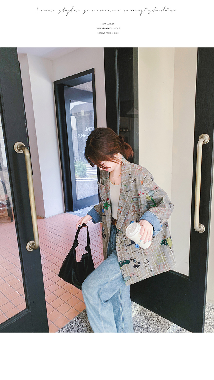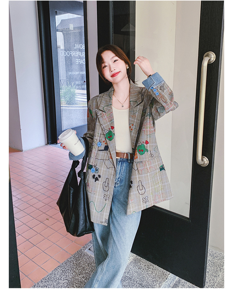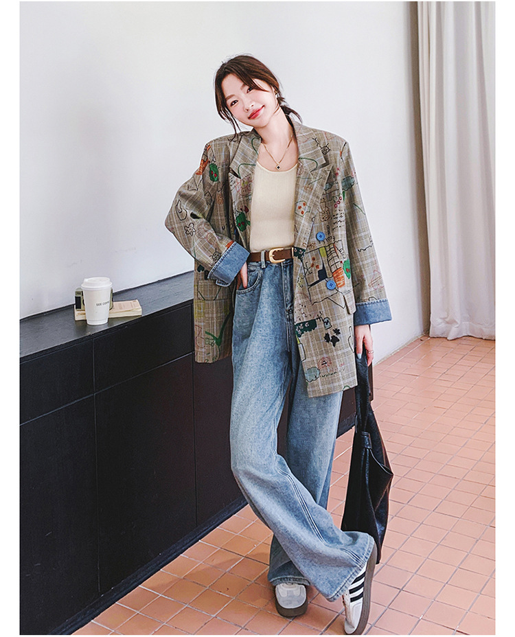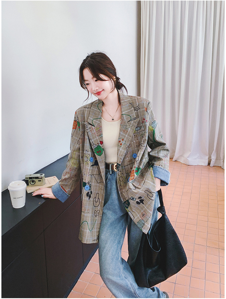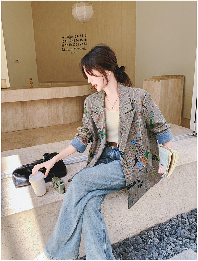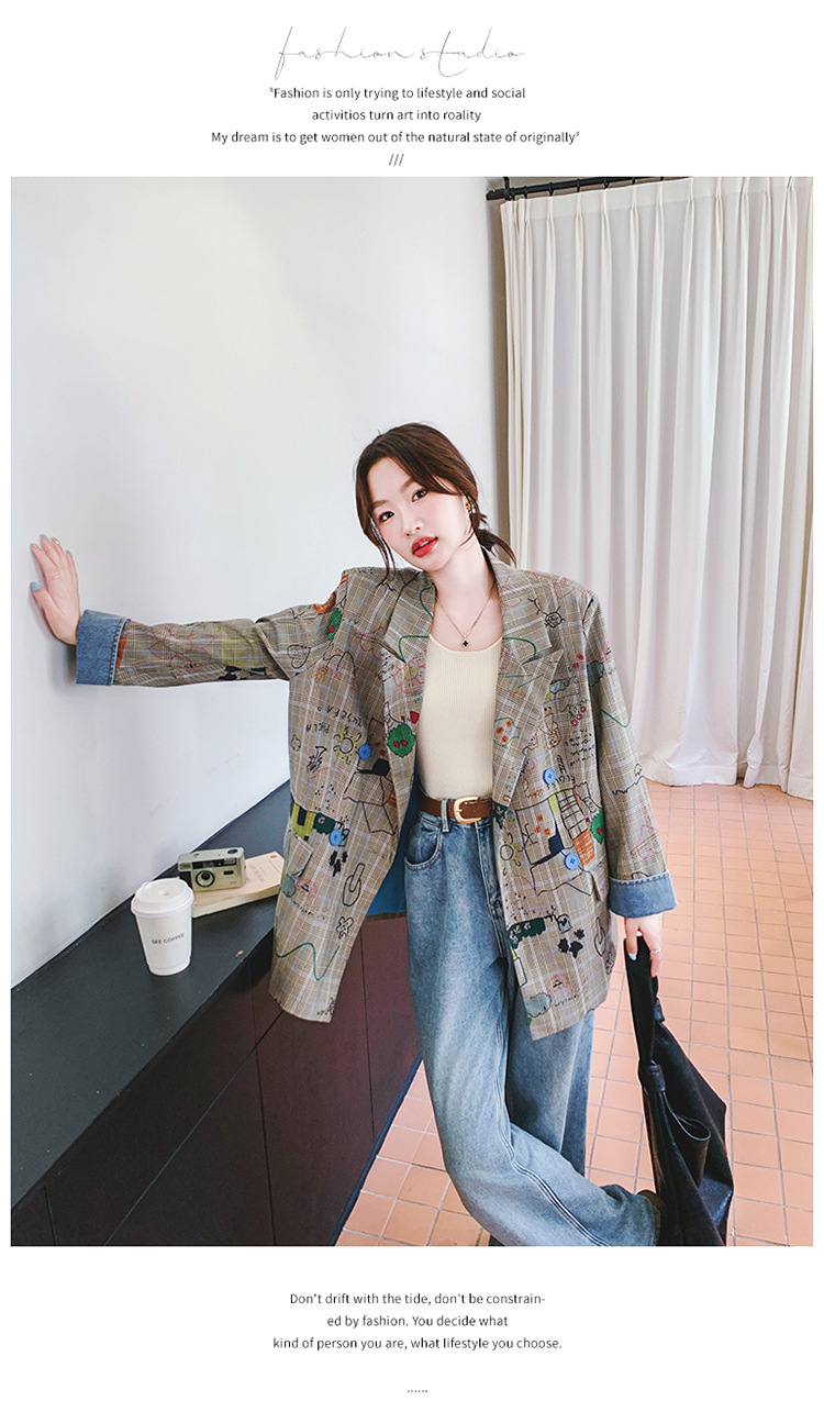 여성을위한 회색 격자 무늬 정장 재킷 봄, 가을 2025 새로운 디자인 스트리트 루즈 캐주얼 낙서 인쇄 정장