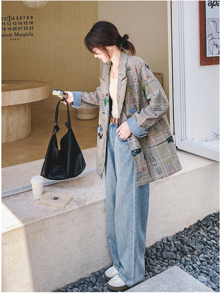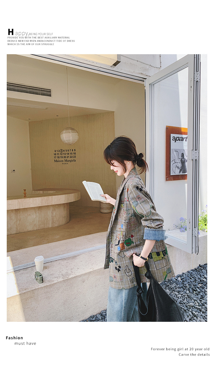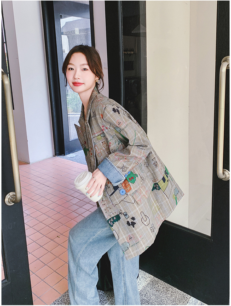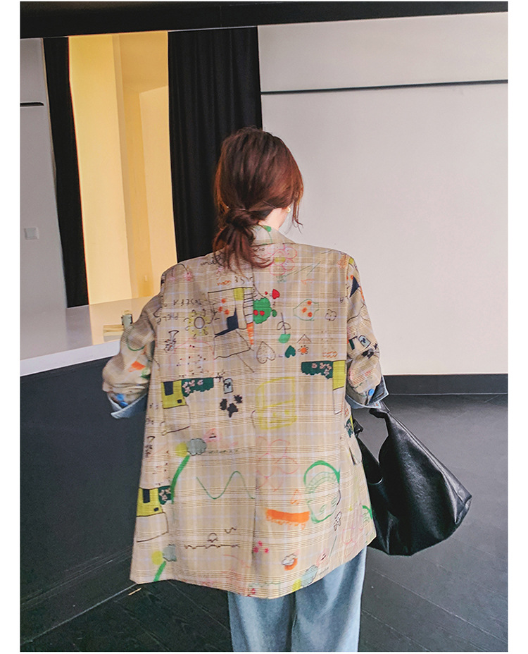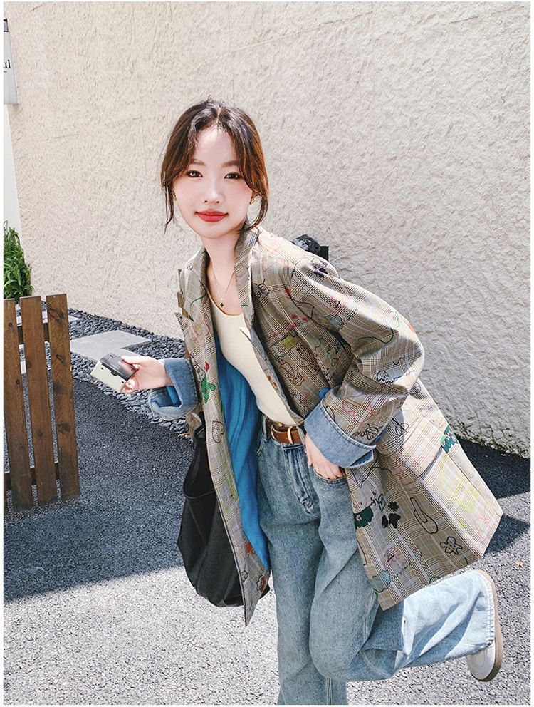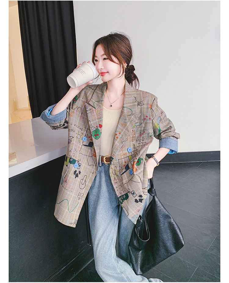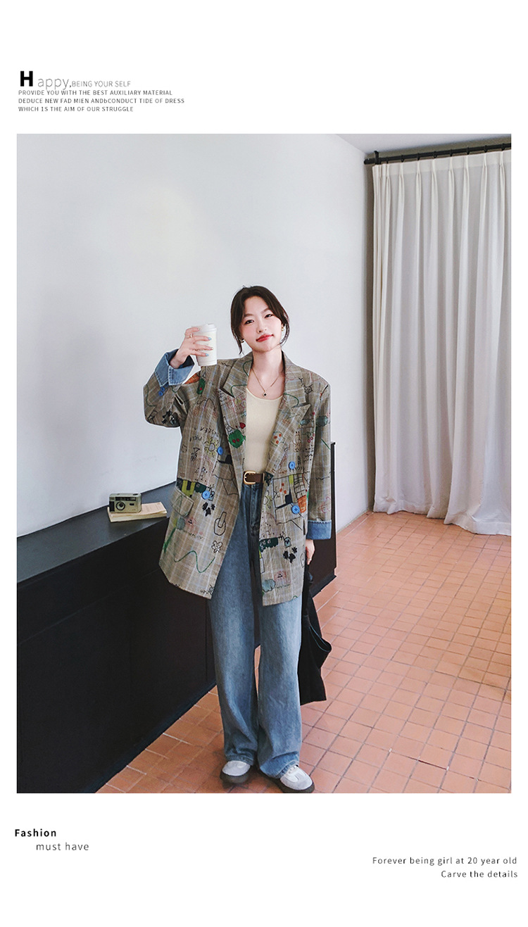 여성을위한 회색 격자 무늬 정장 재킷 봄, 가을 2025 새로운 디자인 스트리트 루즈 캐주얼 낙서 인쇄 정장
