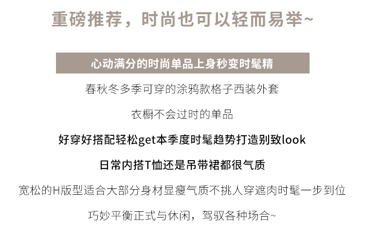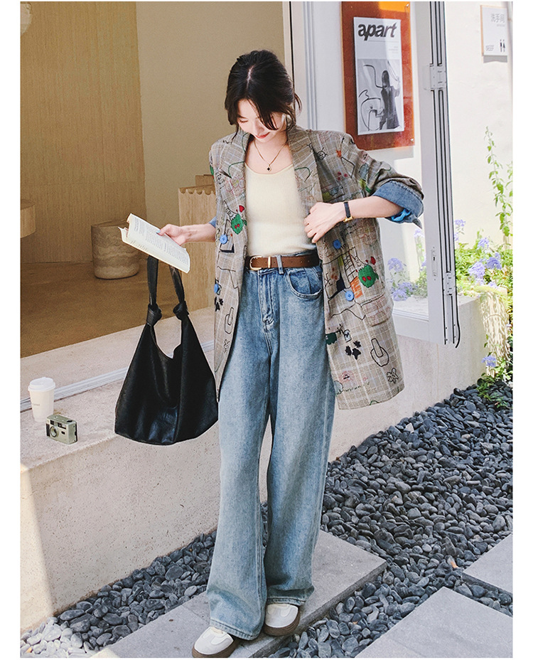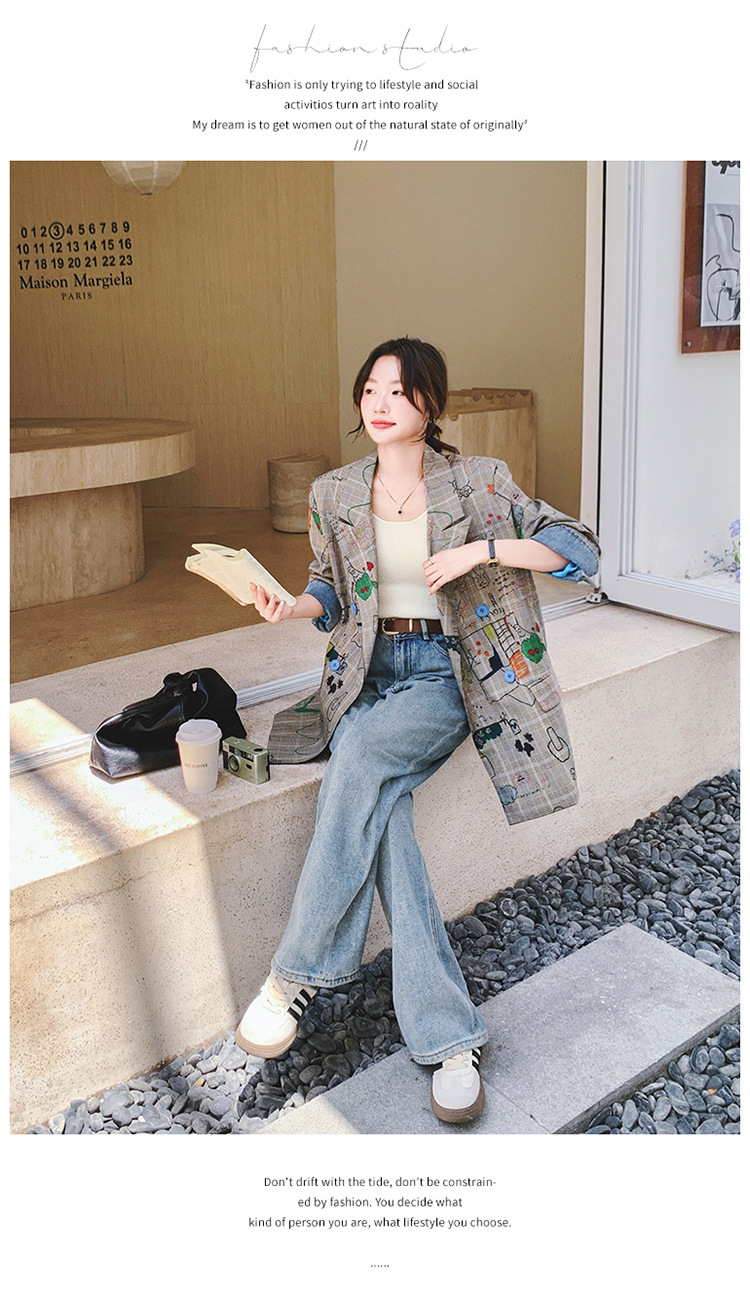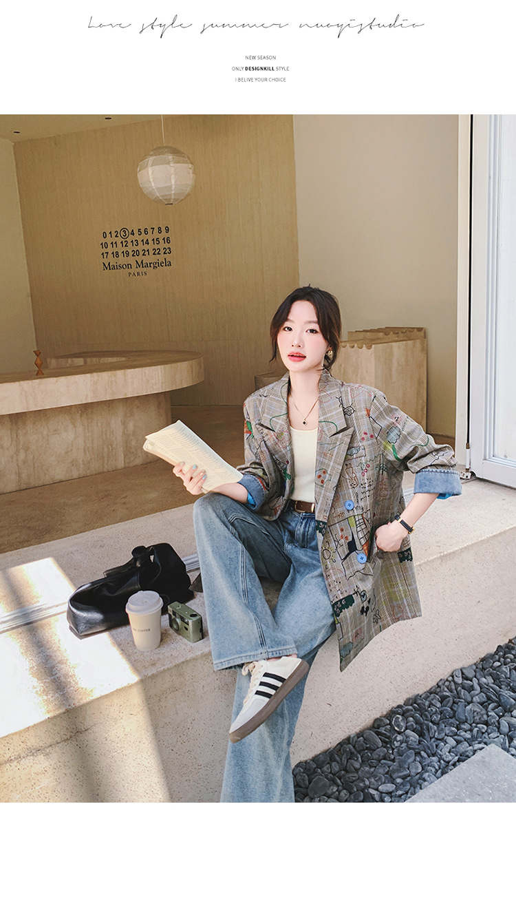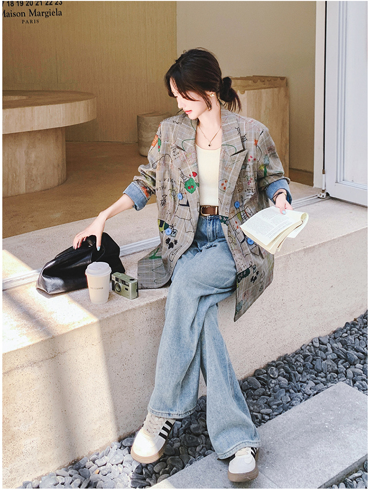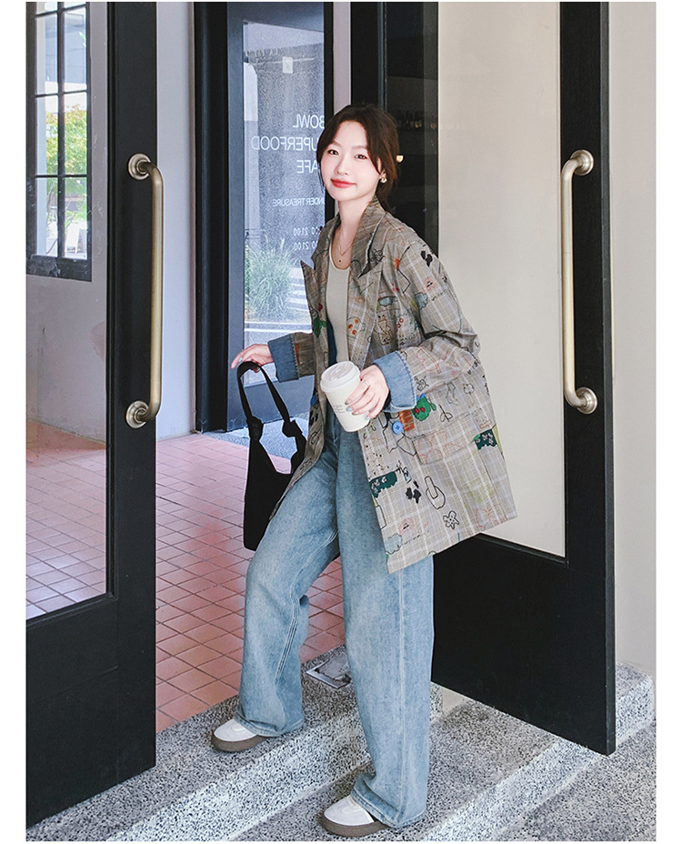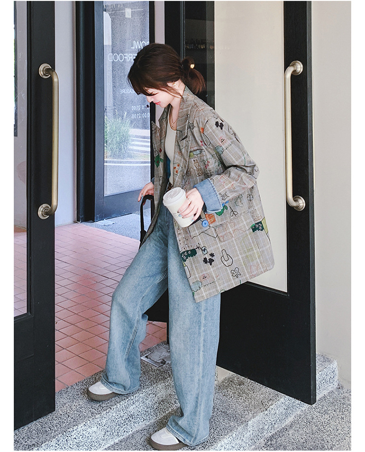 여성을위한 회색 격자 무늬 정장 재킷 봄, 가을 2025 새로운 디자인 스트리트 루즈 캐주얼 낙서 인쇄 정장