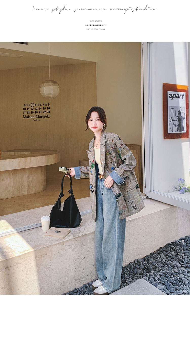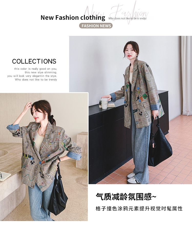 여성을위한 회색 격자 무늬 정장 재킷 봄, 가을 2025 새로운 디자인 스트리트 루즈 캐주얼 낙서 인쇄 정장스토어 가기
