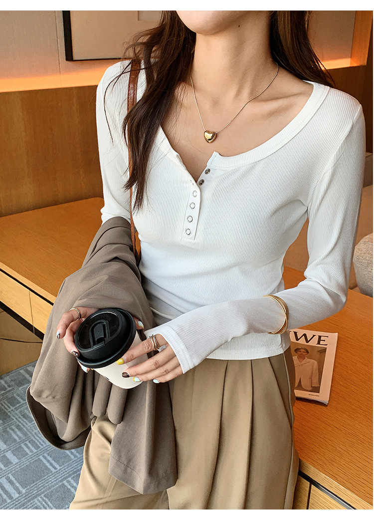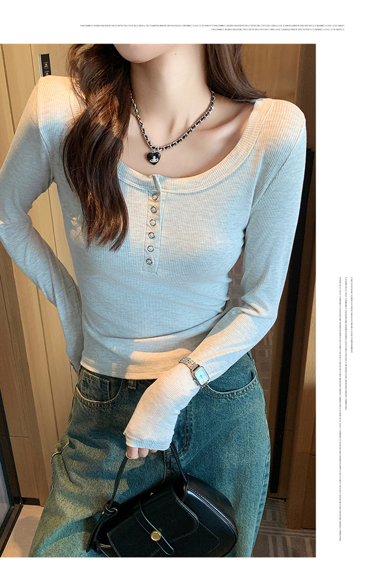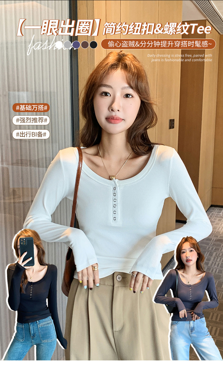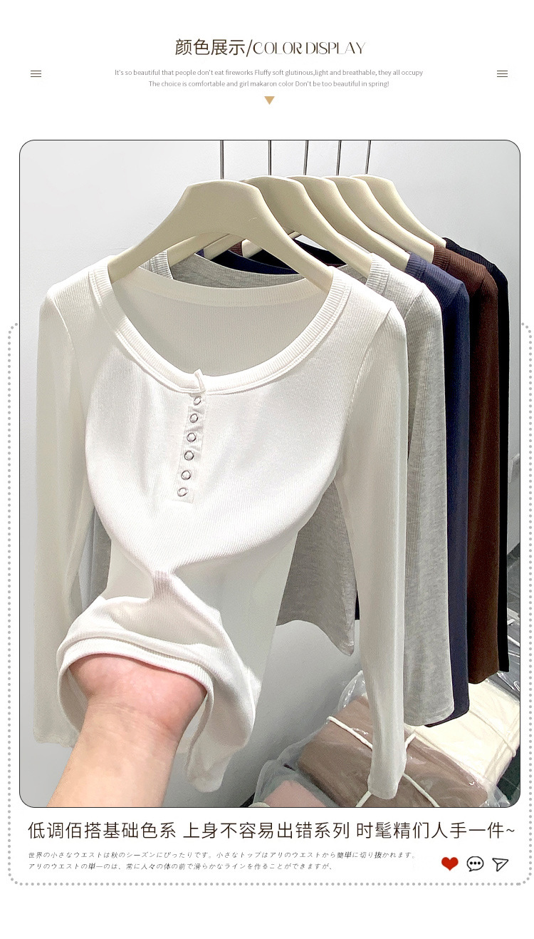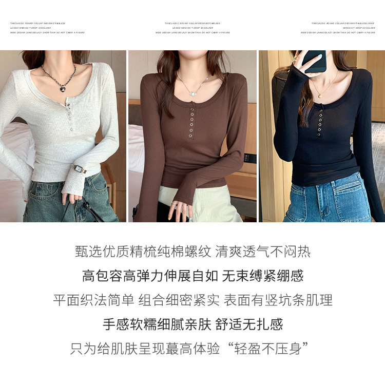 H262 초기 가을 긴 소매베이스 셔츠의 엄격한 선택 여성용 슬림 핏 버튼 도시 스타일 캐주얼 세련된 둥근 목 어깨 티셔츠스토어 가기