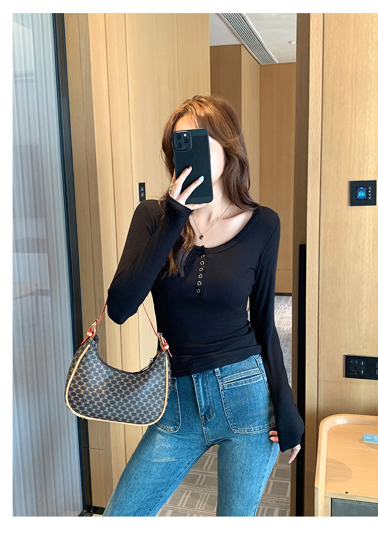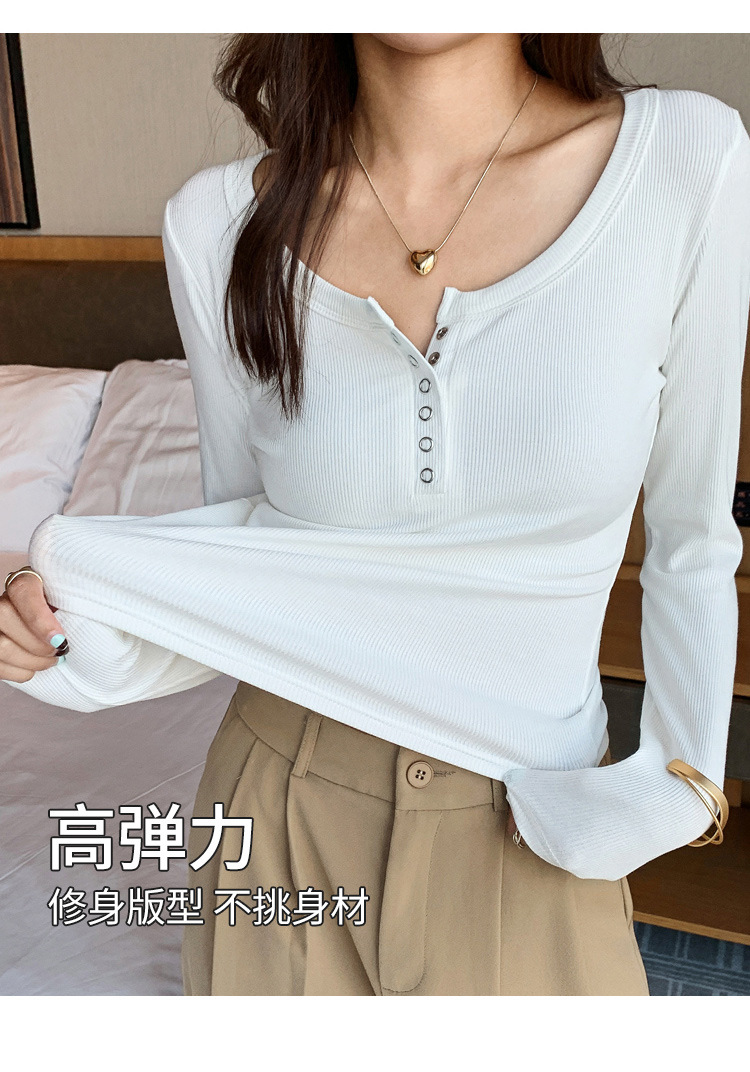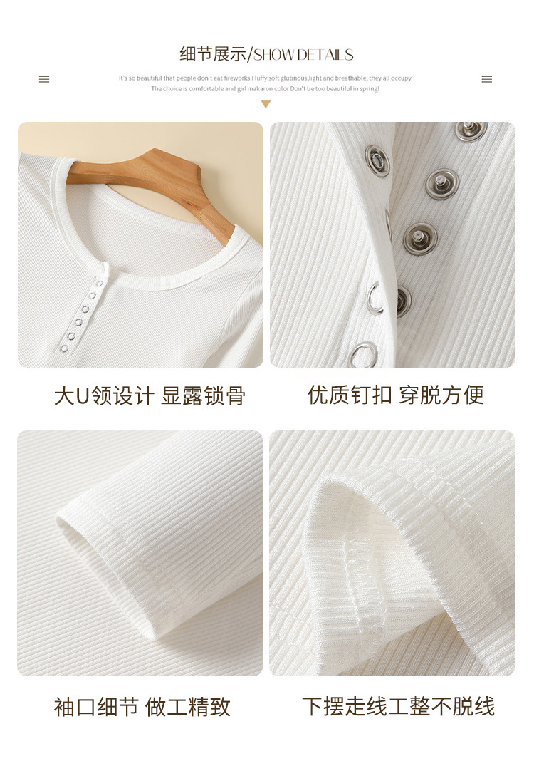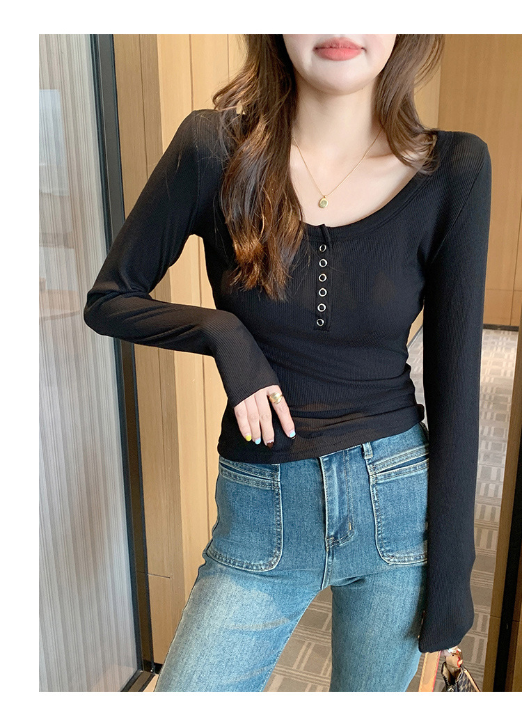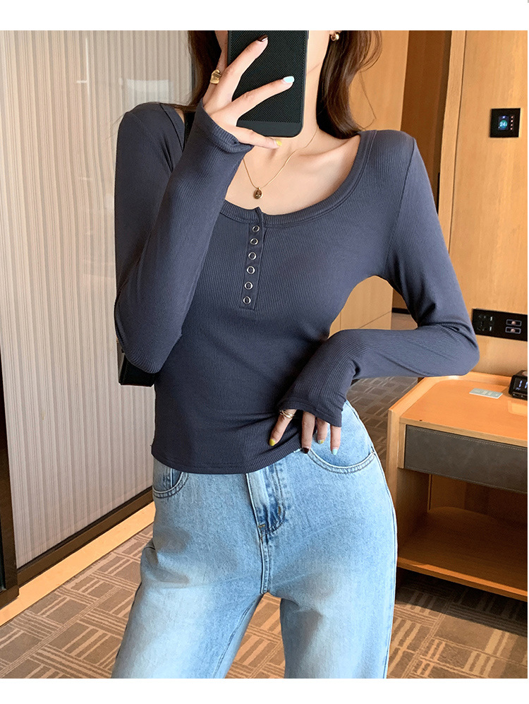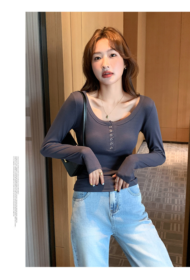 H262 초기 가을 긴 소매베이스 셔츠의 엄격한 선택 여성용 슬림 핏 버튼 도시 스타일 캐주얼 세련된 둥근 목 어깨 티셔츠스토어 가기