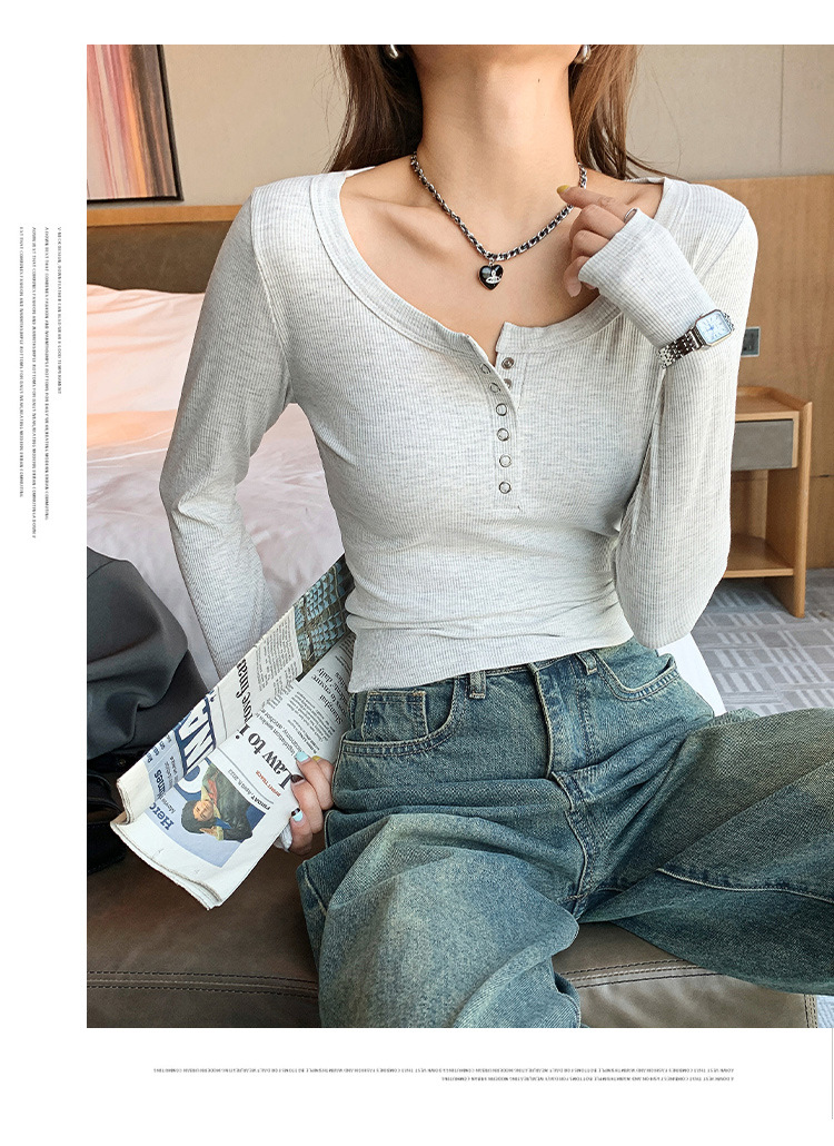 H262 초기 가을 긴 소매베이스 셔츠의 엄격한 선택 여성용 슬림 핏 버튼 도시 스타일 캐주얼 세련된 둥근 목 어깨 티셔츠