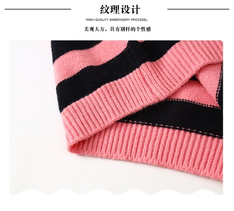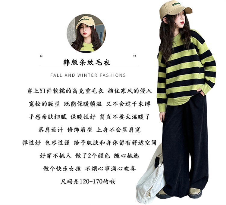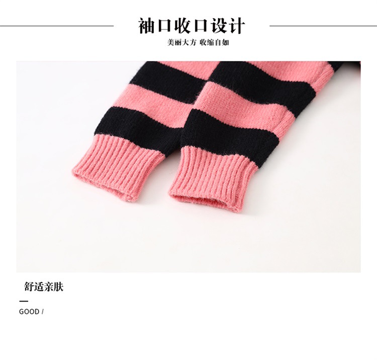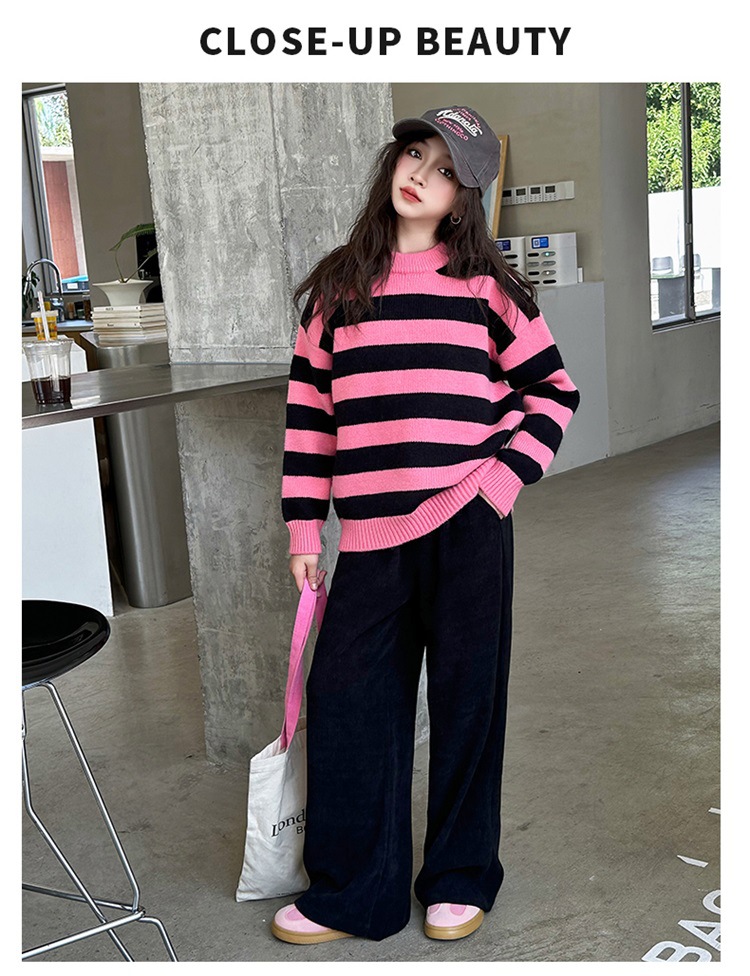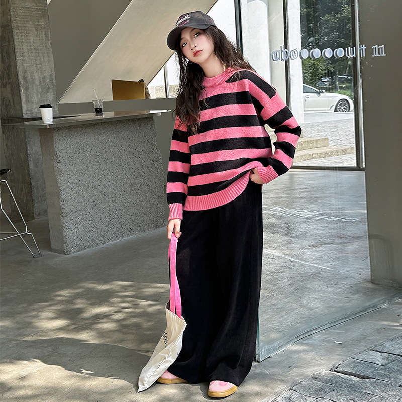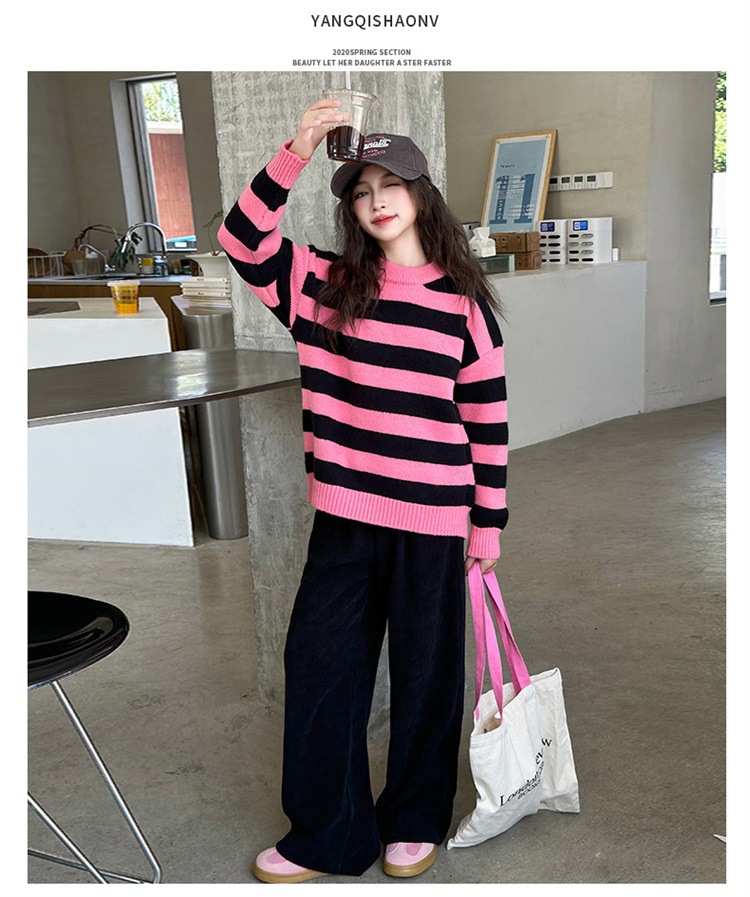 소녀 스웨터 가을과 겨울 2024 새로운 큐크 어린이 핑크 블랙 컬러 매칭 스트라이프 스웨터 크루 넥 풀오버 스웨터