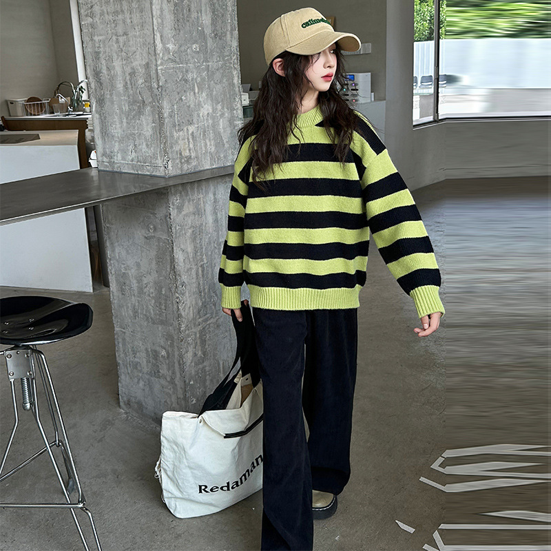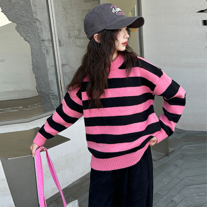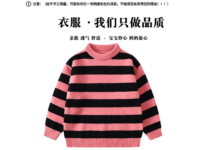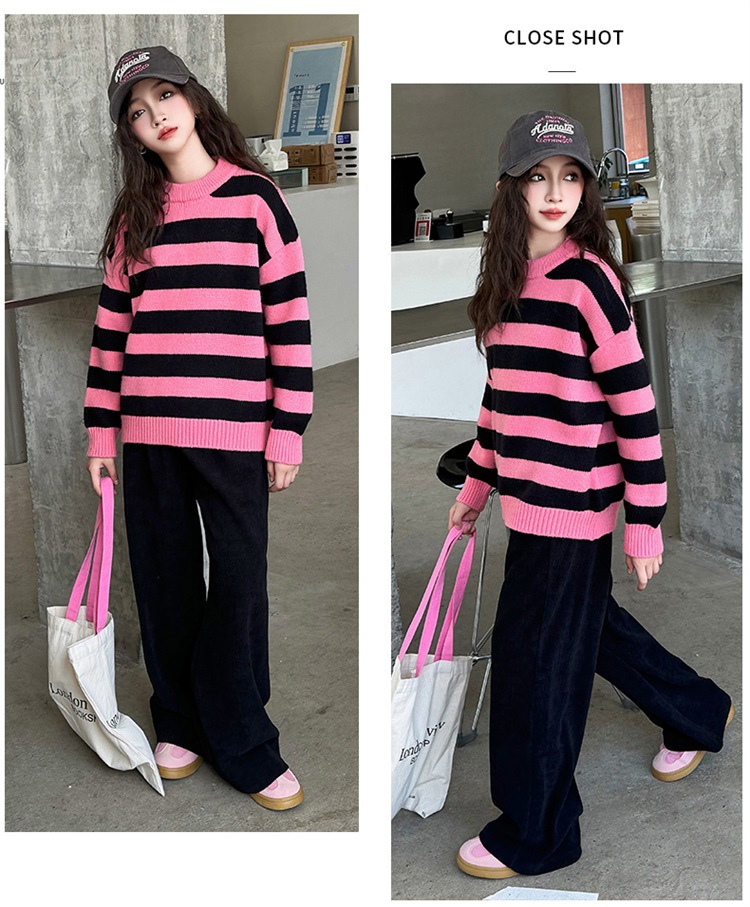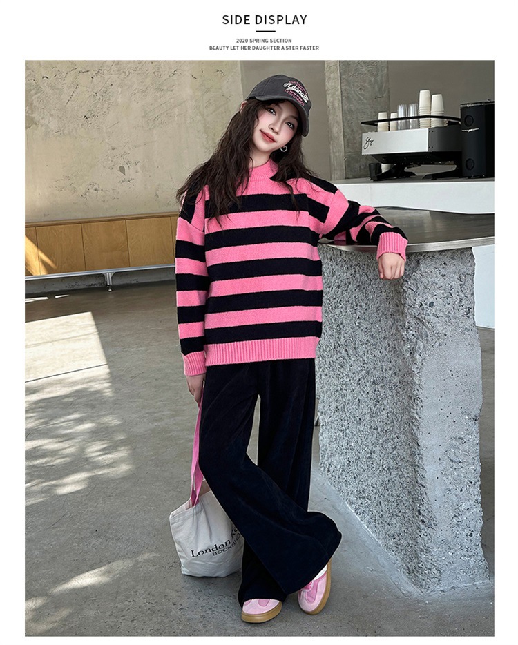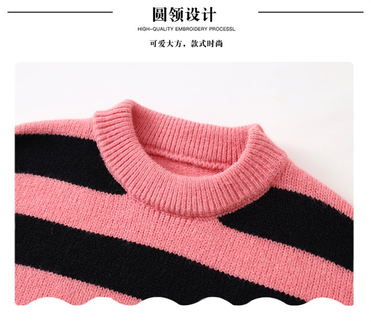 소녀 스웨터 가을과 겨울 2024 새로운 큐크 어린이 핑크 블랙 컬러 매칭 스트라이프 스웨터 크루 넥 풀오버 스웨터스토어 가기