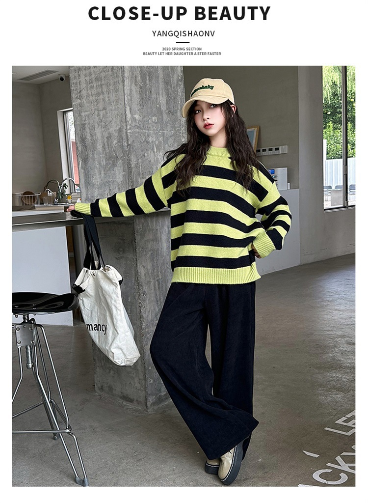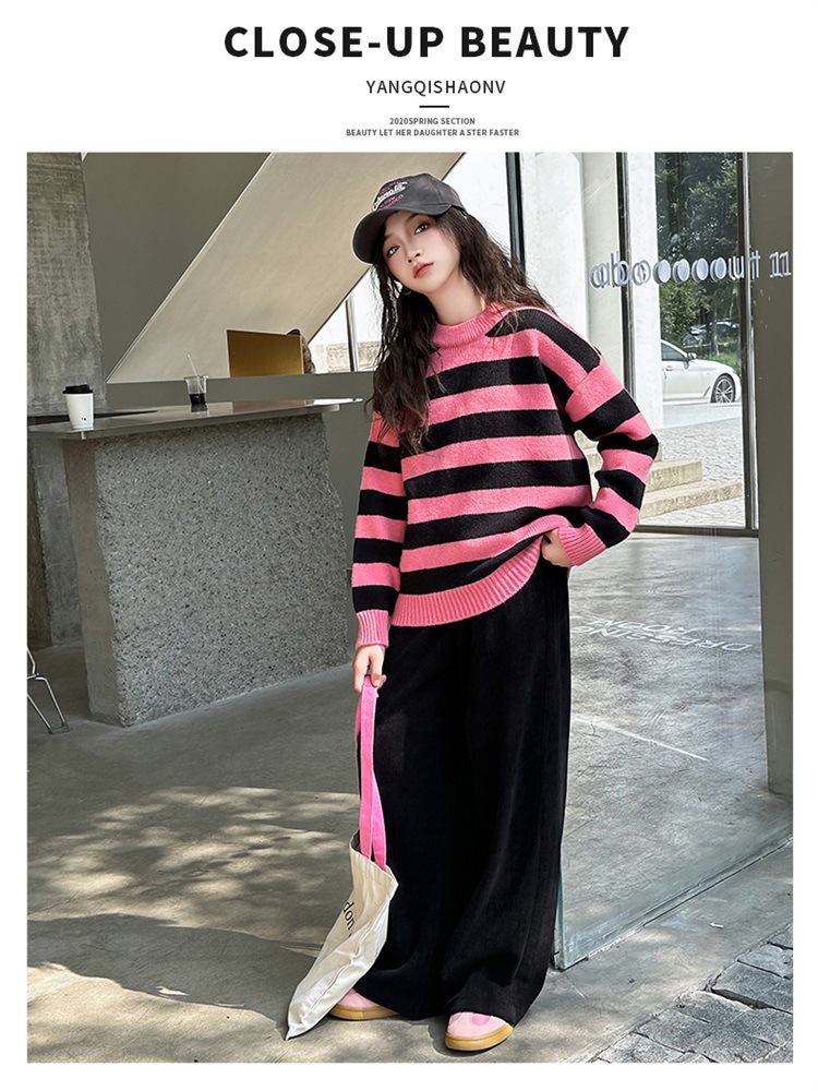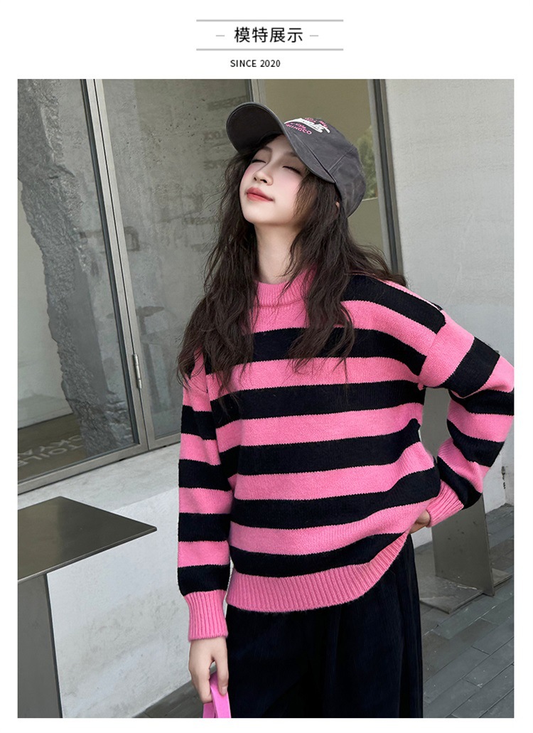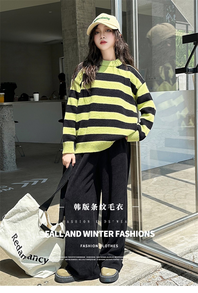 소녀 스웨터 가을과 겨울 2024 새로운 큐크 어린이 핑크 블랙 컬러 매칭 스트라이프 스웨터 크루 넥 풀오버 스웨터스토어 가기