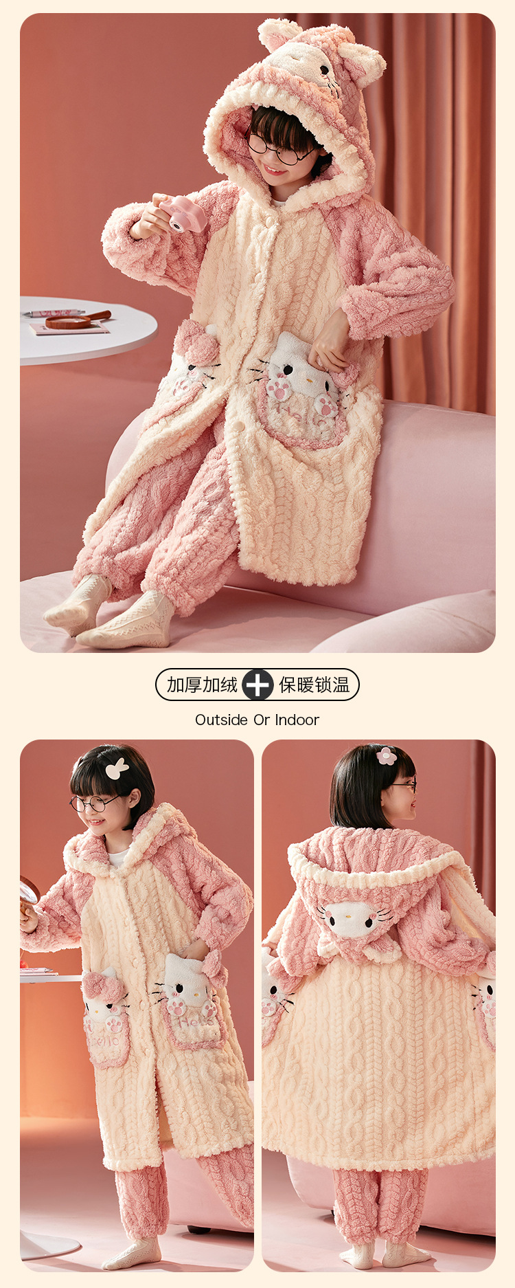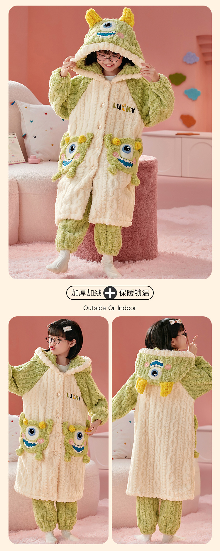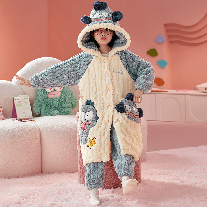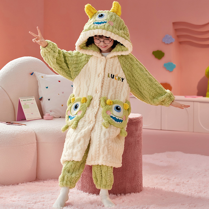 2024 년 새 소녀 잠옷 가을과 겨울 기모 두꺼운 산호 양털 어린이 잠옷 긴 소녀 세트 겨울 스타일스토어 가기