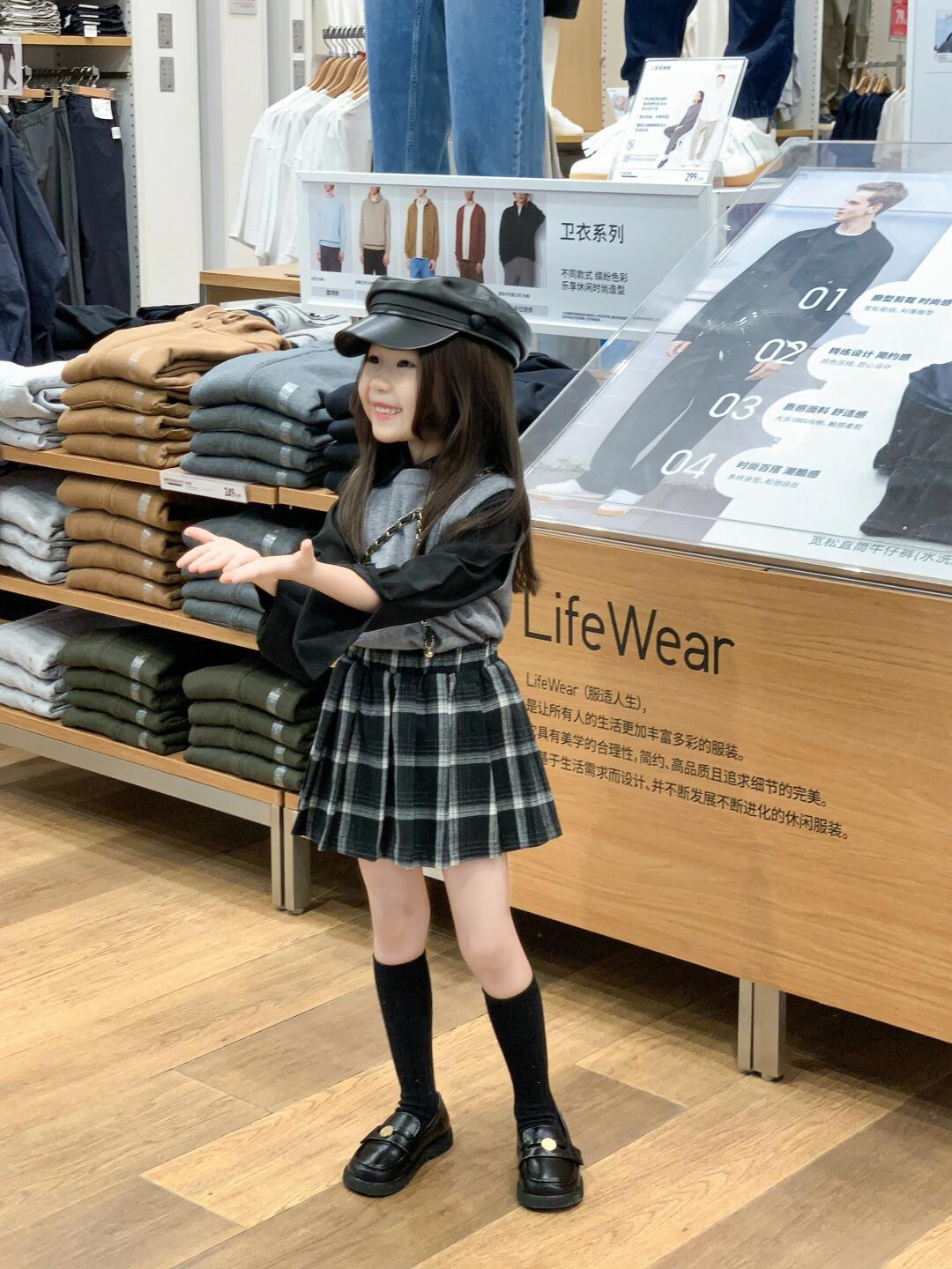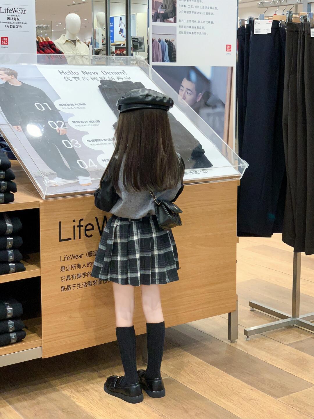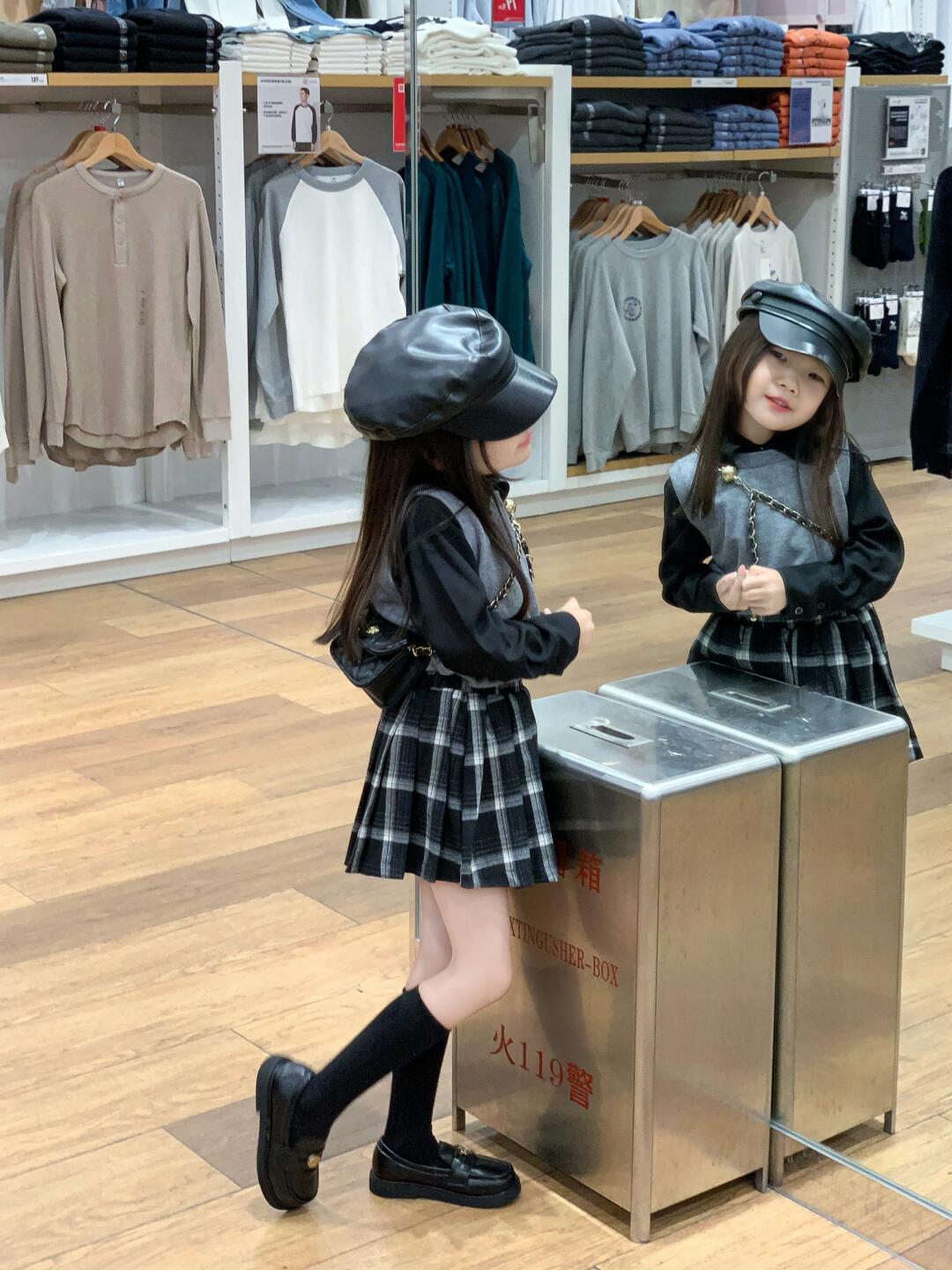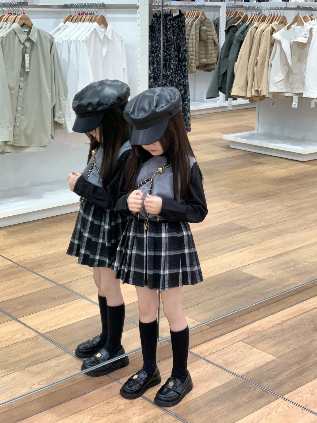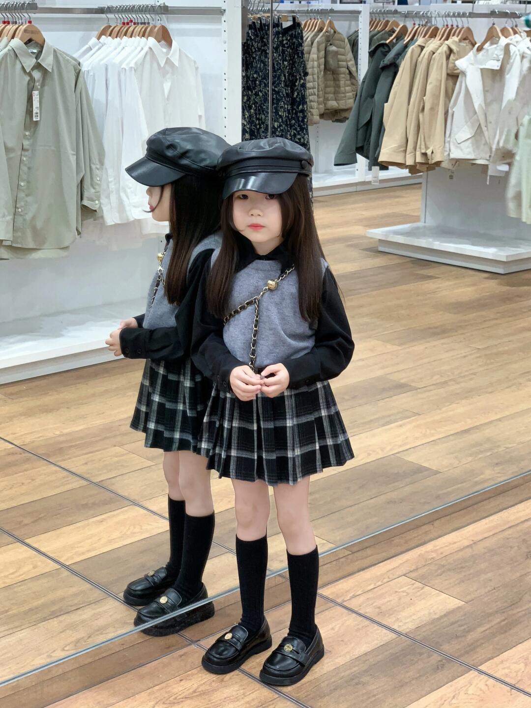 소녀 가을 착용 한국 회색 니트 조끼 부드러운 검은 셔츠 흑백 짧은 치마 안전 스커트 싱글 비트스토어 가기