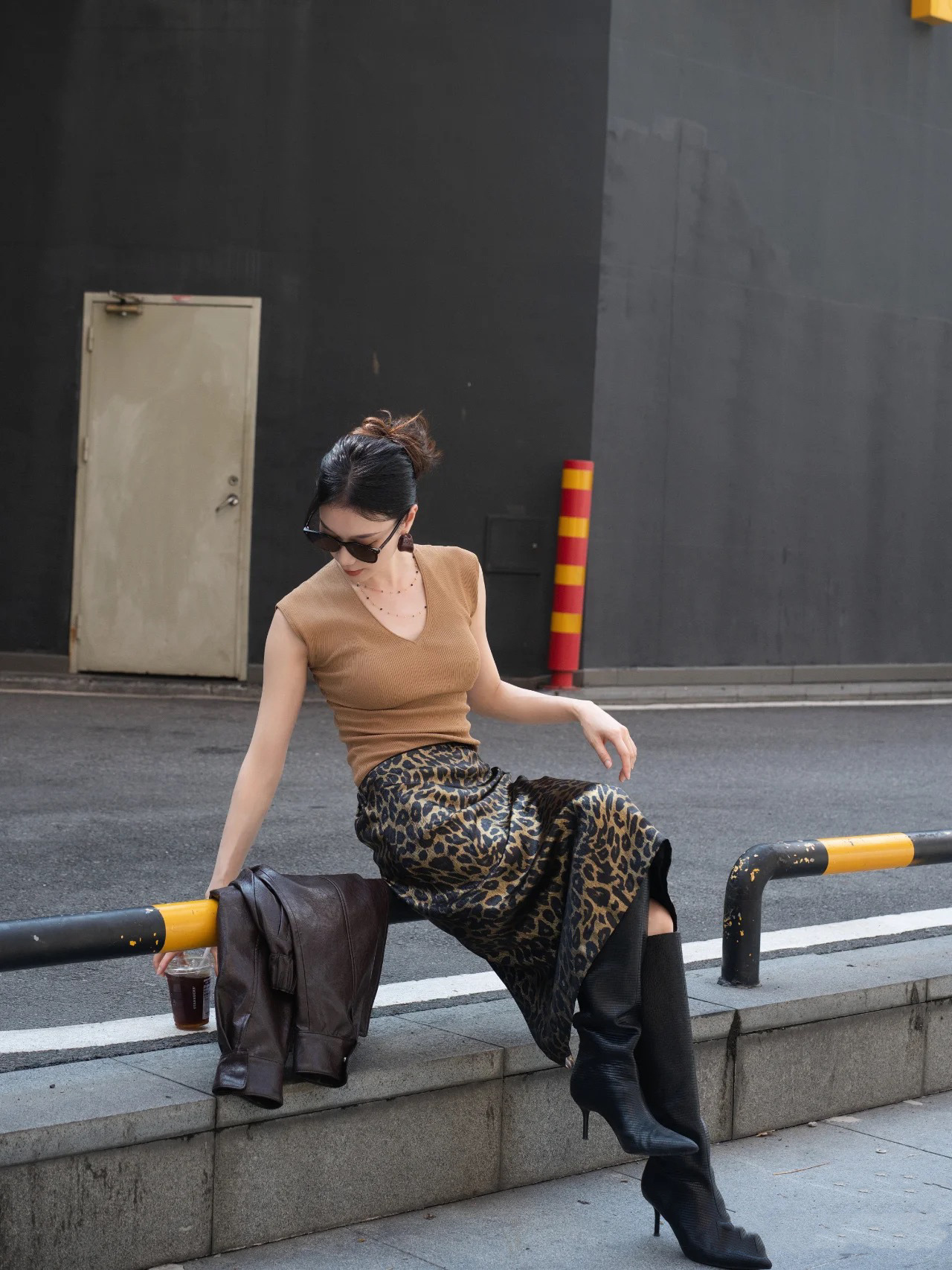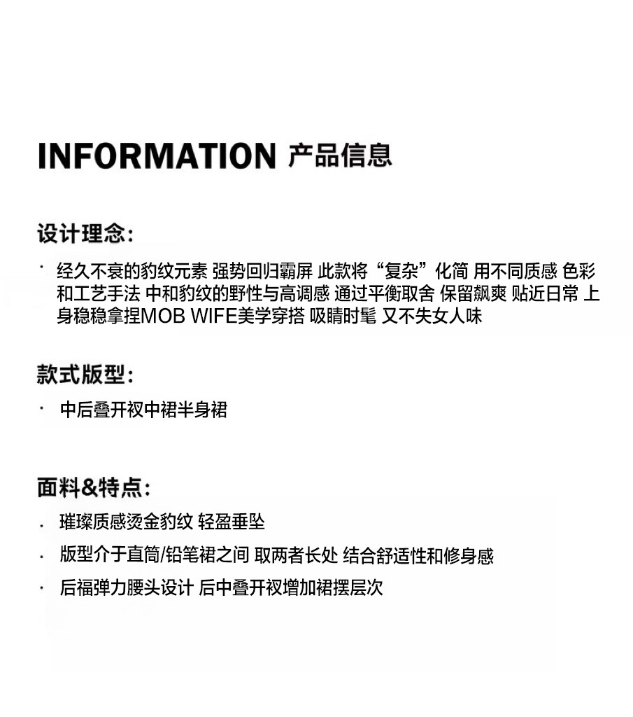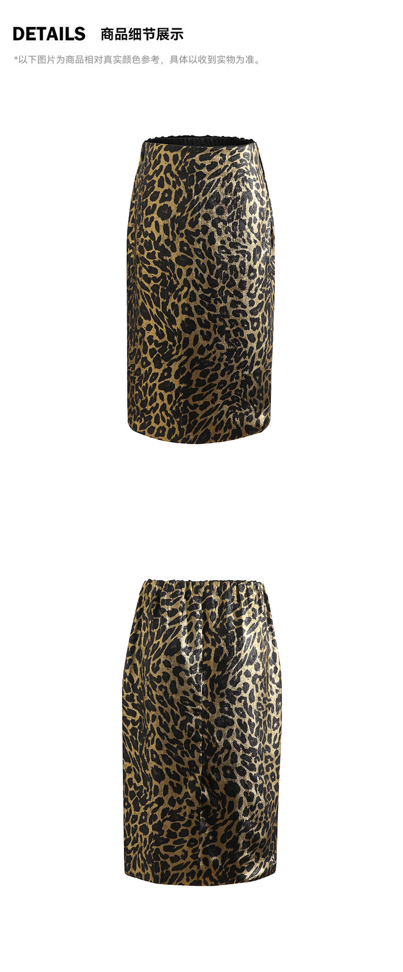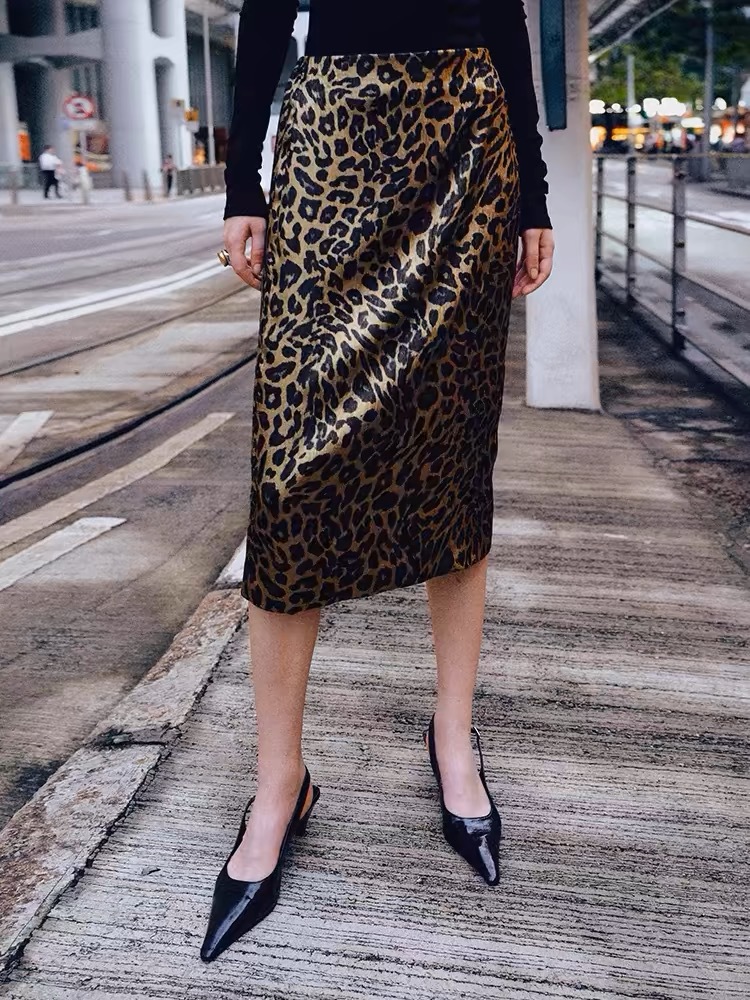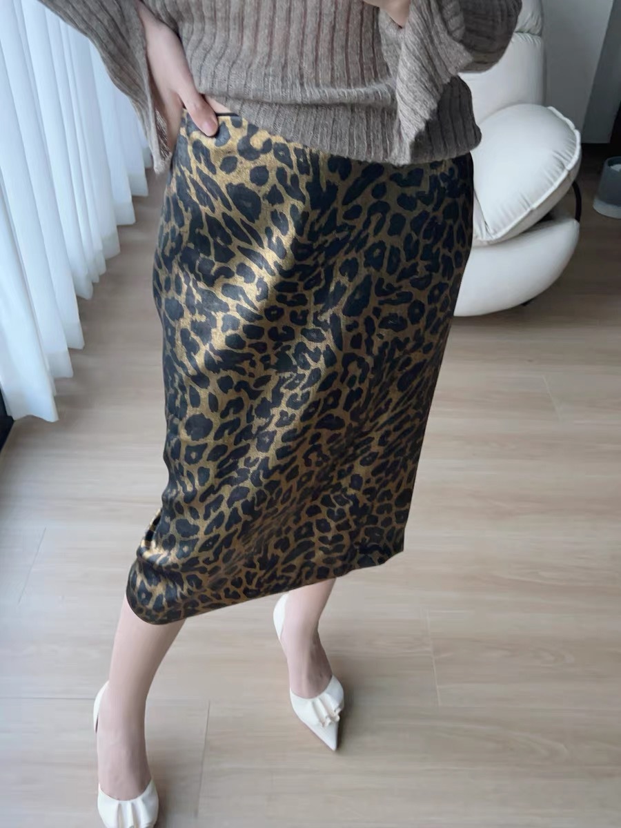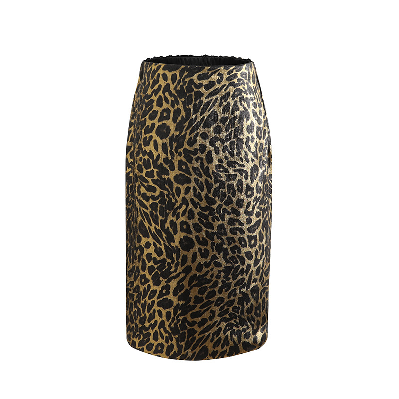 가을 출퇴근용 고급스러운 화려한 금박 레오파드 프린트 슬림하고 키가 보이는 스트레이트 마이크로 테이퍼드 슬릿 미디 스커트 4231