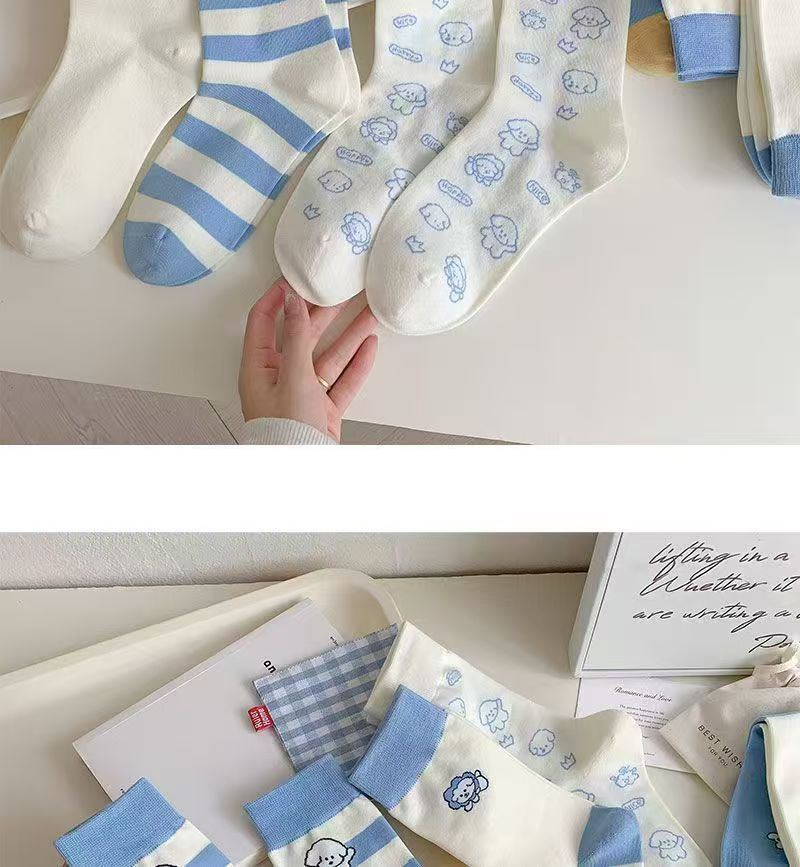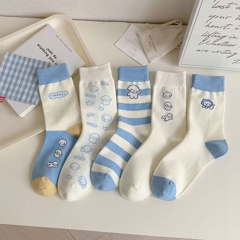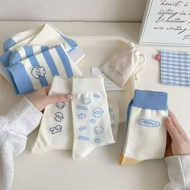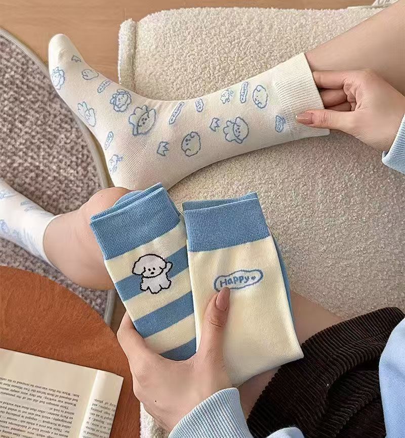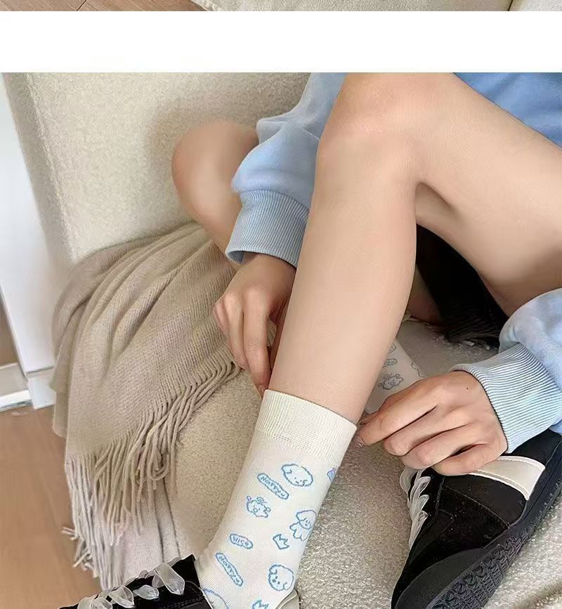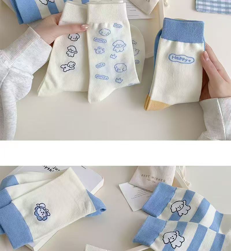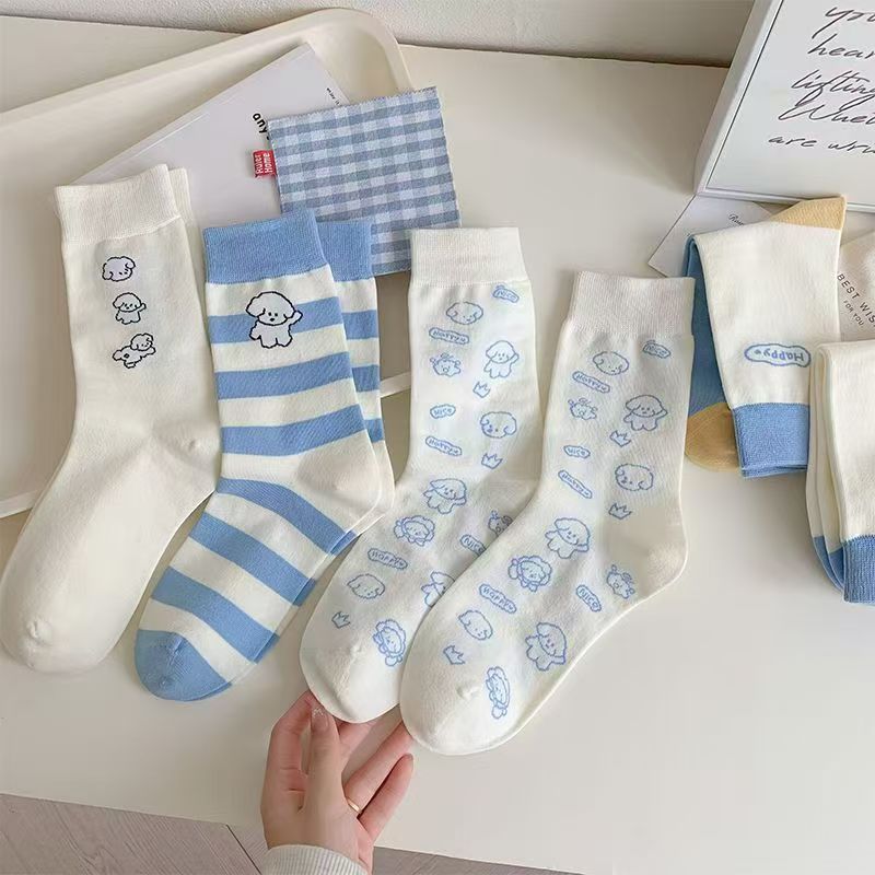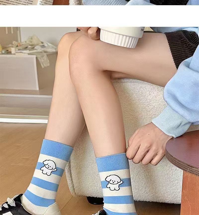 귀여운 만화 강아지 양말 여자 중간 배럴 한국 스타일 올 매치 가을 겨울 일본 스타일 파란색과 흰색 유행 양말 뼈없는 긴스토어 가기