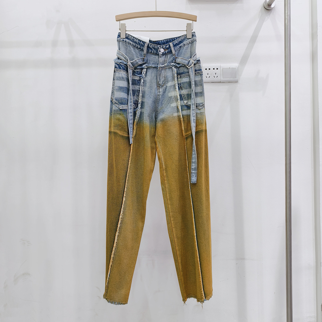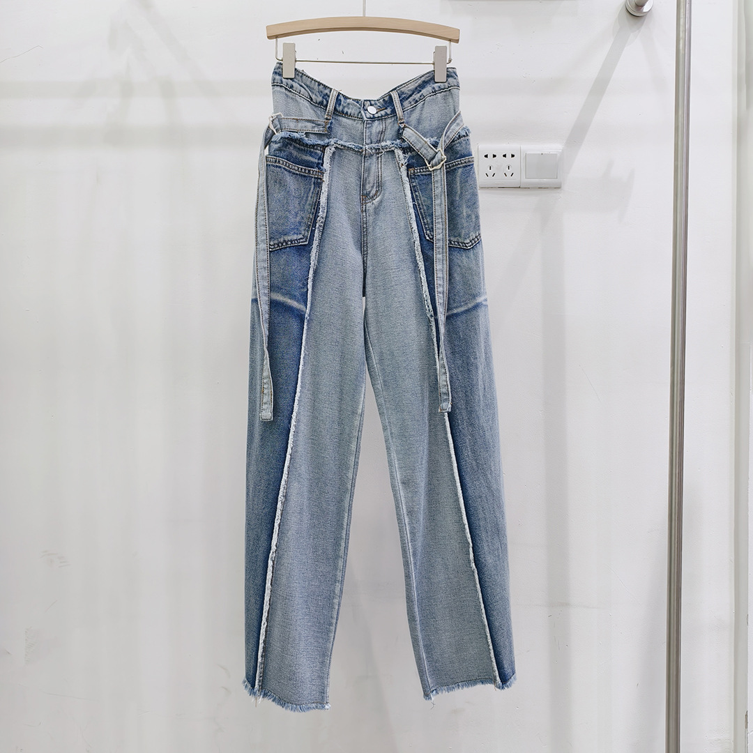 미국 스타일 스티칭 그라디언트 녹 청바지 여성의 봄과 가을 디자인 센스 넓은 다리 바지 슬리밍 느슨한 직선 다리 바지스토어 가기