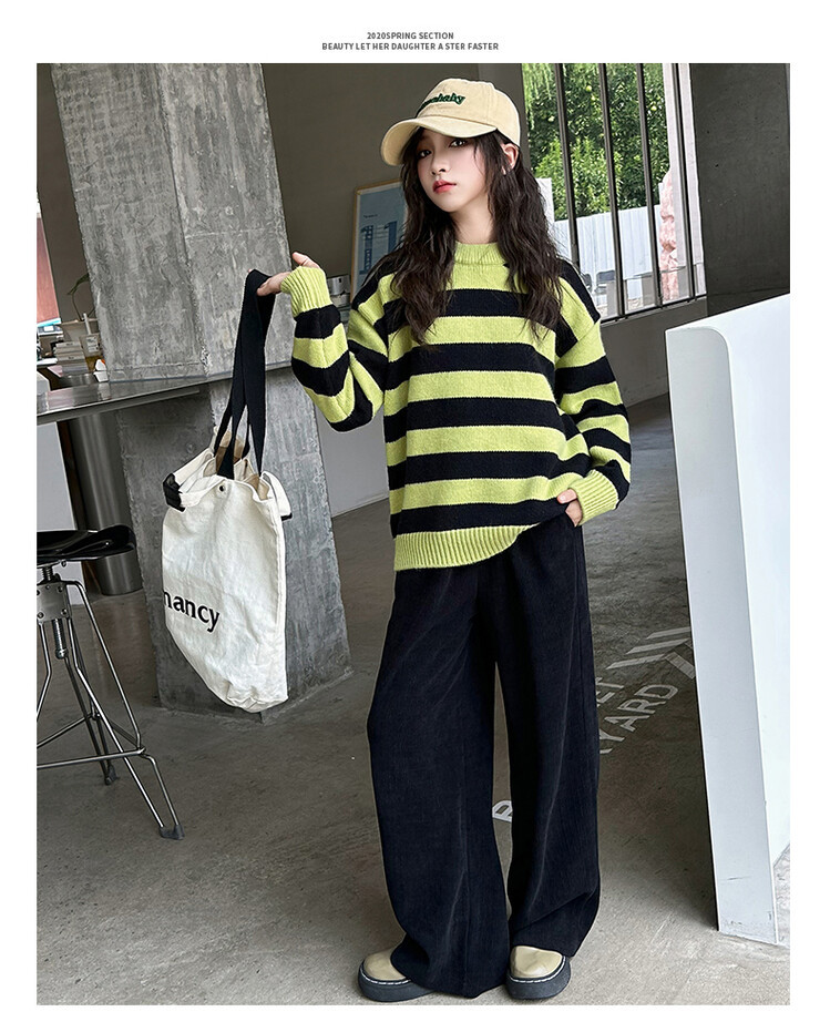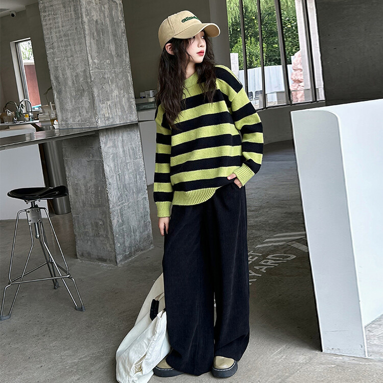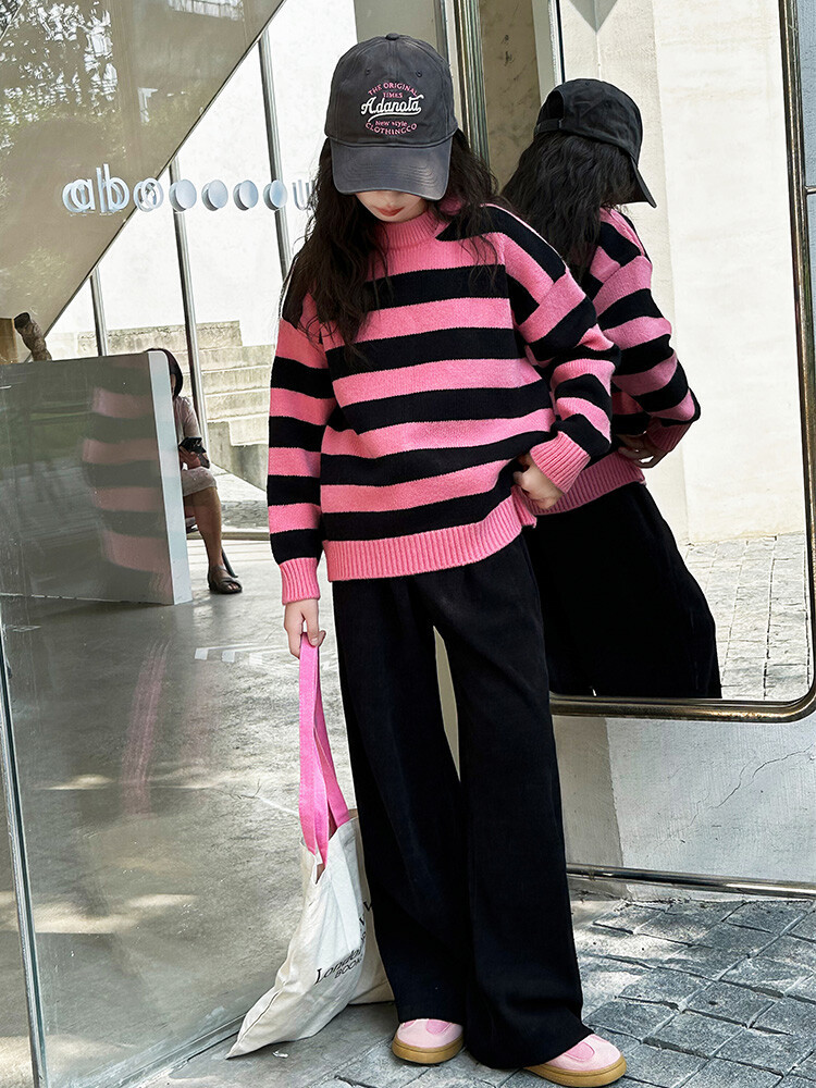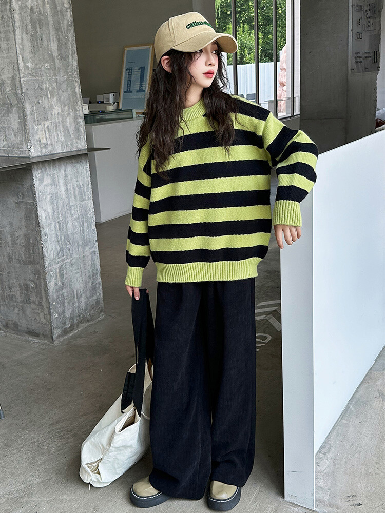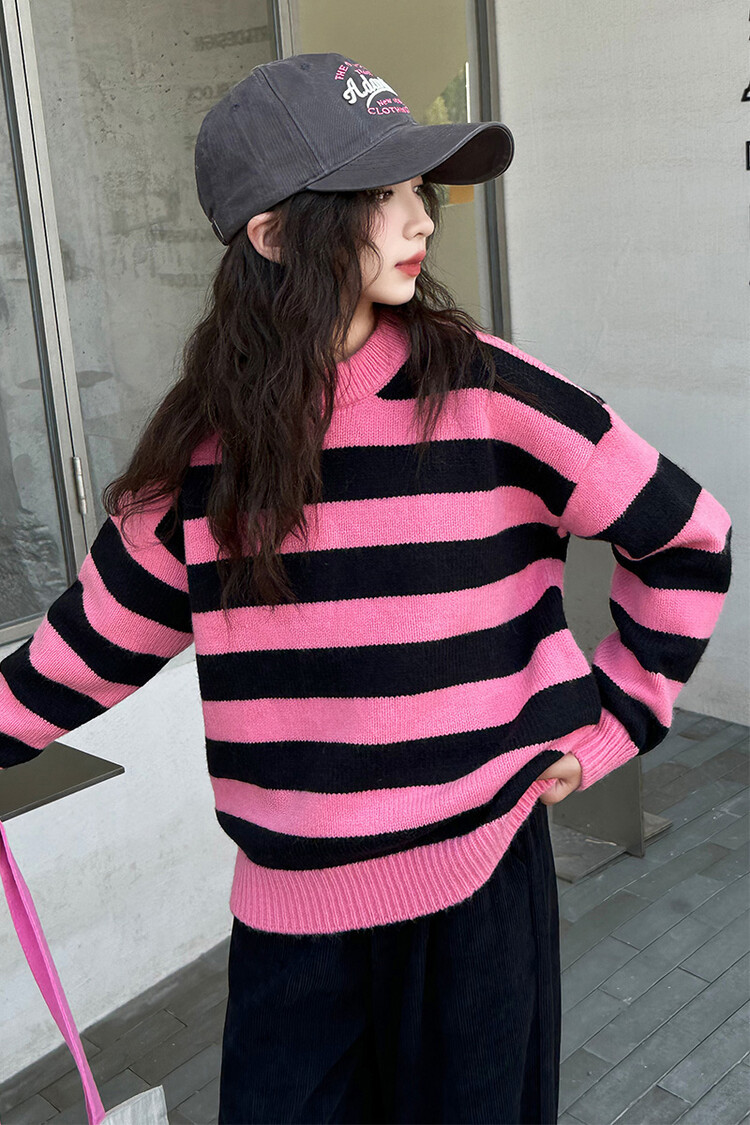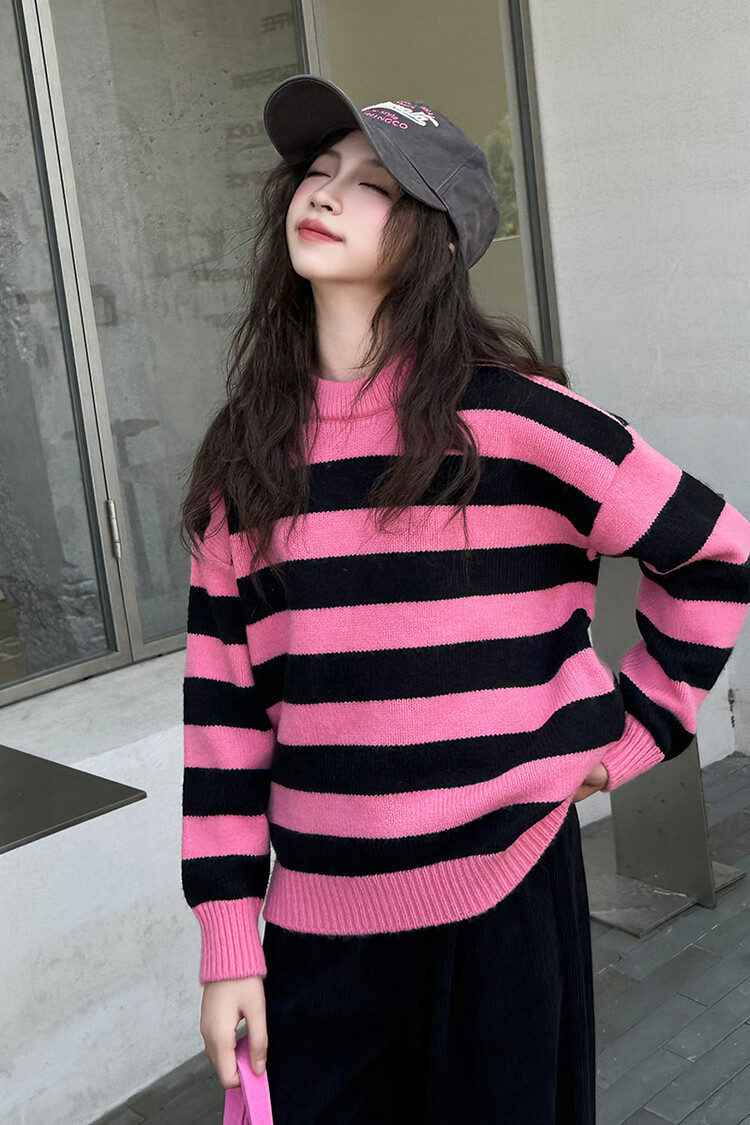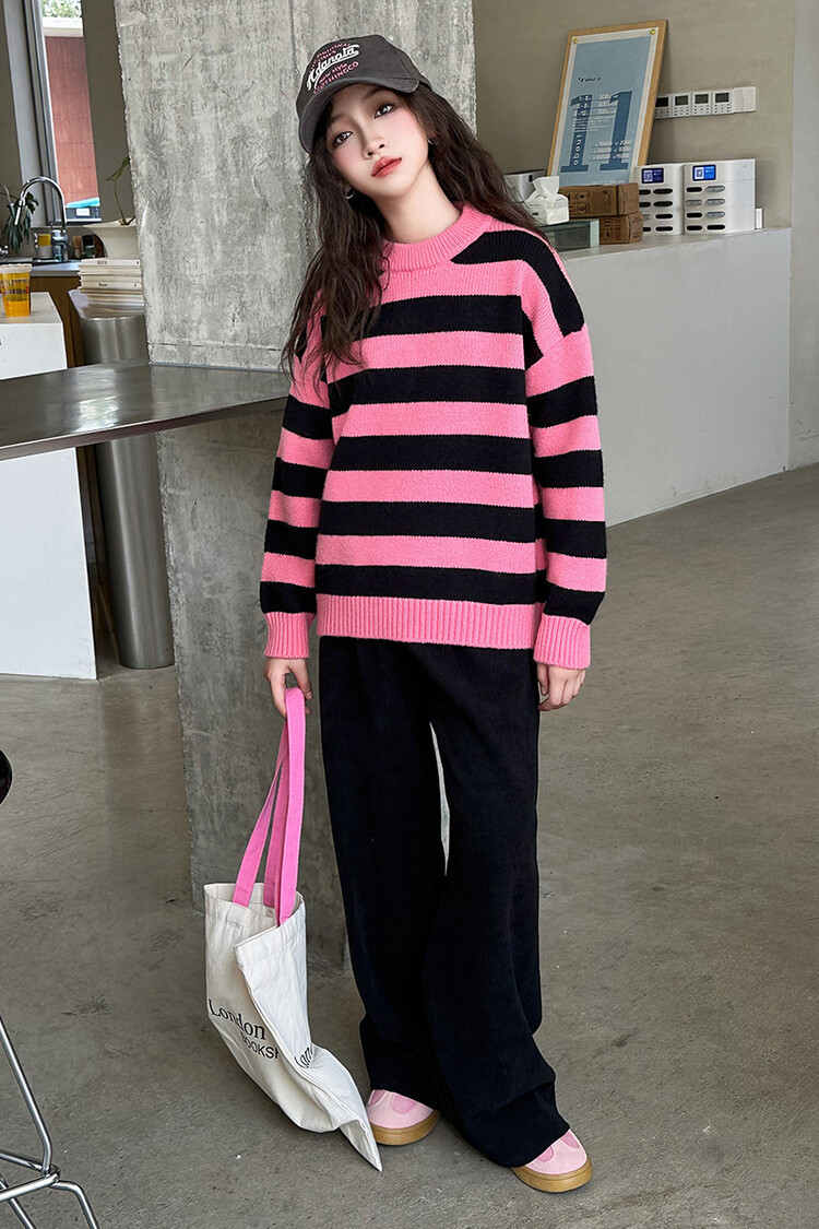 콘트라스트 컬러 스티칭 스트라이프 크루 넥 스웨터 소녀 가을과 겨울 24 새로운 한국 스타일 젠틀 스타일 레트로 니트 풀오버 탑