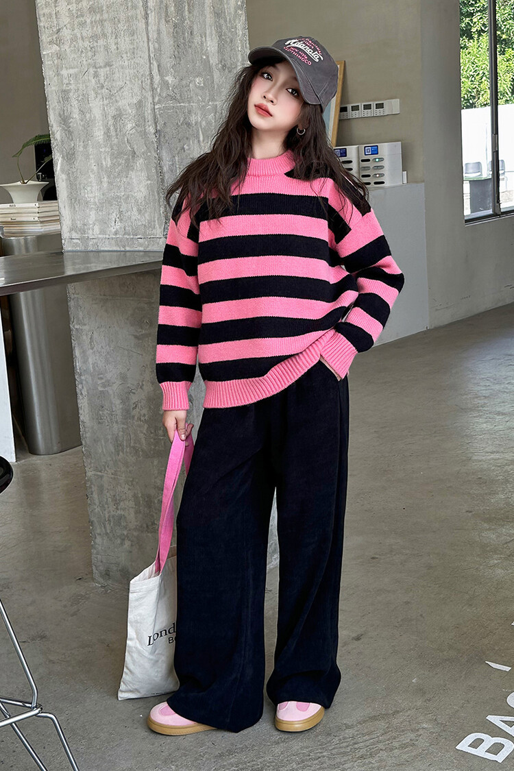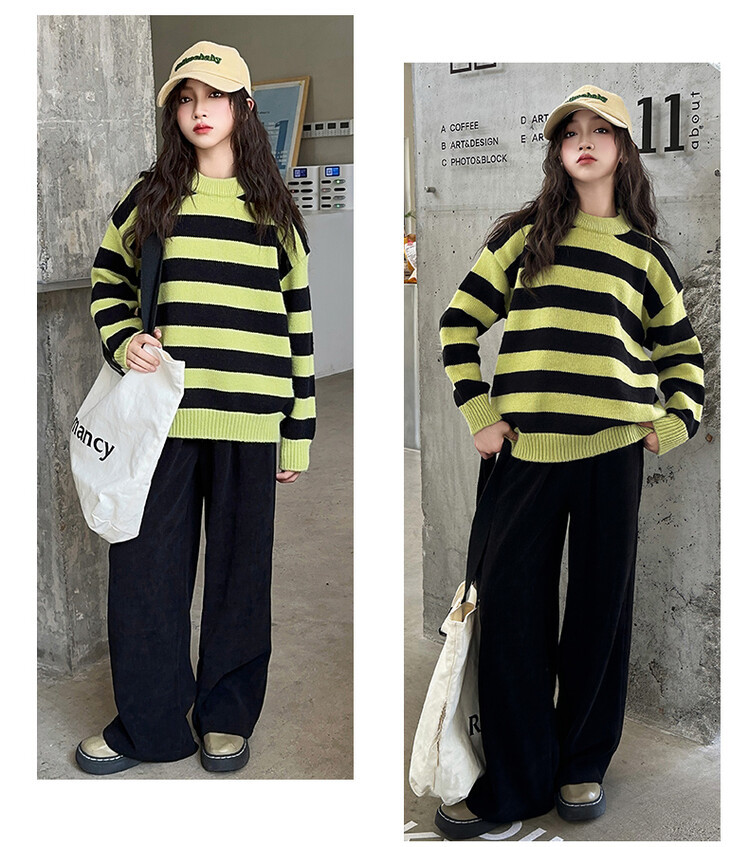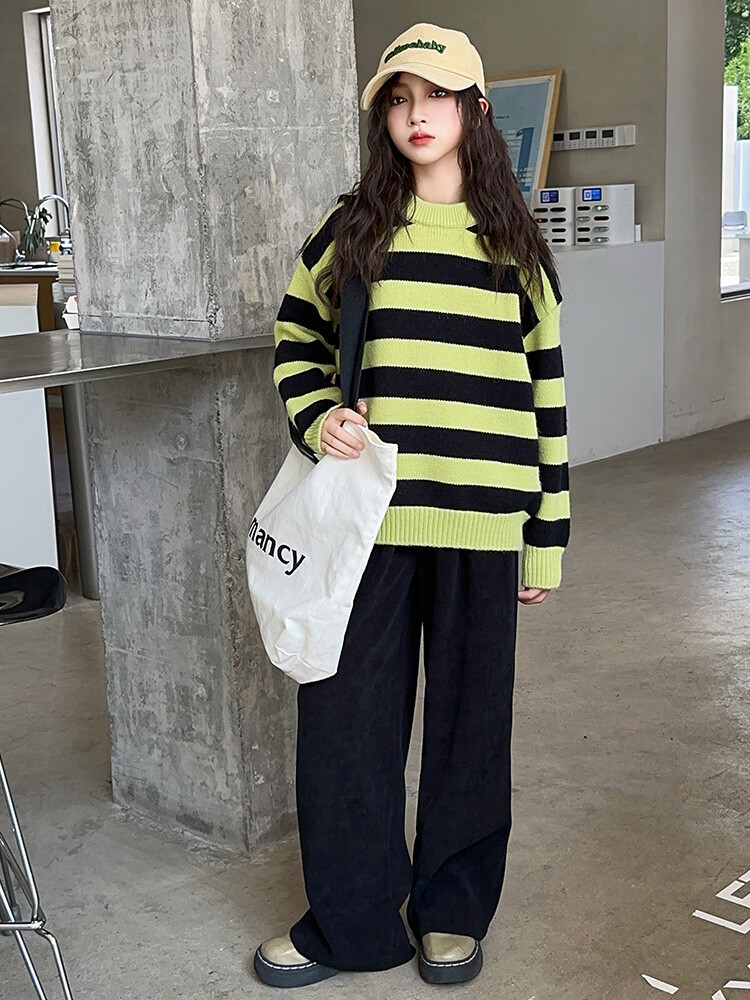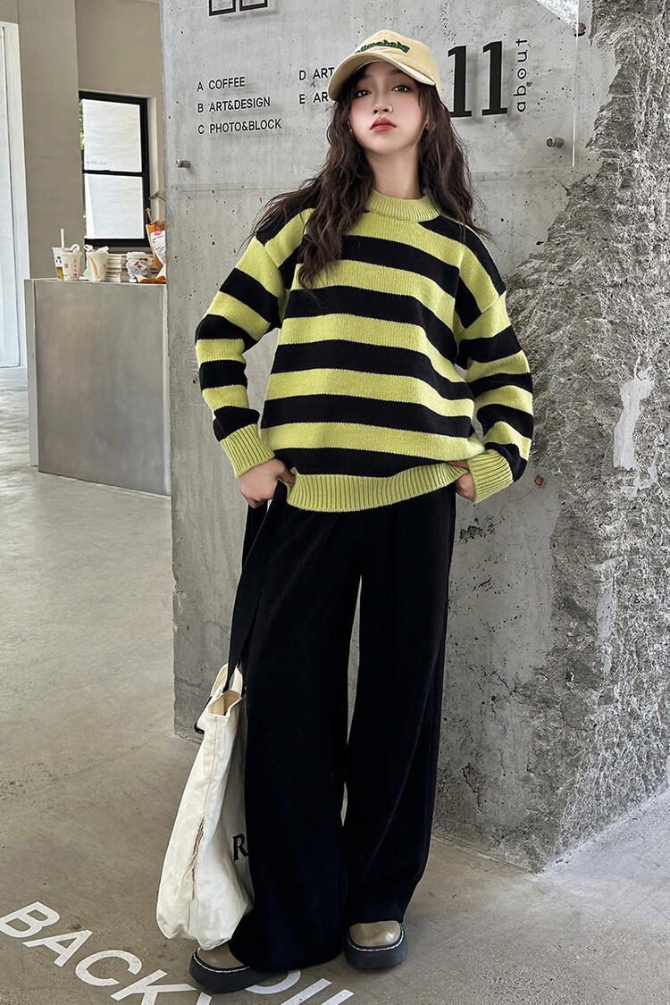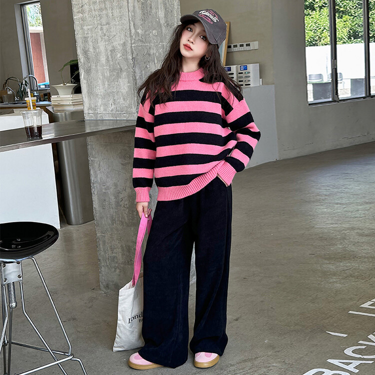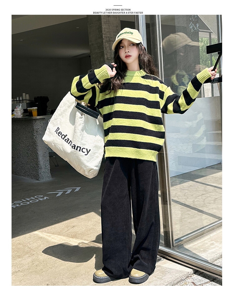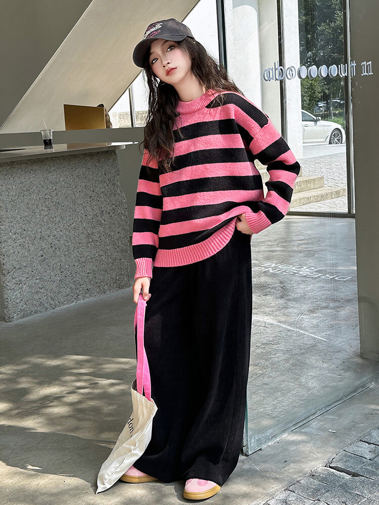 콘트라스트 컬러 스티칭 스트라이프 크루 넥 스웨터 소녀 가을과 겨울 24 새로운 한국 스타일 젠틀 스타일 레트로 니트 풀오버 탑