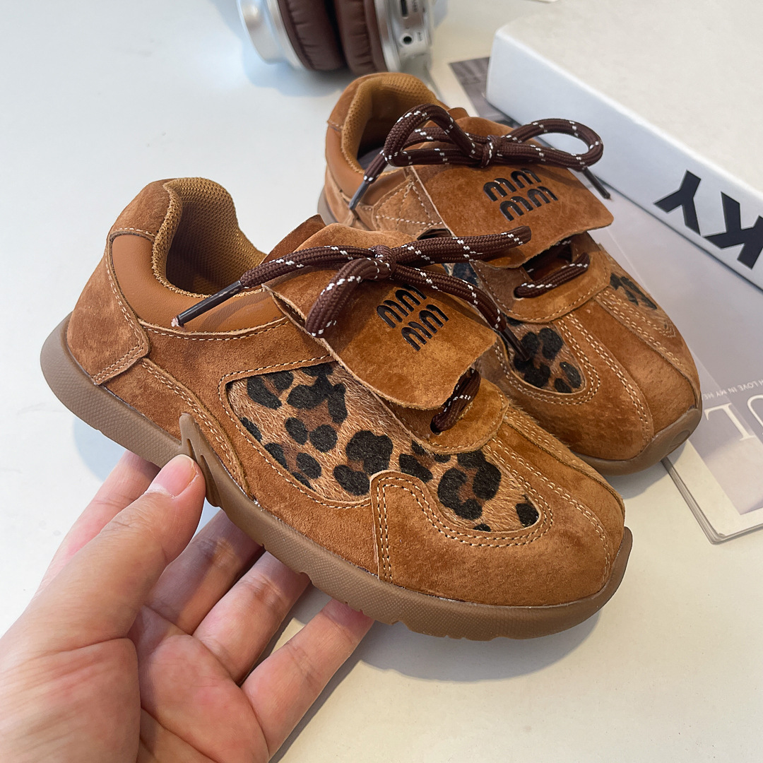 어린이 레오파드 프린트 데훈 신발 2024 가을 겨울 천연 가죽 여아 아가니 신발 캐주얼 남아 운동화 캐주얼 패션