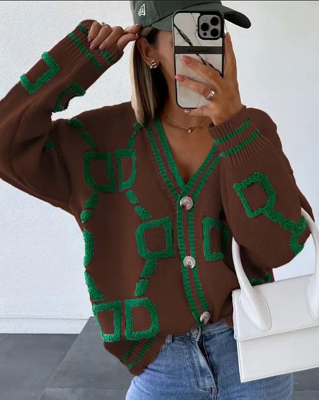 국경 간 대외 무역 편지 타월 자수 니트 봄과 가을 새 카디건 최고 여성 느슨한 V 넥 스웨터 코트 여성