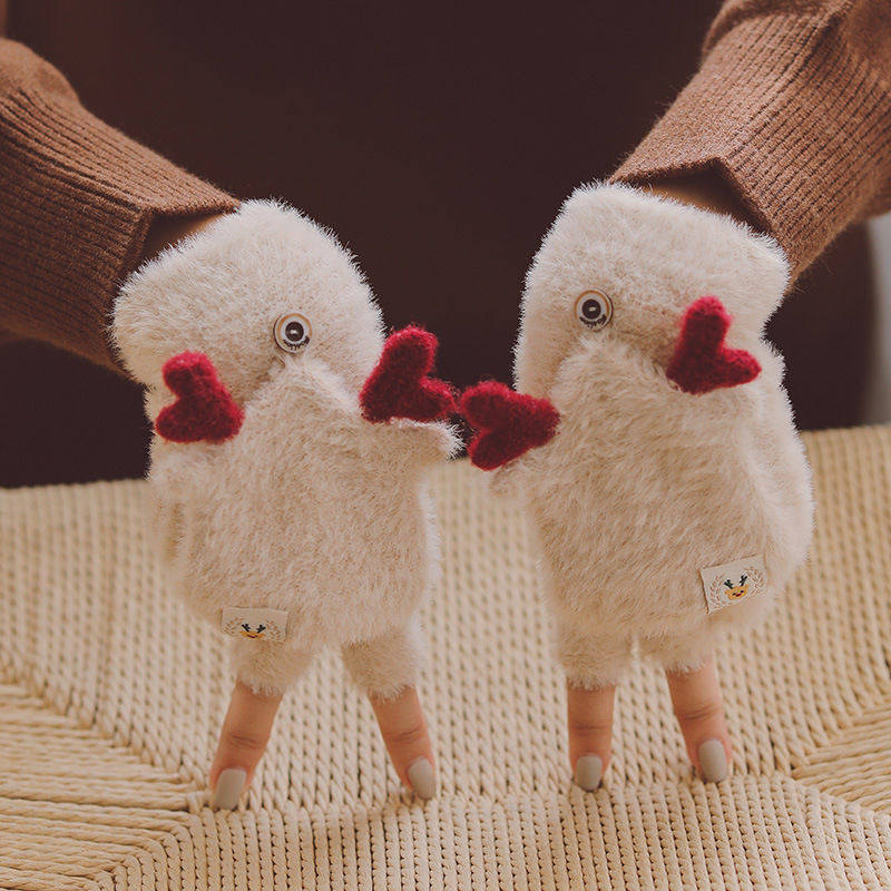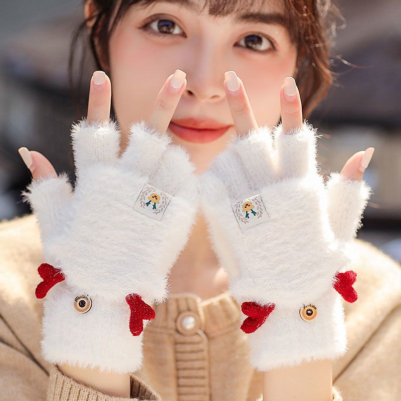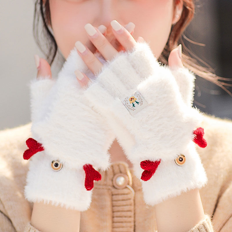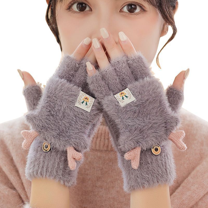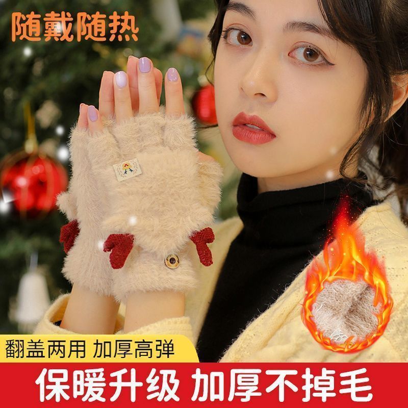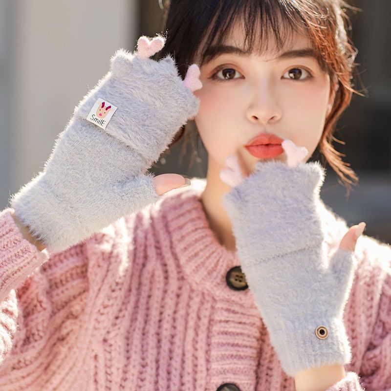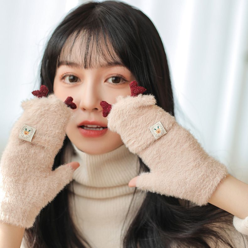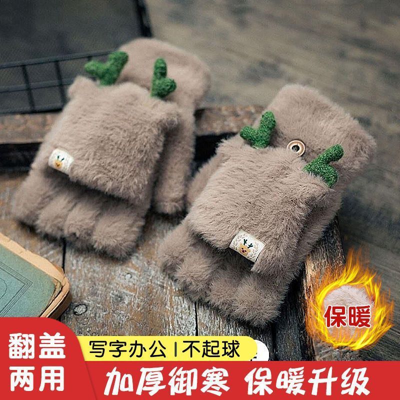 겨울 여성의 귀여운 앤틀러 기모 한국식 학생 큰 어린이 봉제 양모 따뜻한 방한 하프 핑거 플립 커버 장갑