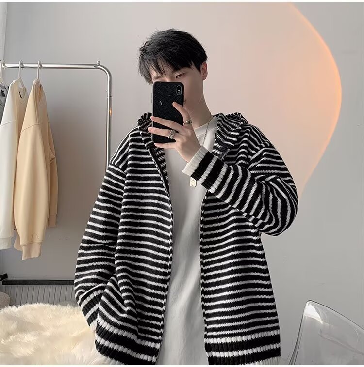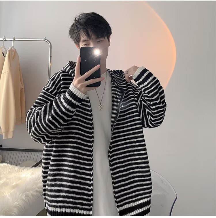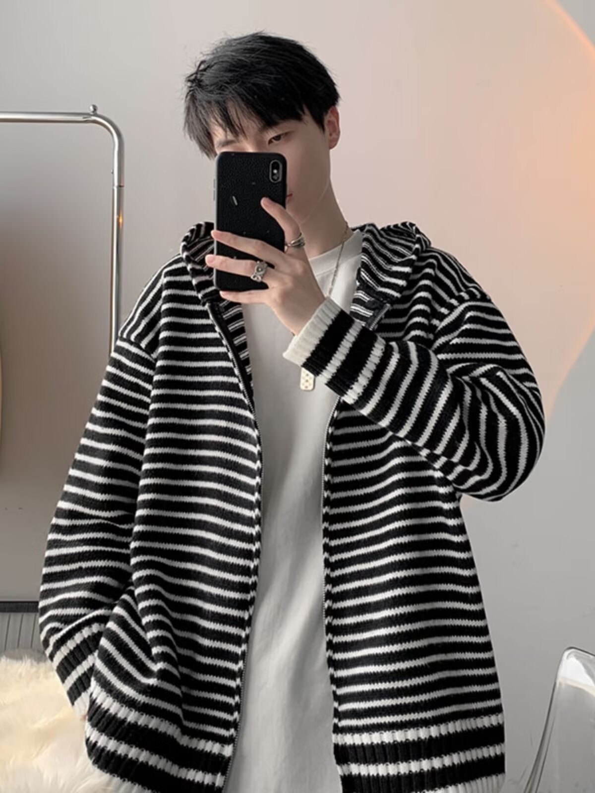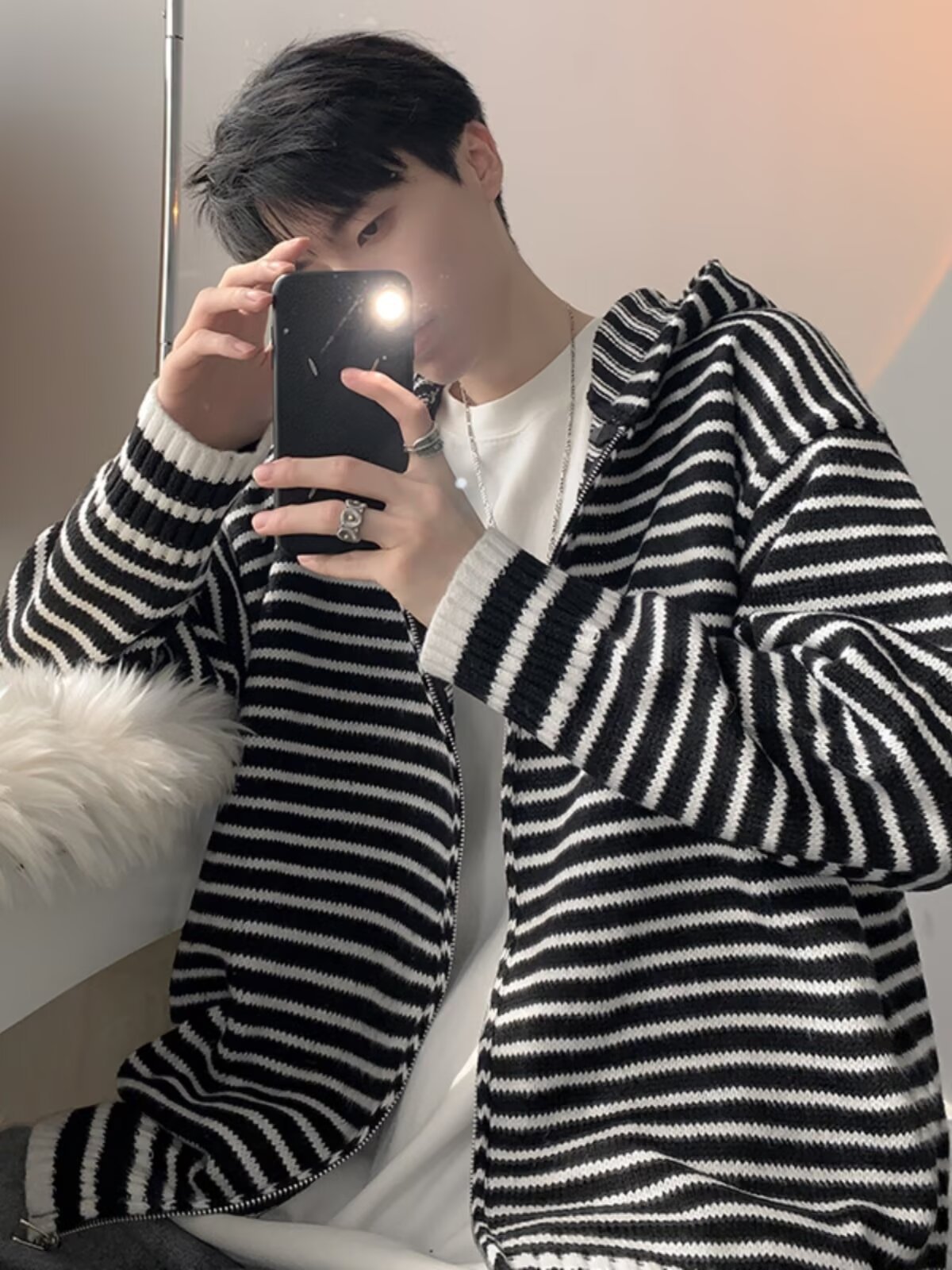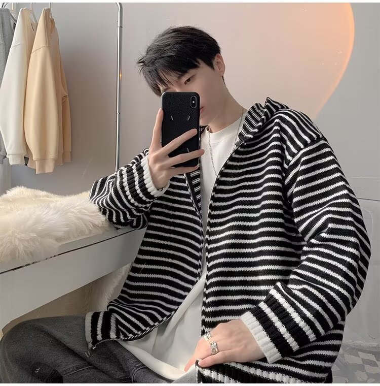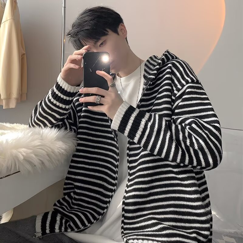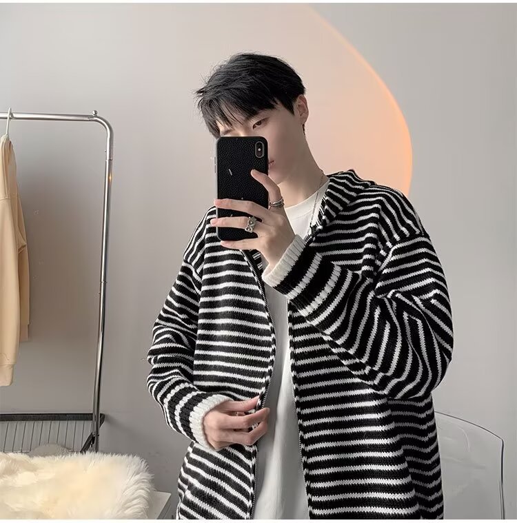 패션 콘트라스트 컬러 스트라이프 후드 스웨터 남자의 가을과 겨울 2024 새로운 느슨한 니트 카디건 지퍼 코트 탑스토어 가기
