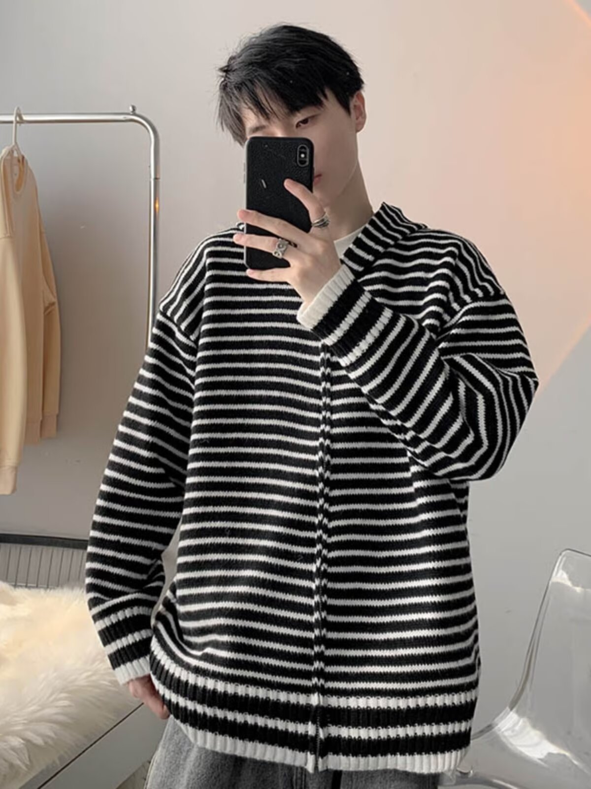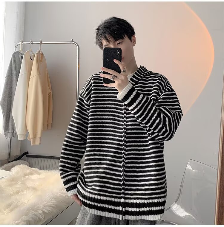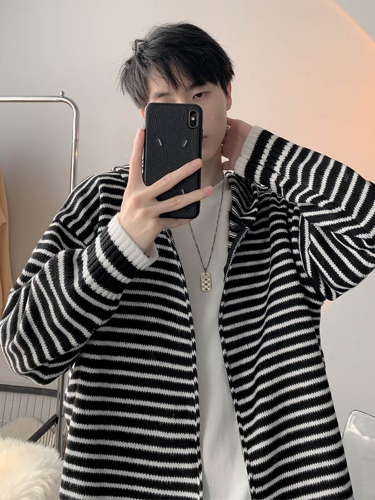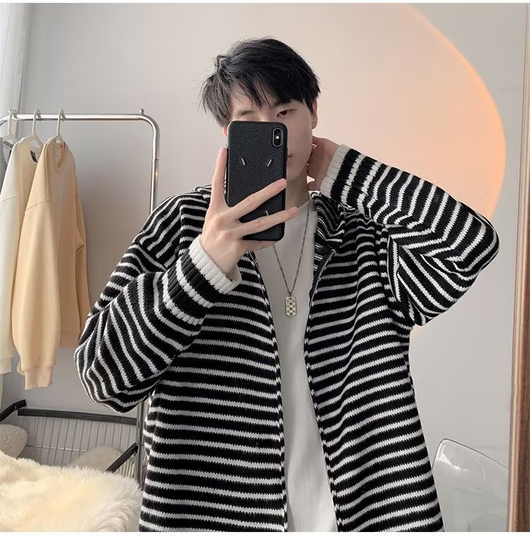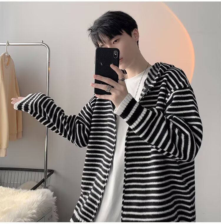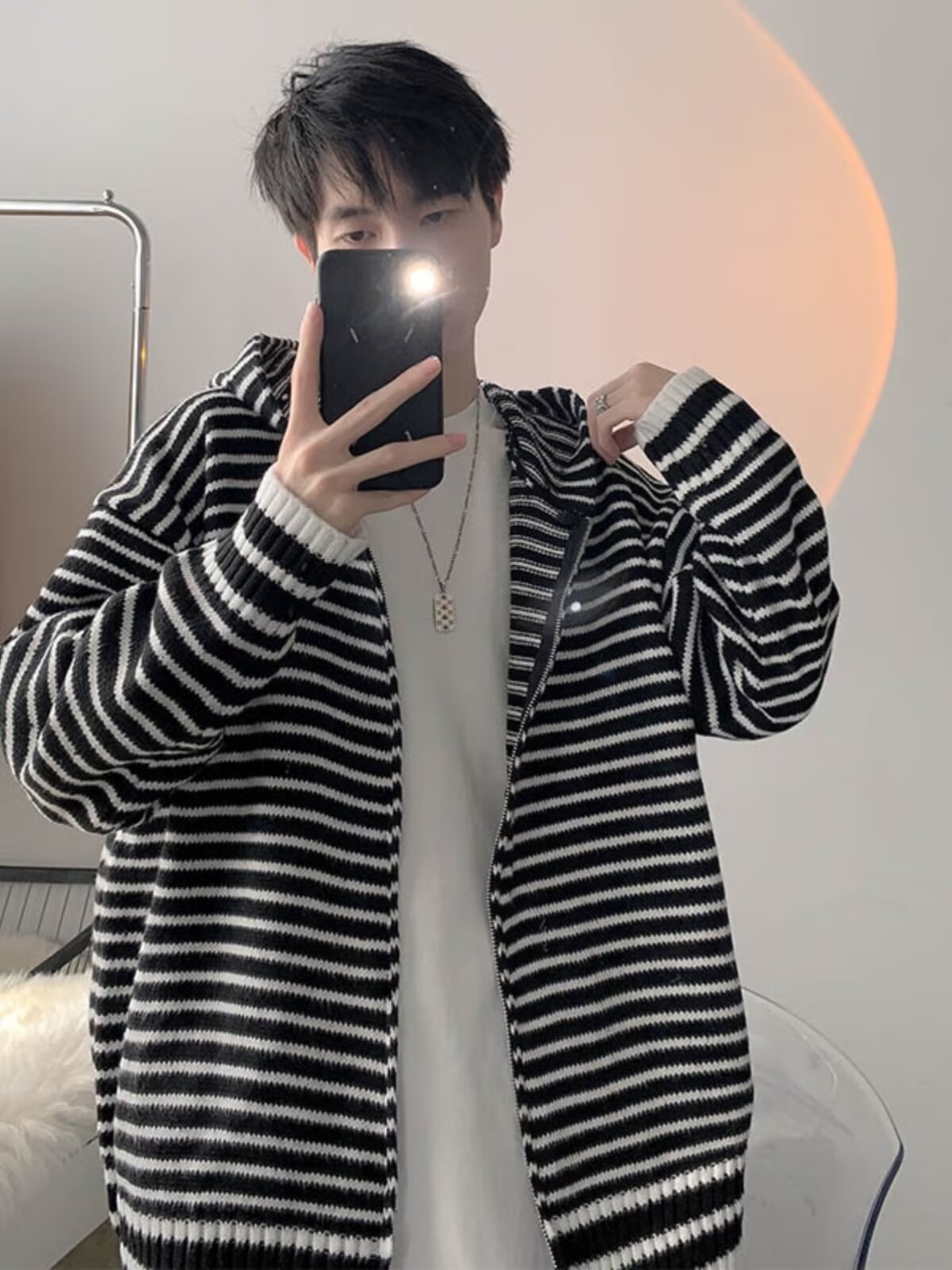 패션 콘트라스트 컬러 스트라이프 후드 스웨터 남자의 가을과 겨울 2024 새로운 느슨한 니트 카디건 지퍼 코트 탑스토어 가기