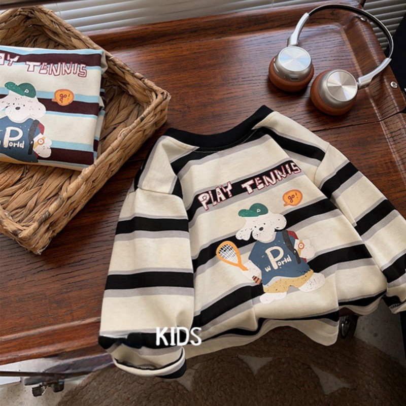 재고 있음, 즉시 배송 가능! 가을 신상 한국 스트라이프 귀여운 만화 프린트 라운드넥 밑단 티셔츠, 활용도 높은 트렌디 탑스토어 가기