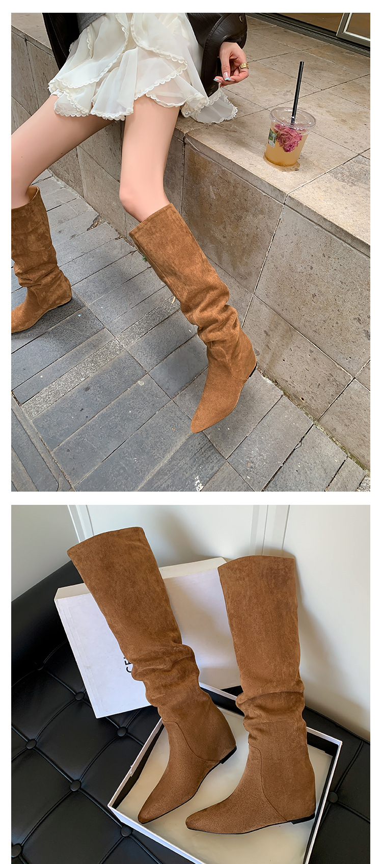 길고 높은 6cm ~ 작은 뾰족한 높이 Maillard 부츠 스웨이드 넓은 파일 부츠 이른 가을 부츠 여성