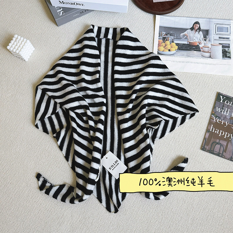 • [순모 100% 트라이앵글 스카프] 스트라이프 블랙 앤 화이트