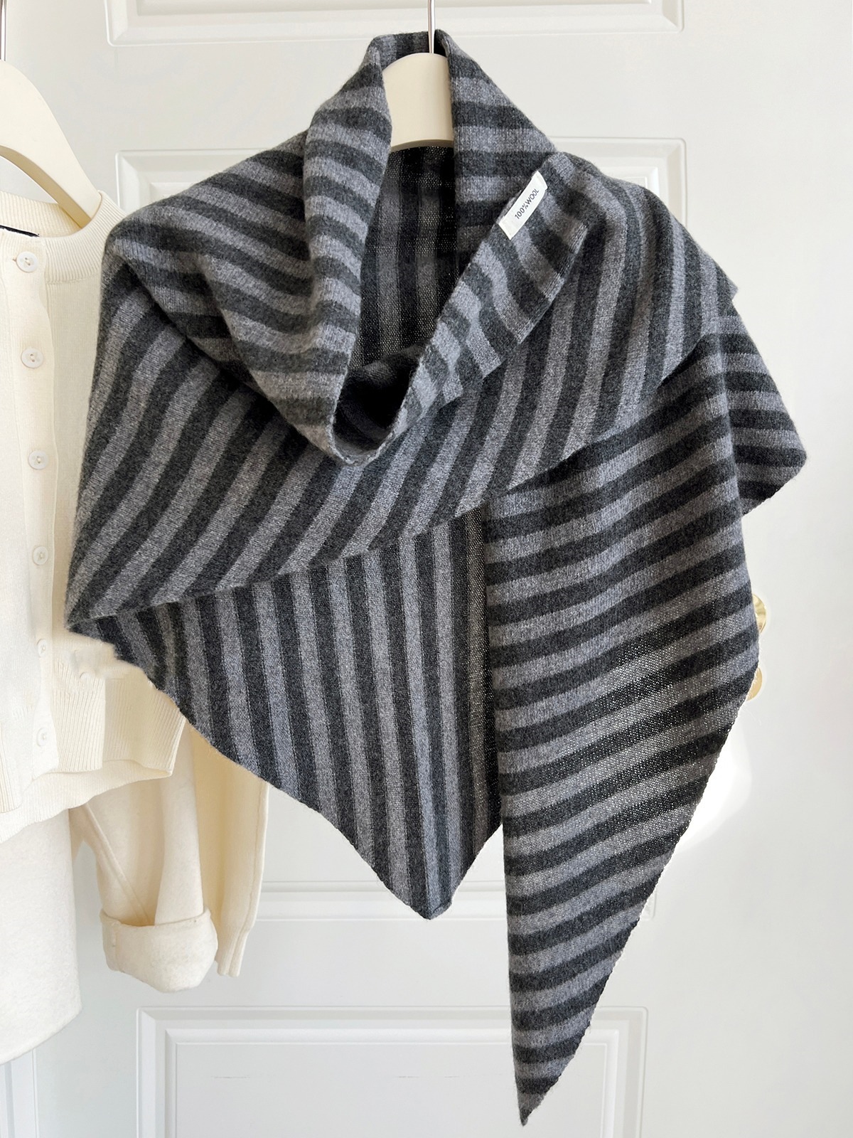 • [순수 울 100% 트라이앵글 스카프] 다크 그레이 스트라이프